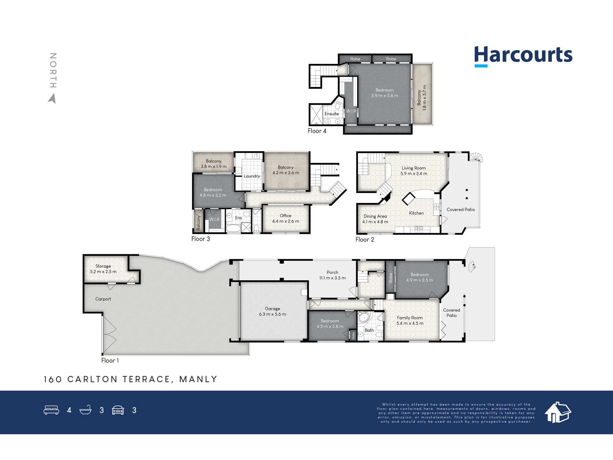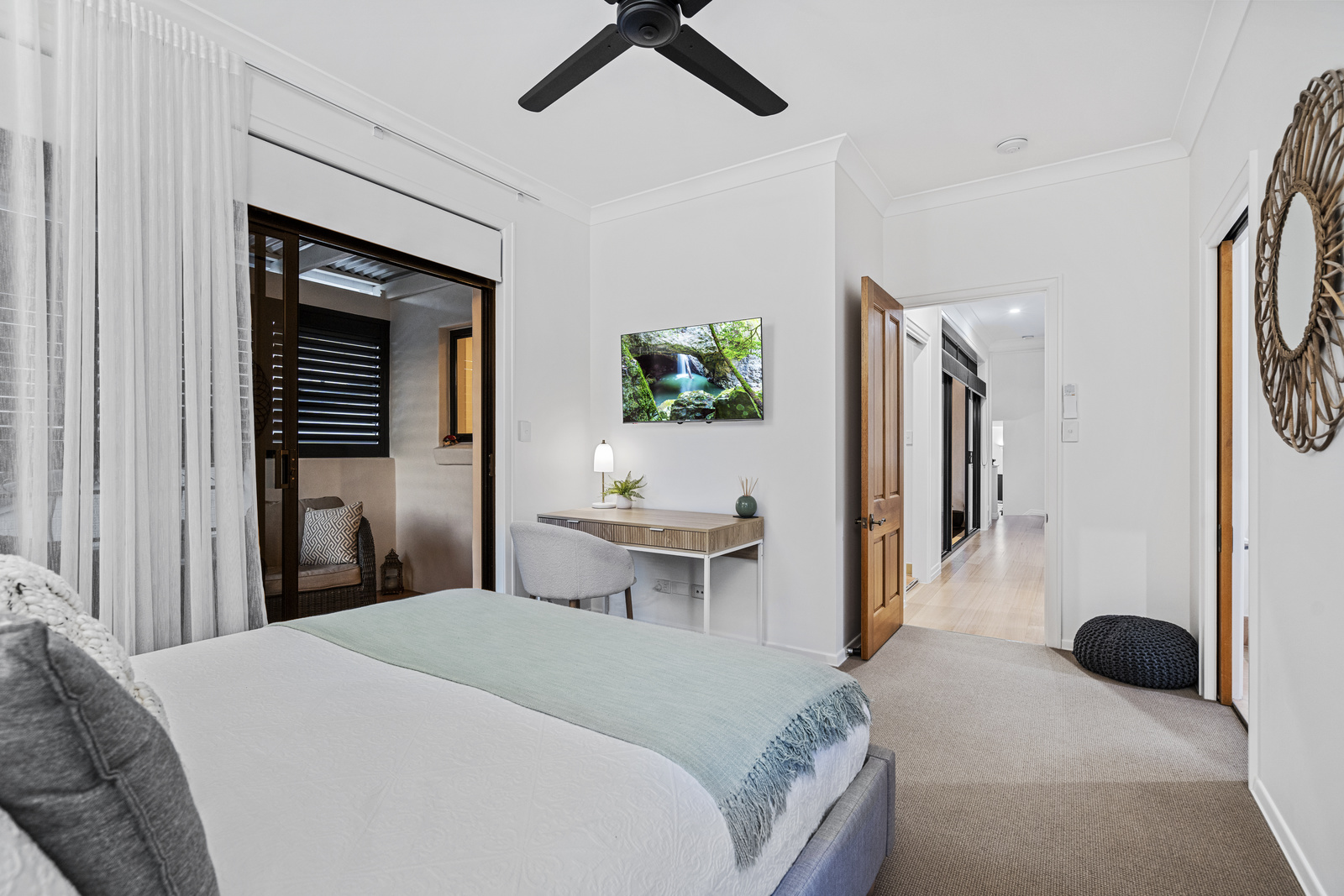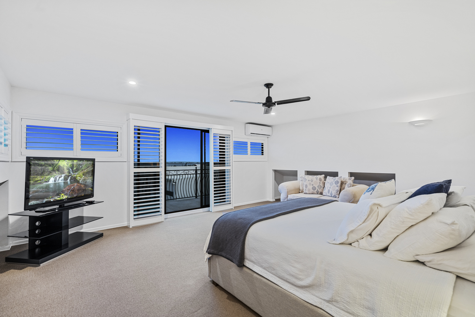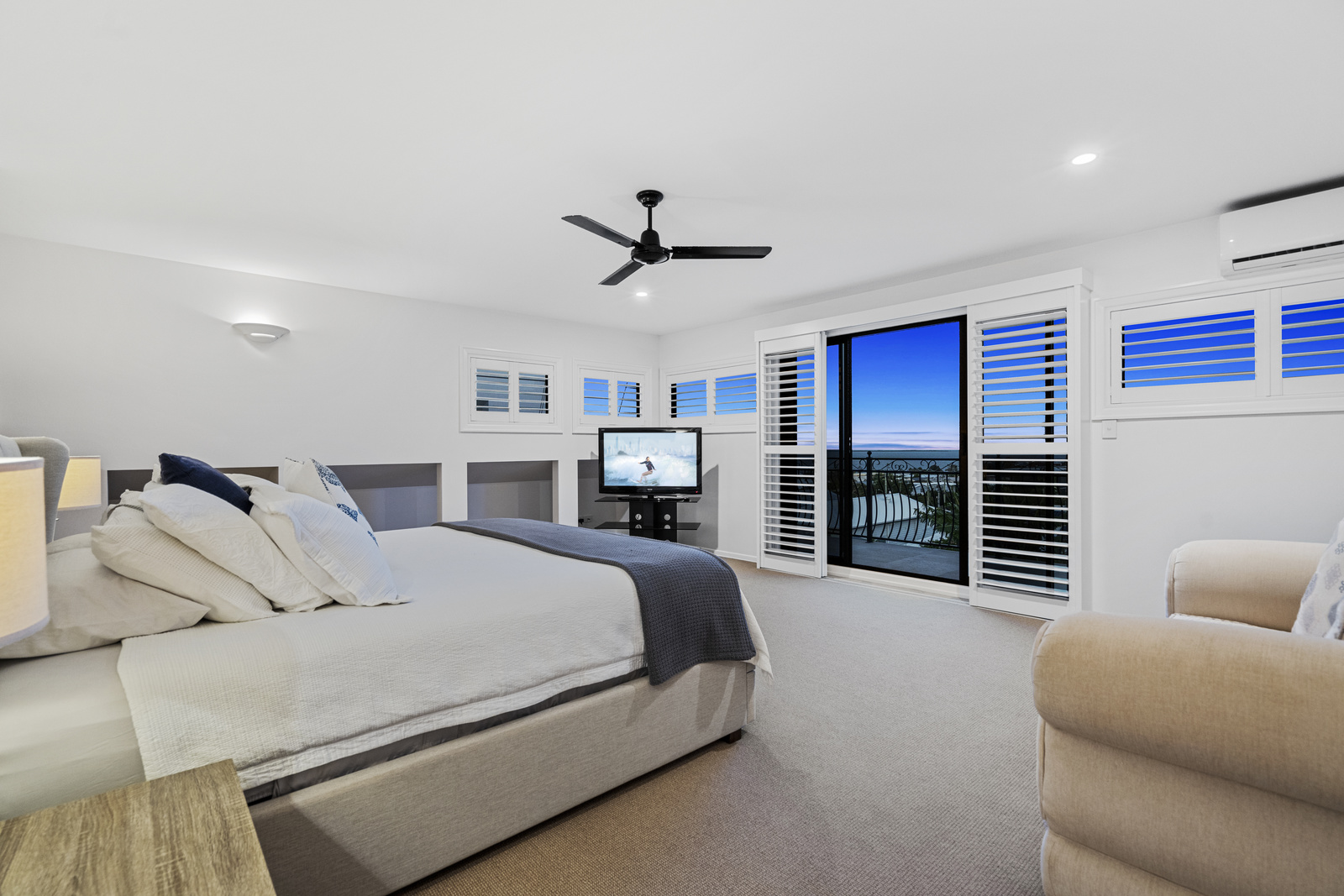 The master suite, located on the highest level, boasts impressive ocean views, plantation shutters, a walk-in wardrobe, and an ensuite with double vanities and showers. This retreat includes a private deck capturing all the views on offer, providing a serene space to wake up to some of the best views in Manly.