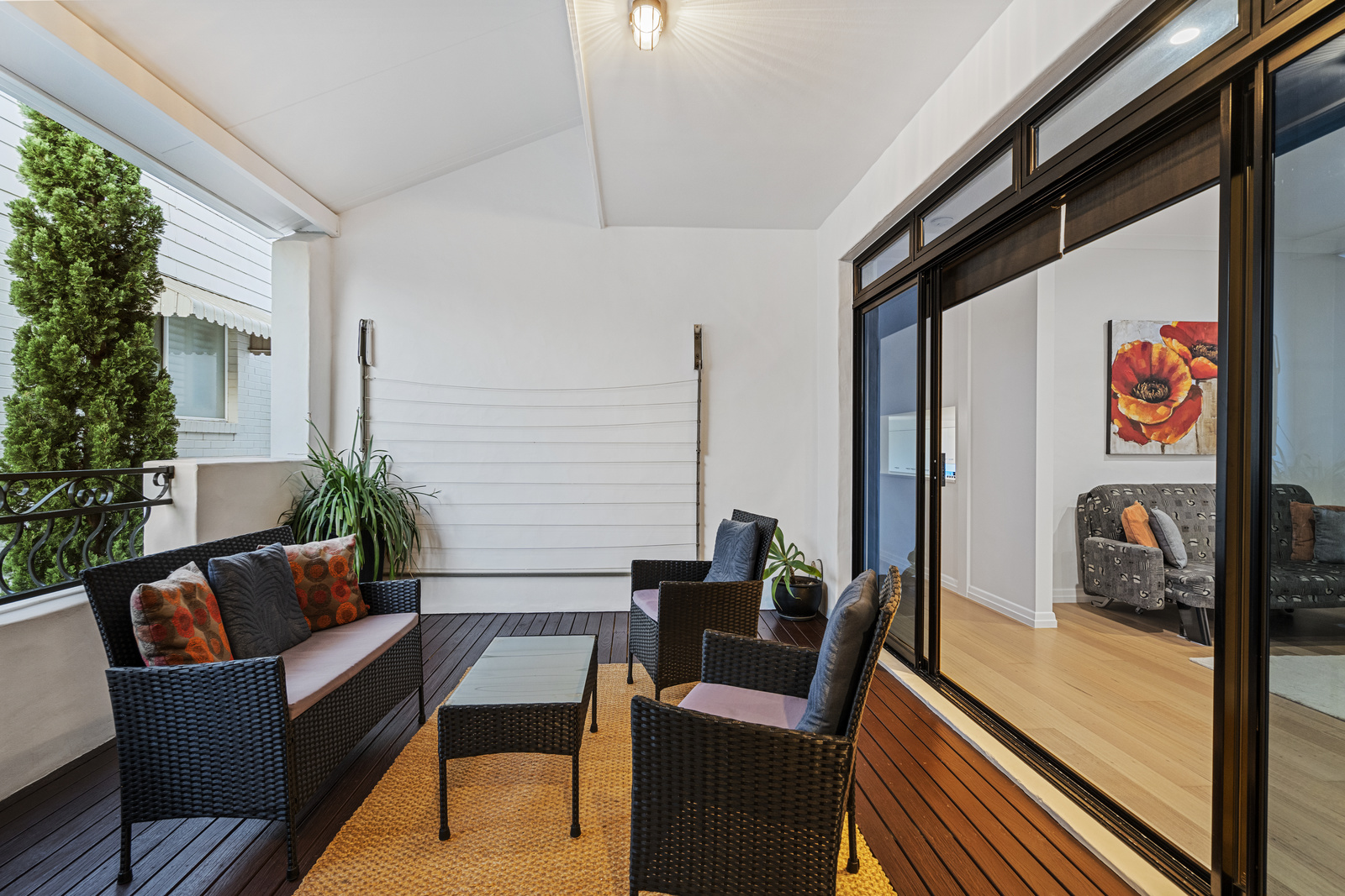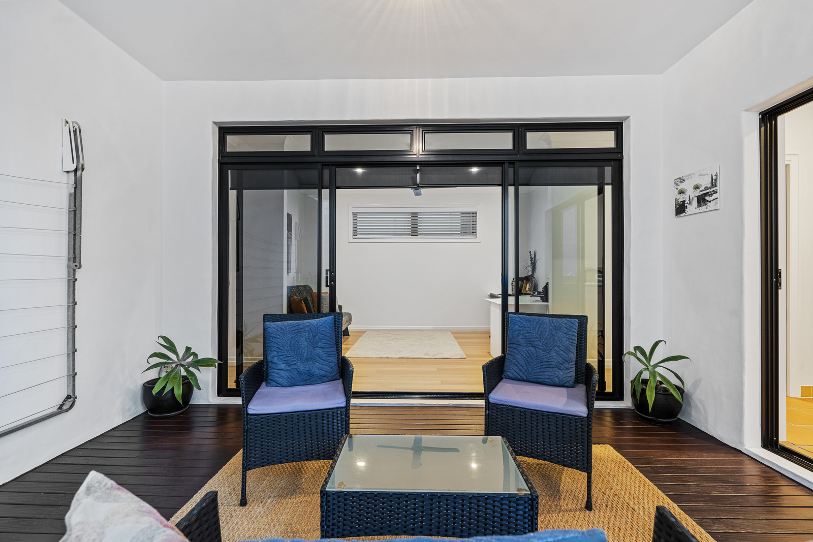 A few steps up to the split level, you will find the laundry with a private deck and clothesline, a large study/office that can be converted back to a bedroom, another bedroom with Juliette balcony, an ensuite, and a walk-in robe, plus a separate powder room.