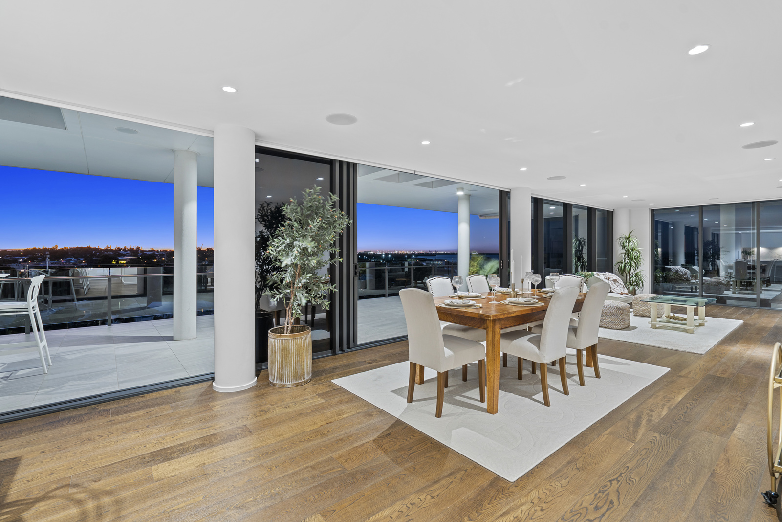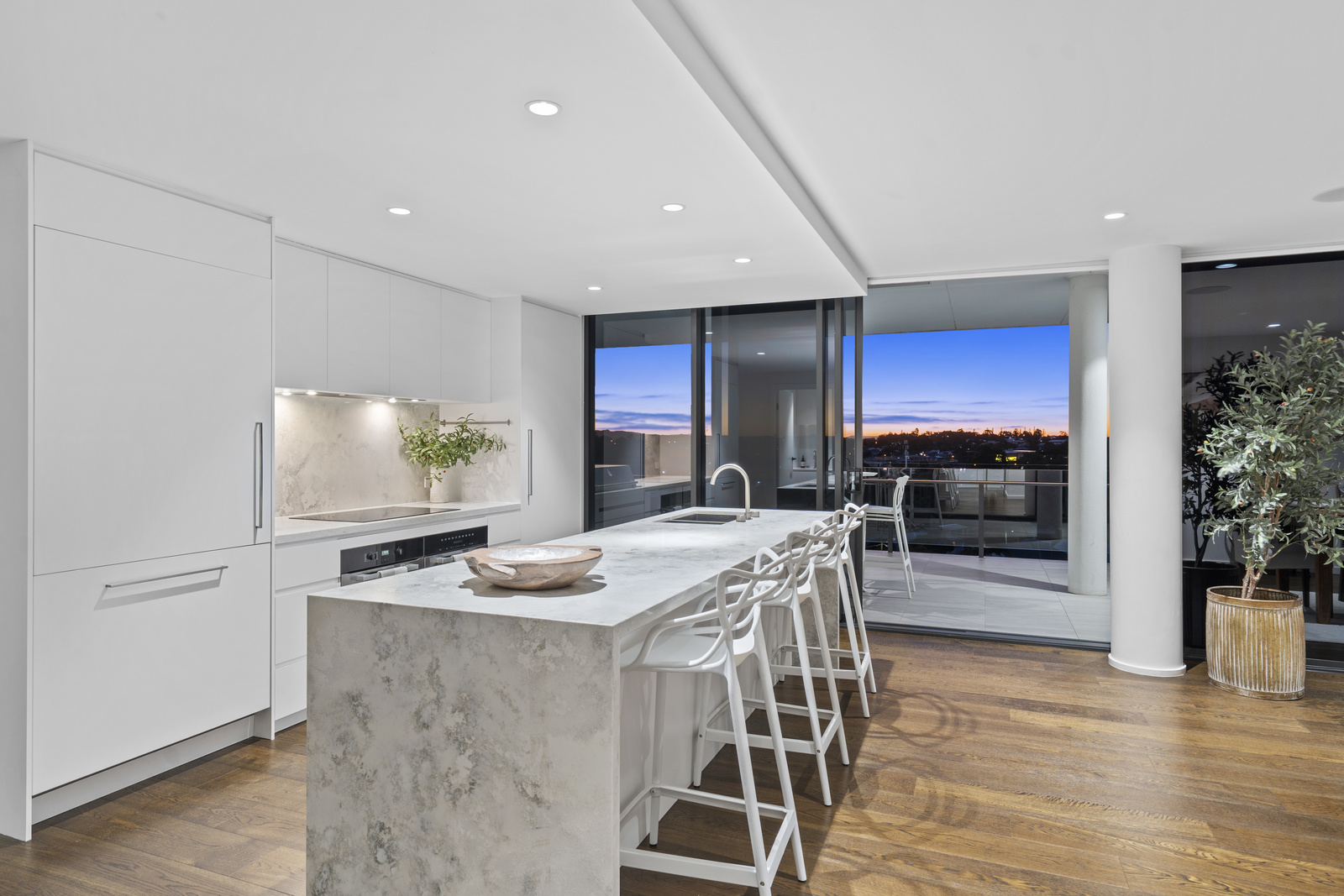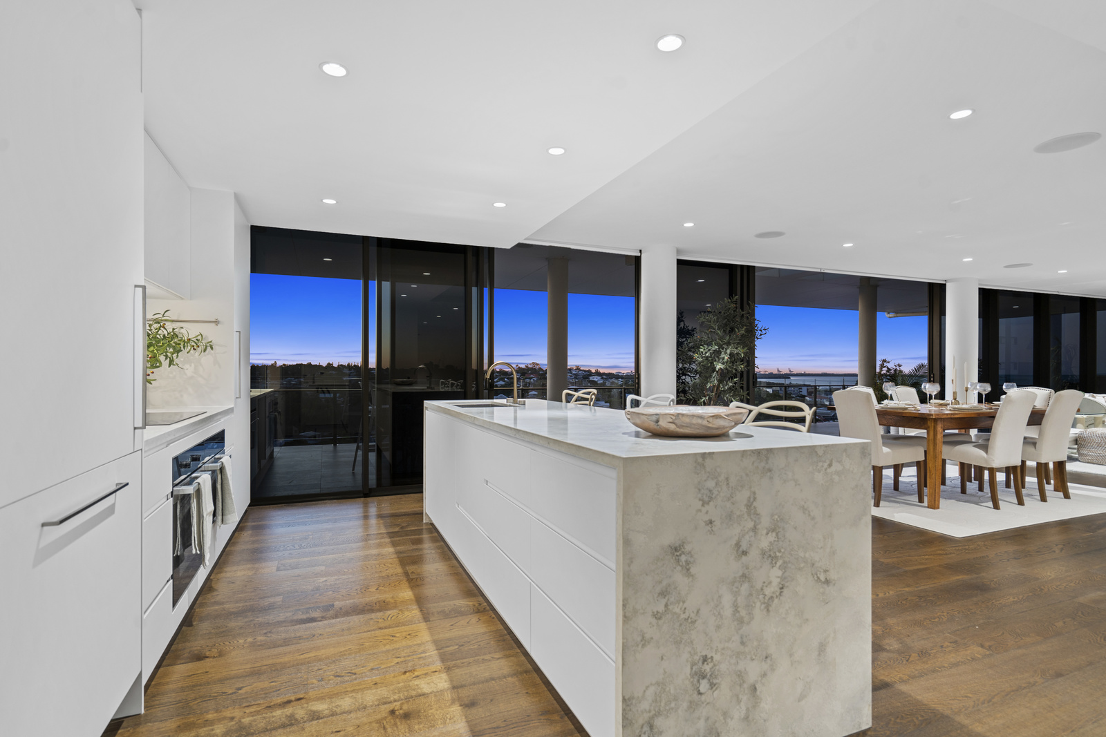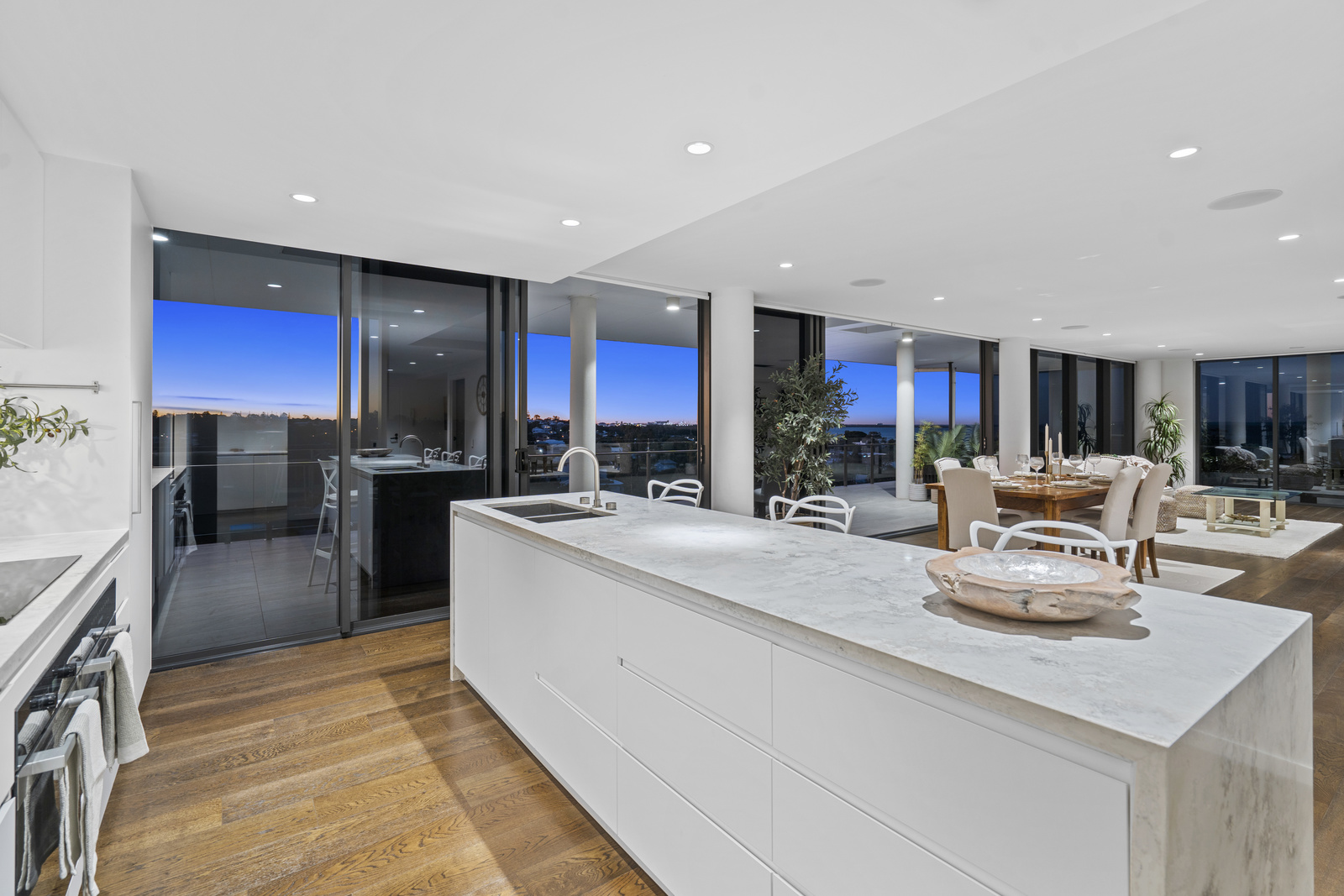 The indoor space is equally impressive – designed for both everyday luxury and entertaining on a grand scale. The open plan kitchen, living and dining zone flows seamlessly out to the massive wraparound terrace.