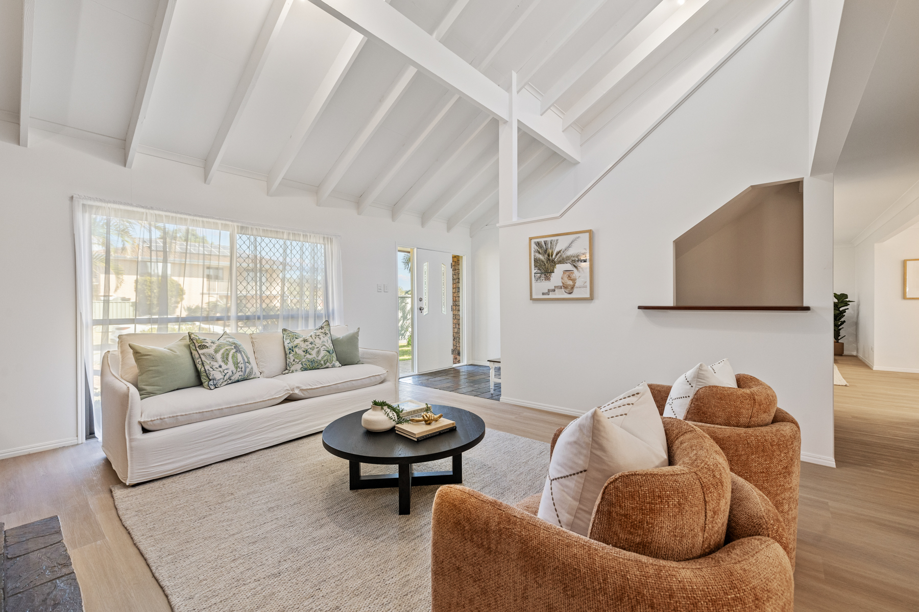 Upon arrival, the home is sure to impress with its inviting façade and established gardens. Inside, the lower level unfolds with multiple living zones, including a formal lounge and spacious open-plan living/dining area. The well-appointed kitchen serves as the central hub of the home, offering an abundance of storage, extensive preparation space, and easy access to both indoor and outdoor living areas. High ceilings and large windows flood the home with natural light, creating an enhanced sense of space and warmth. Completing the lower level is a full bathroom and separate laundry with outdoor access.