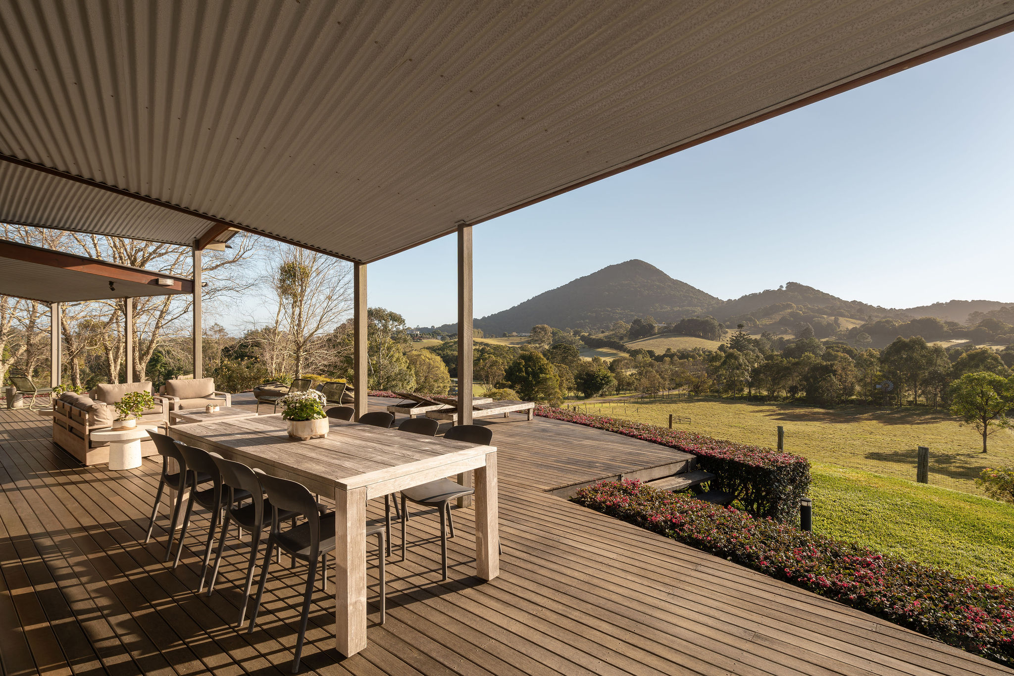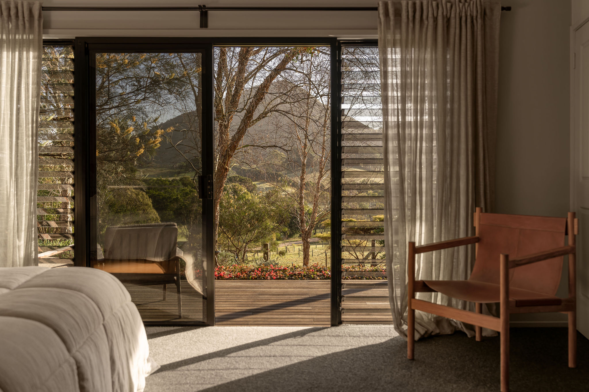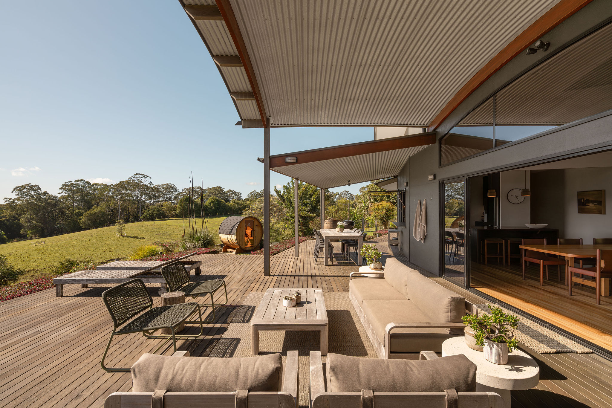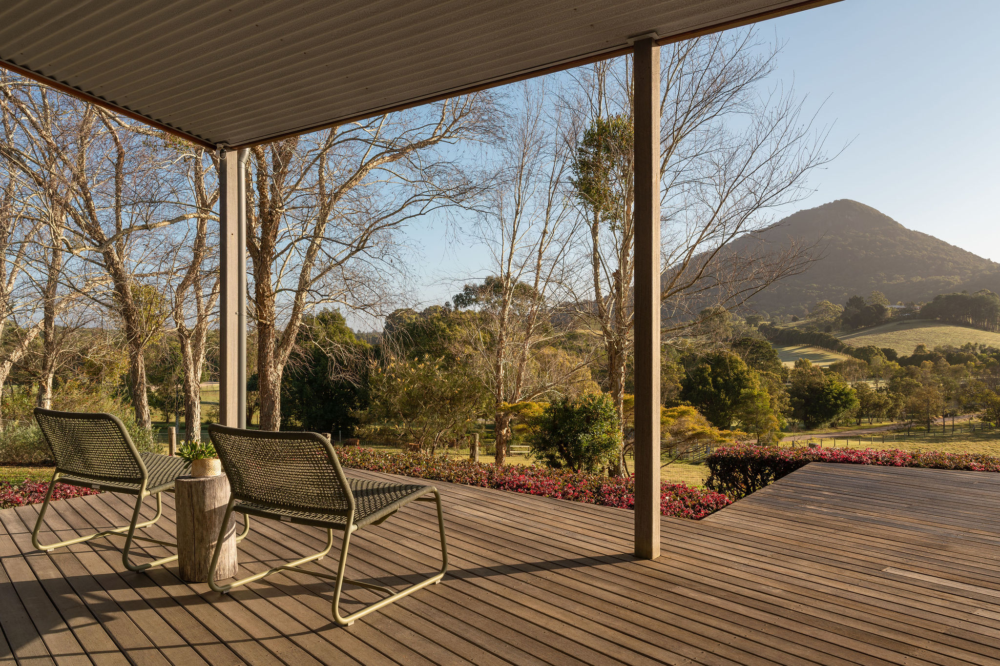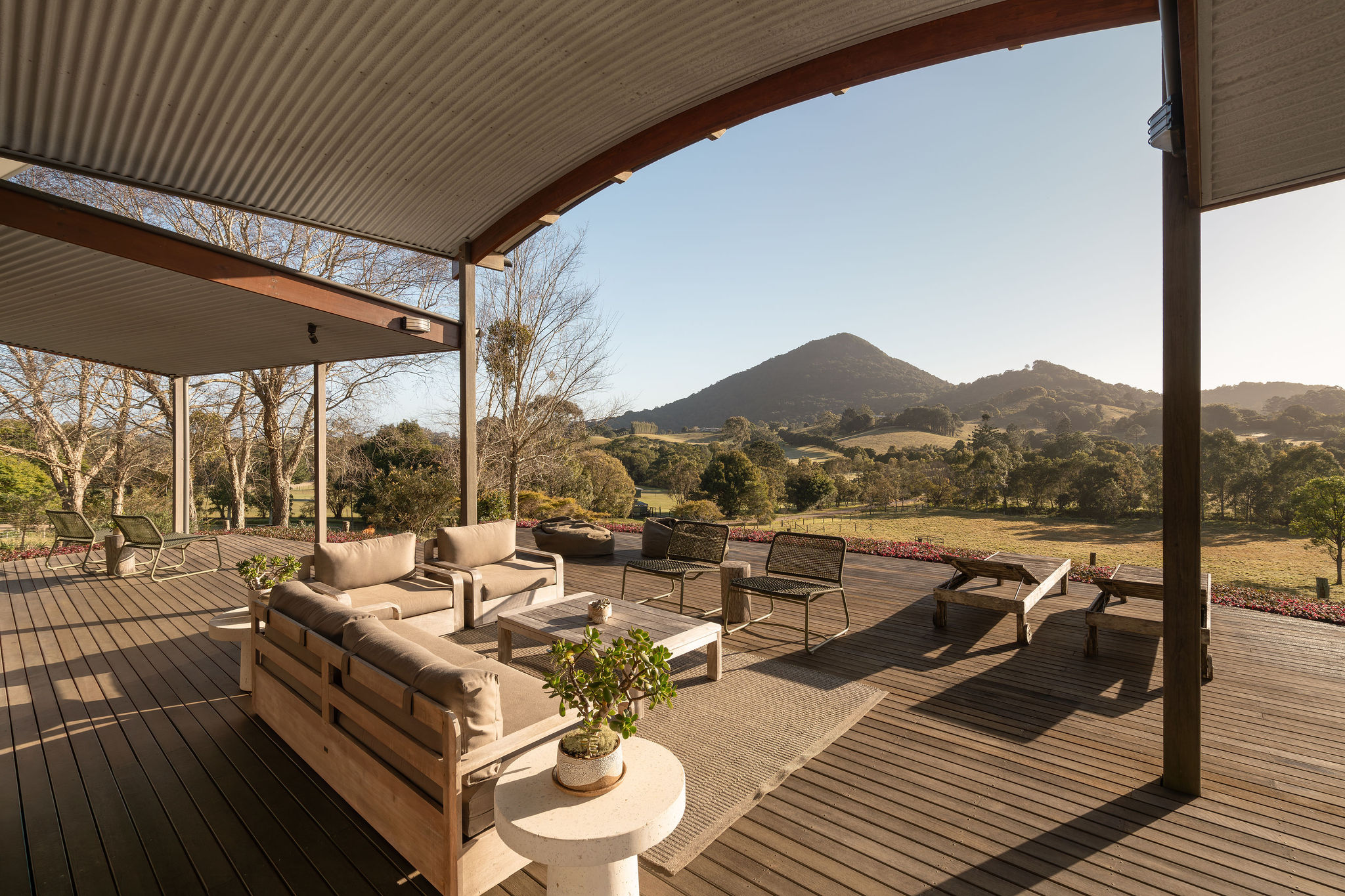 At its heart is a beautifully appointed four-bedroom architecturally designed home. Inspired by modern barn architecture and mid-century curves, this lightweight design is site and climate responsive. Constructed from steel, iron and timber and finished with solid blackbutt flooring, the home exudes warmth and craftsmanship. Recent renovations have endowed the main residence with freshness and refinement.