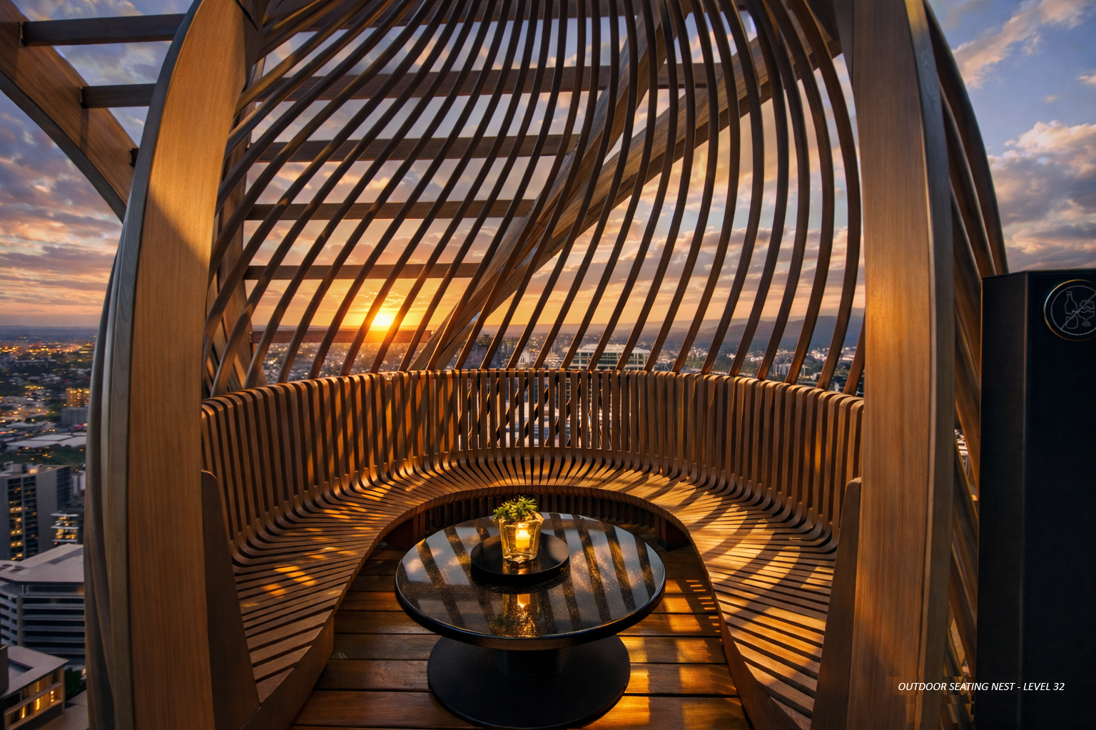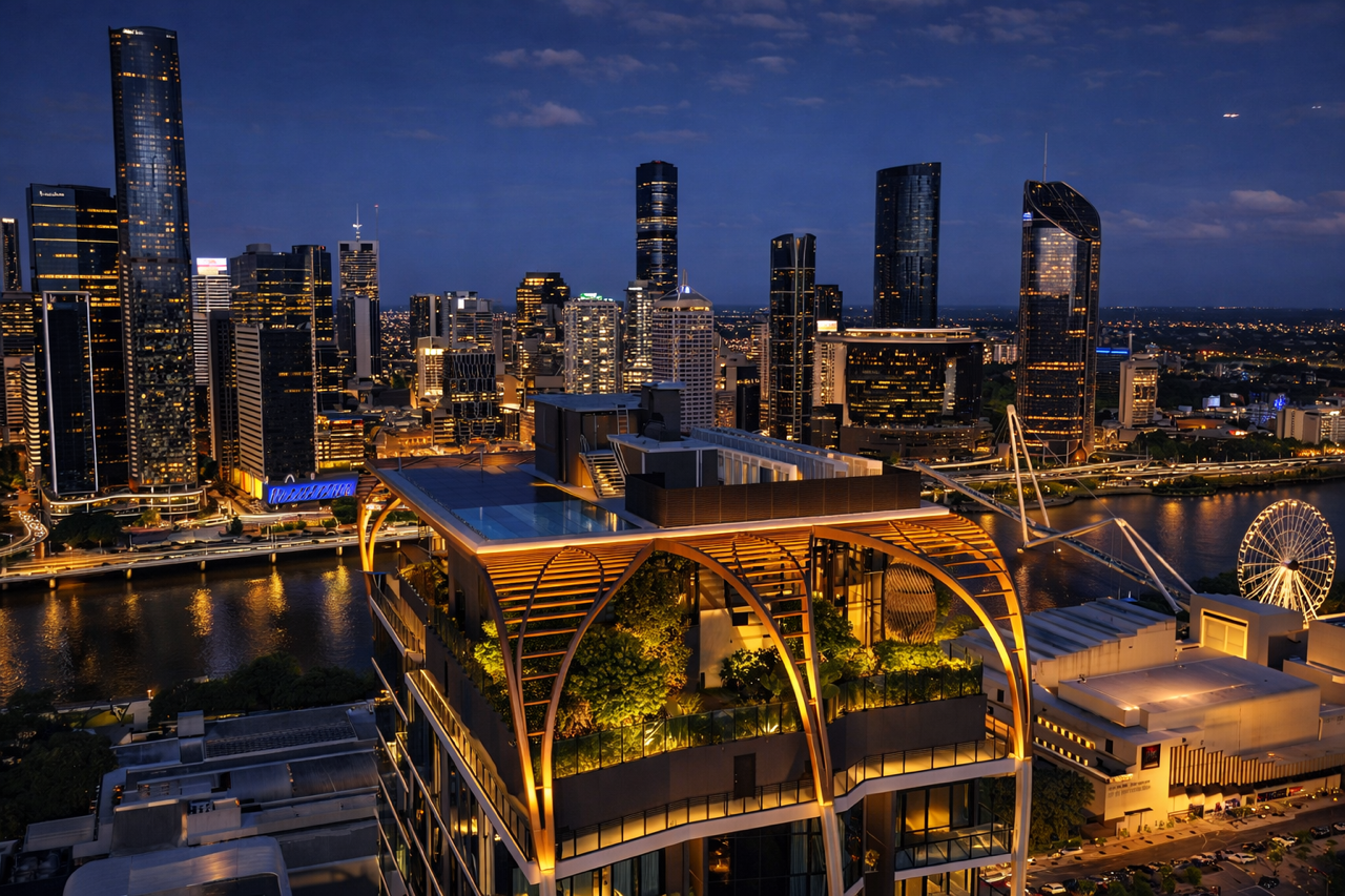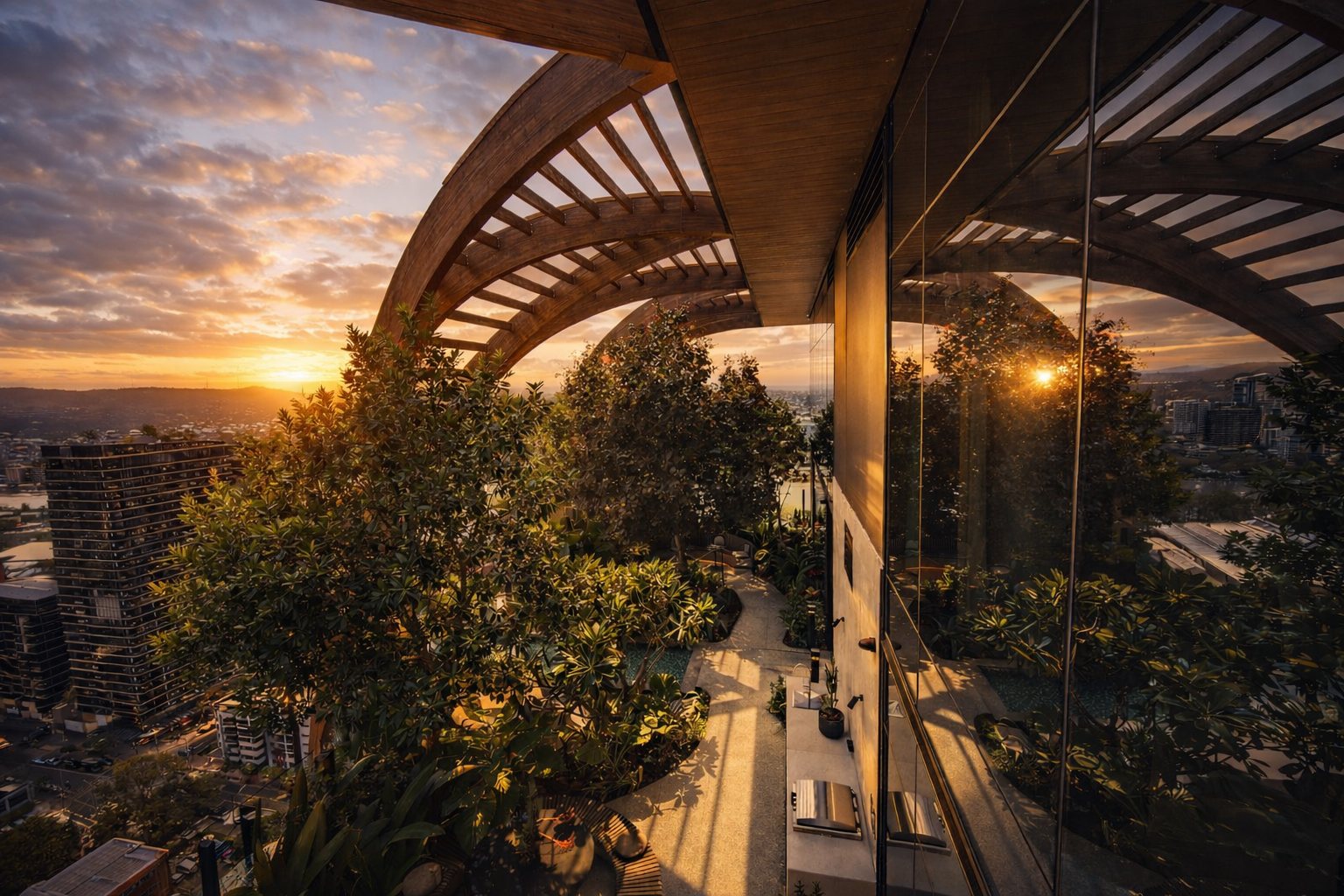 Upper House by Aria is recognised as one of South Brisbane’s most distinguished addresses. Rising 34 storeys with 194 residences, the building has become a landmark in the area and was recognised as the tallest building in South Brisbane upon completion. Its striking architectural form, inspired by nature, features elegant ribbons and a dramatic rooftop timber pergola that crowns the building.