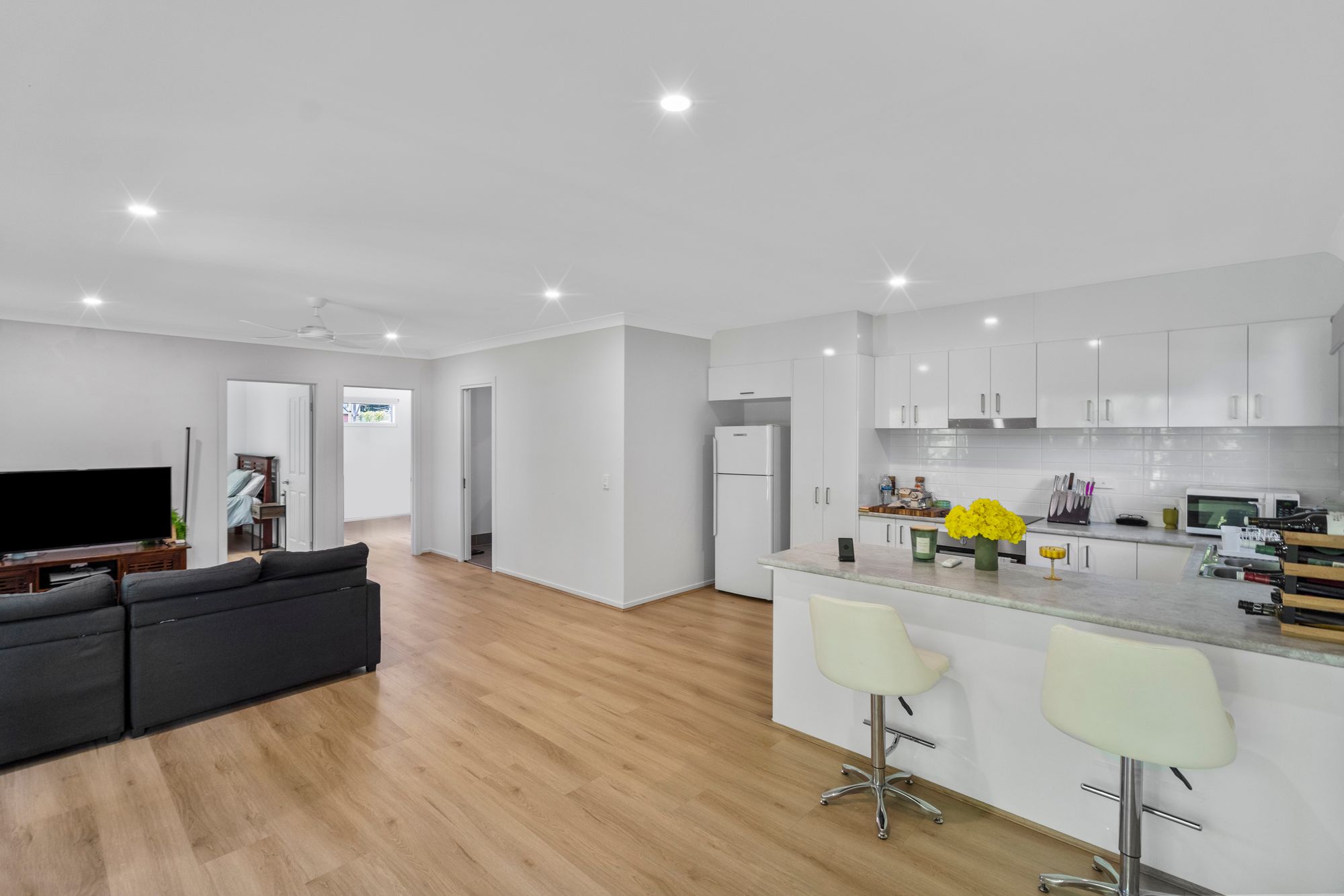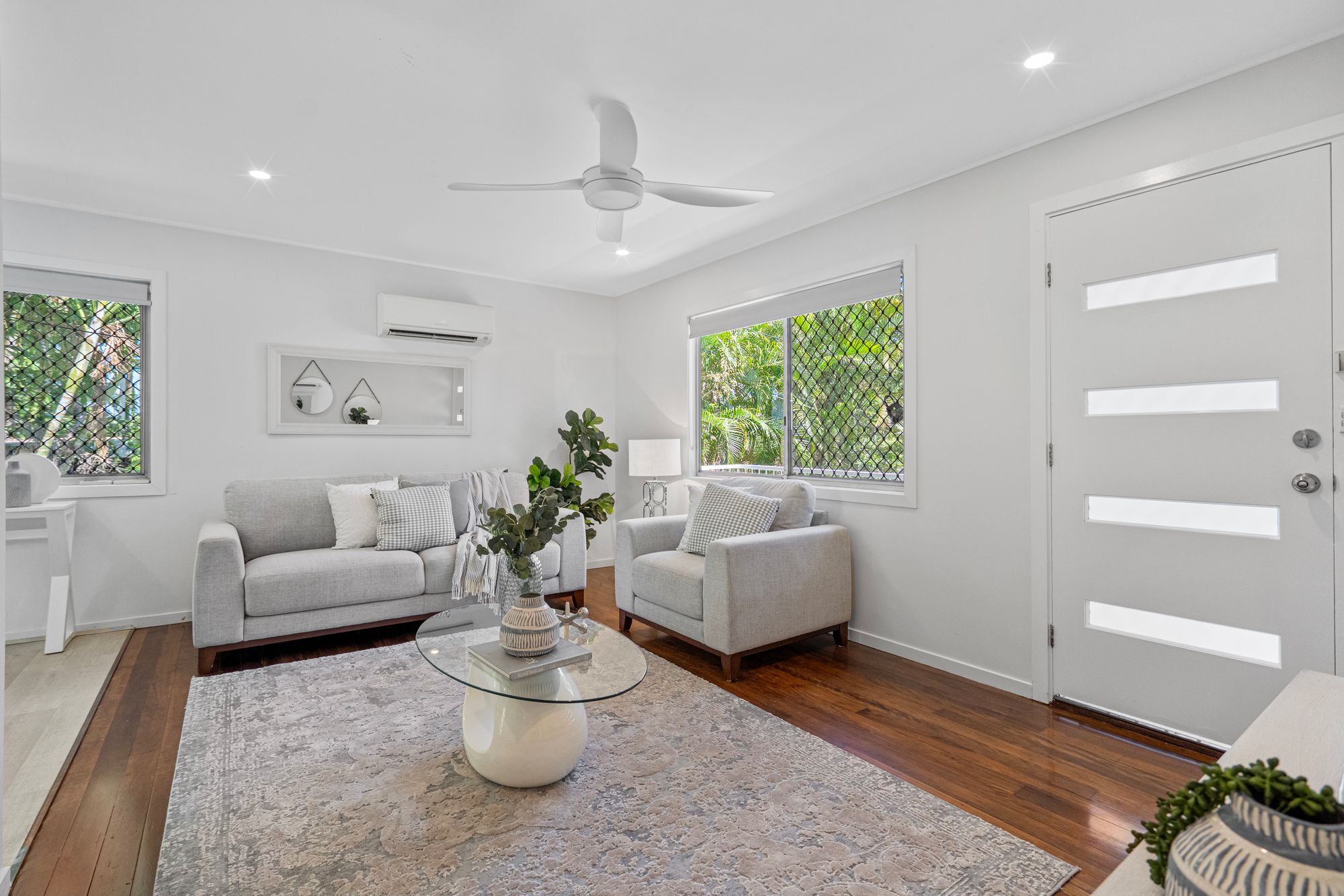 – Open-Plan Living: Featuring beautiful polished hardwood flooring, air-conditioning, and a ceiling fan.