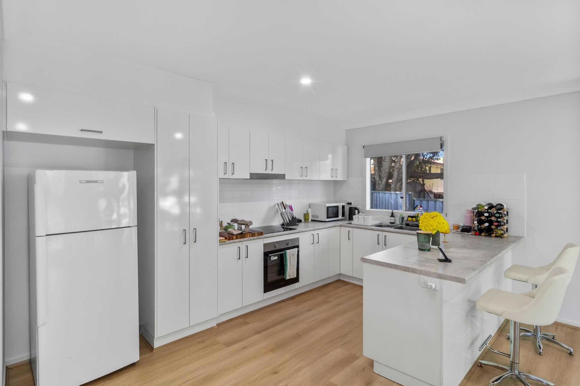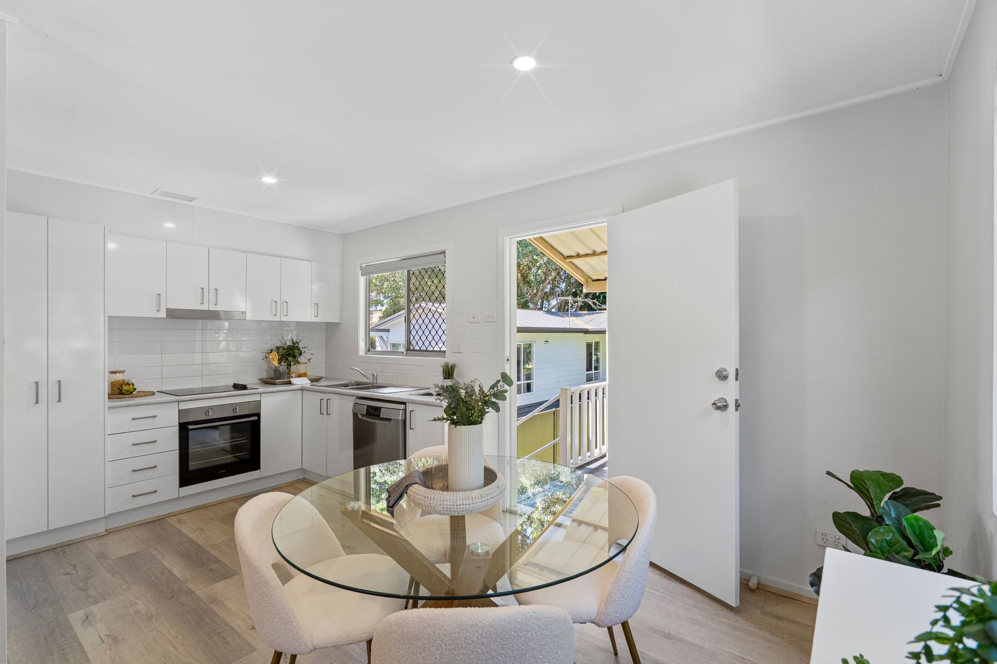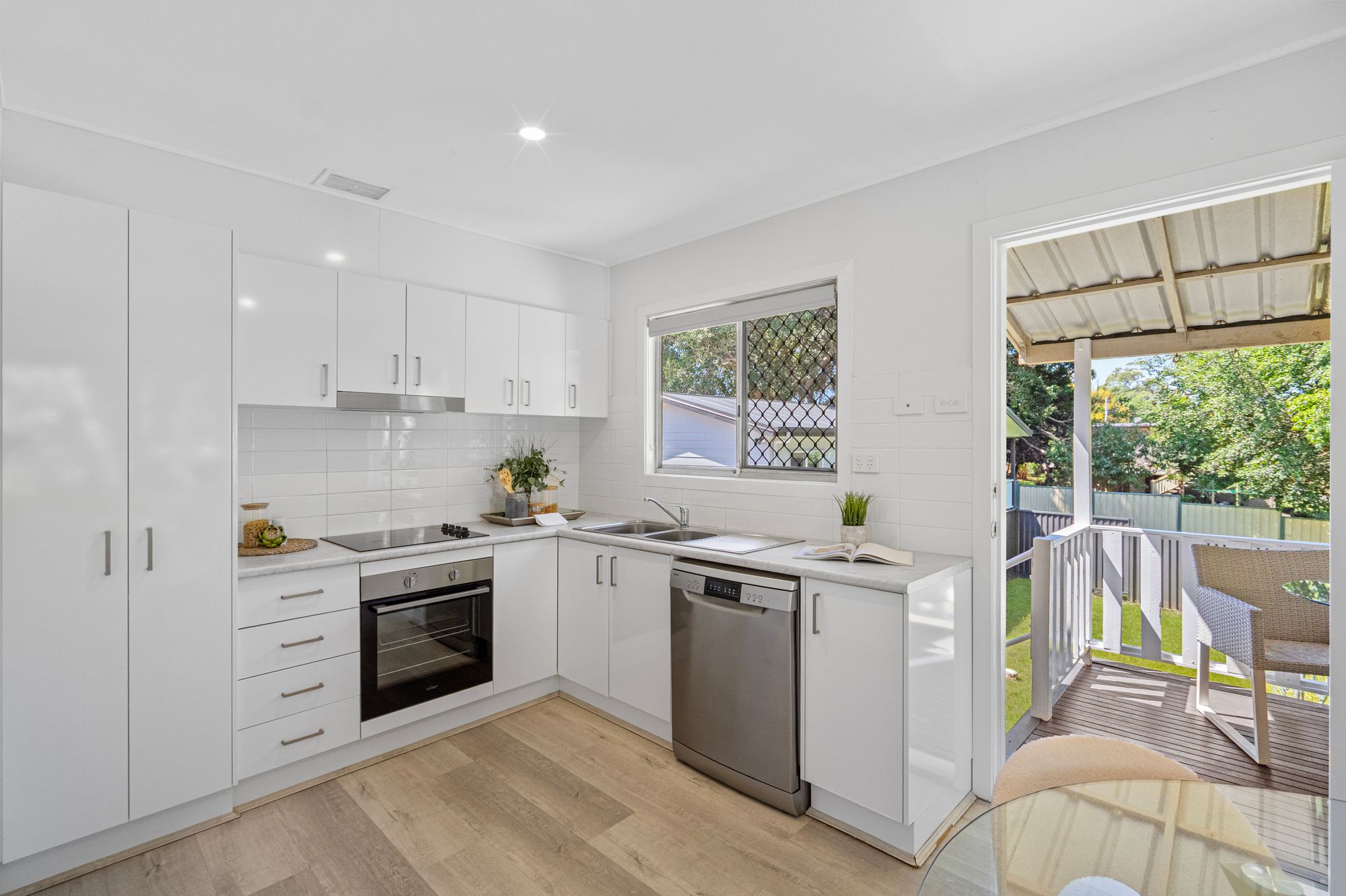 – Newly Renovated Kitchen: A stylish, functional space with an electric cooktop, dishwasher, and ample storage, flowing into the dining area with durable vinyl flooring.