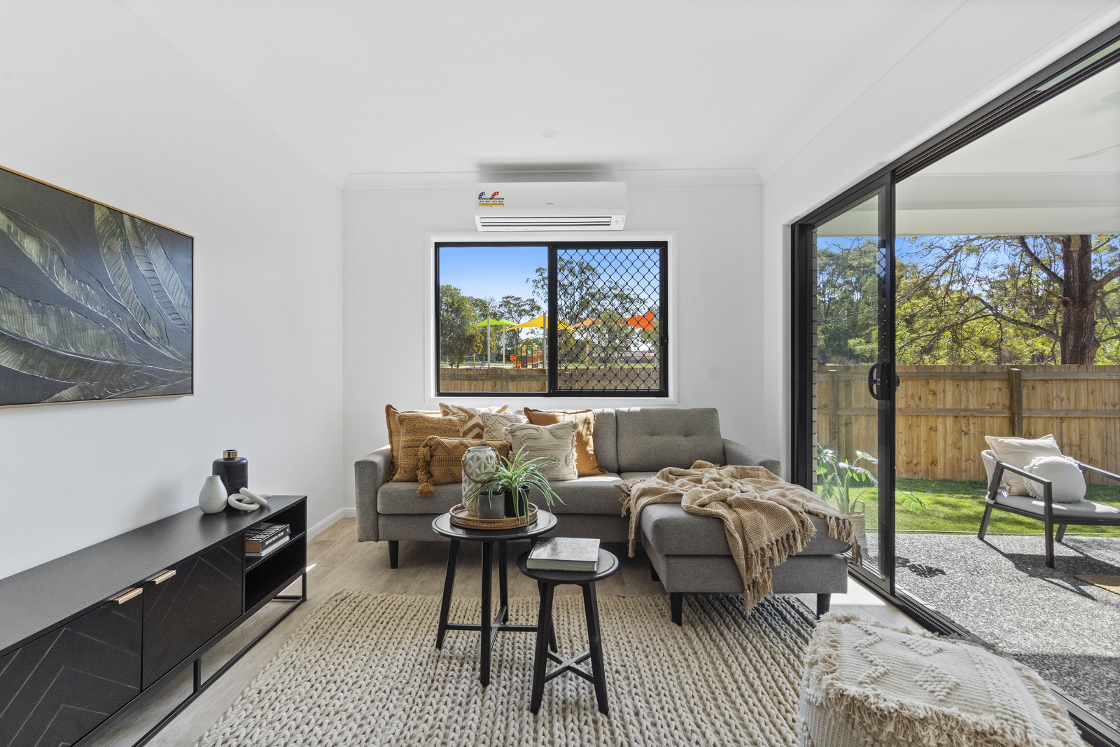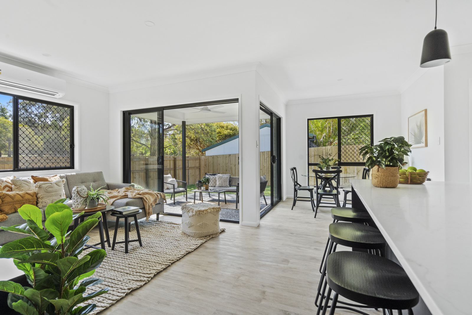• Large open plan kitchen/living/dining area with twin stacker doors leading onto the patio, split system A/C & plenty of natural light
