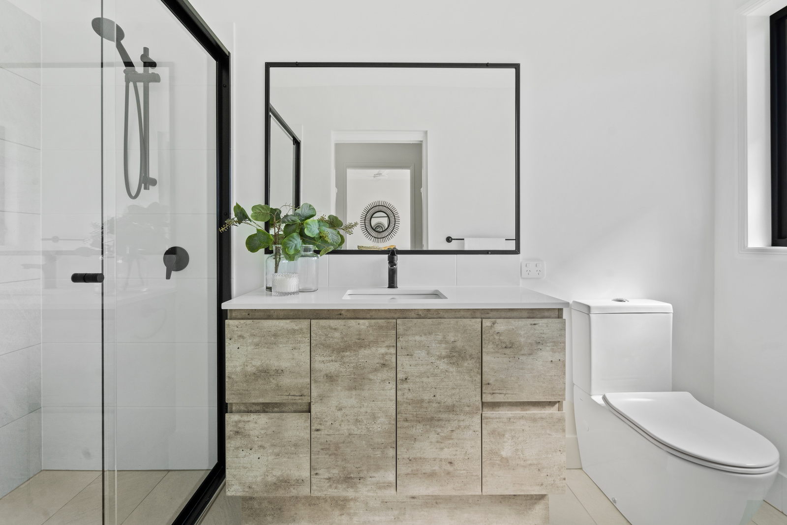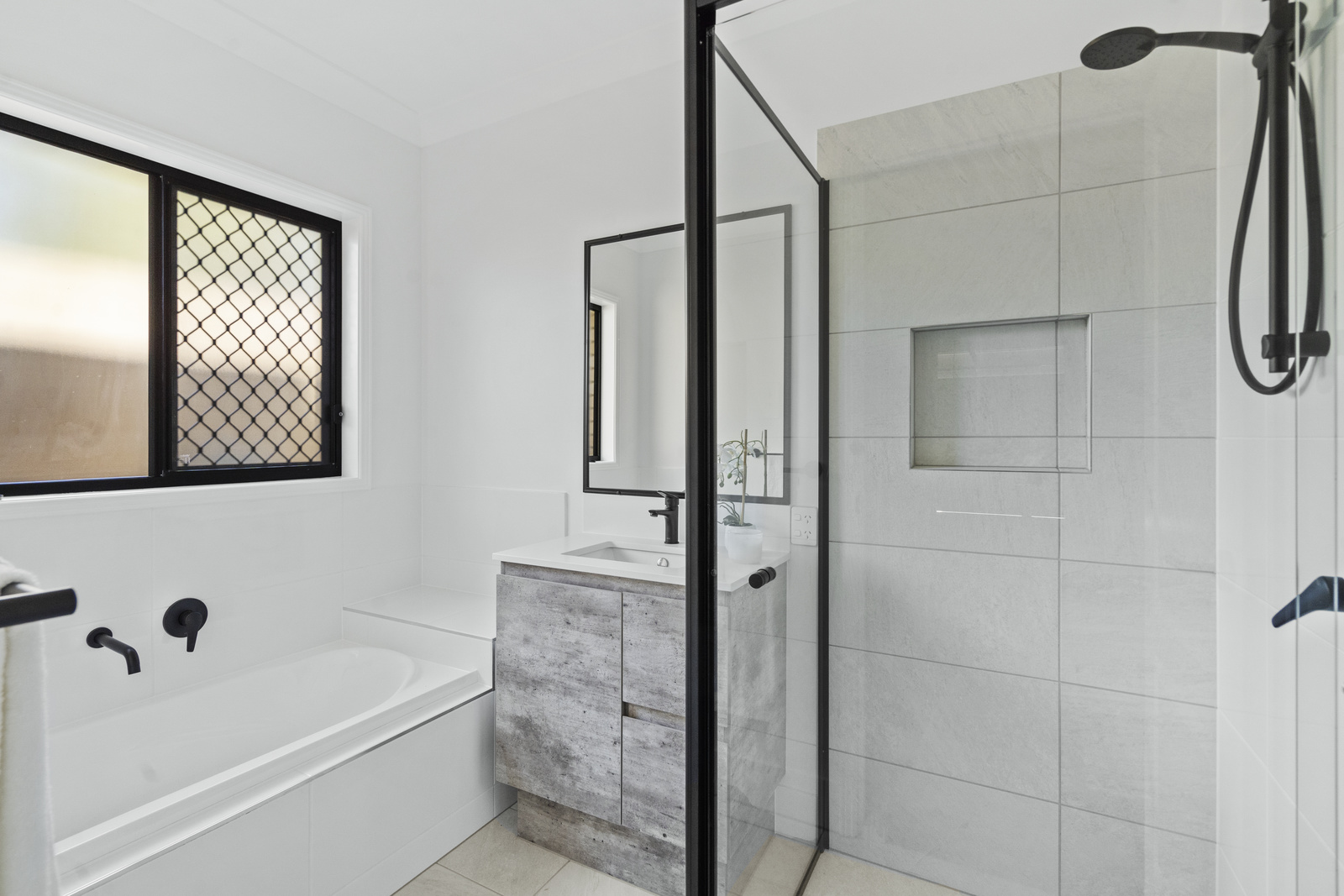 • Modern family bathroom with matte black shower screen & fixtures, plus large bathtub