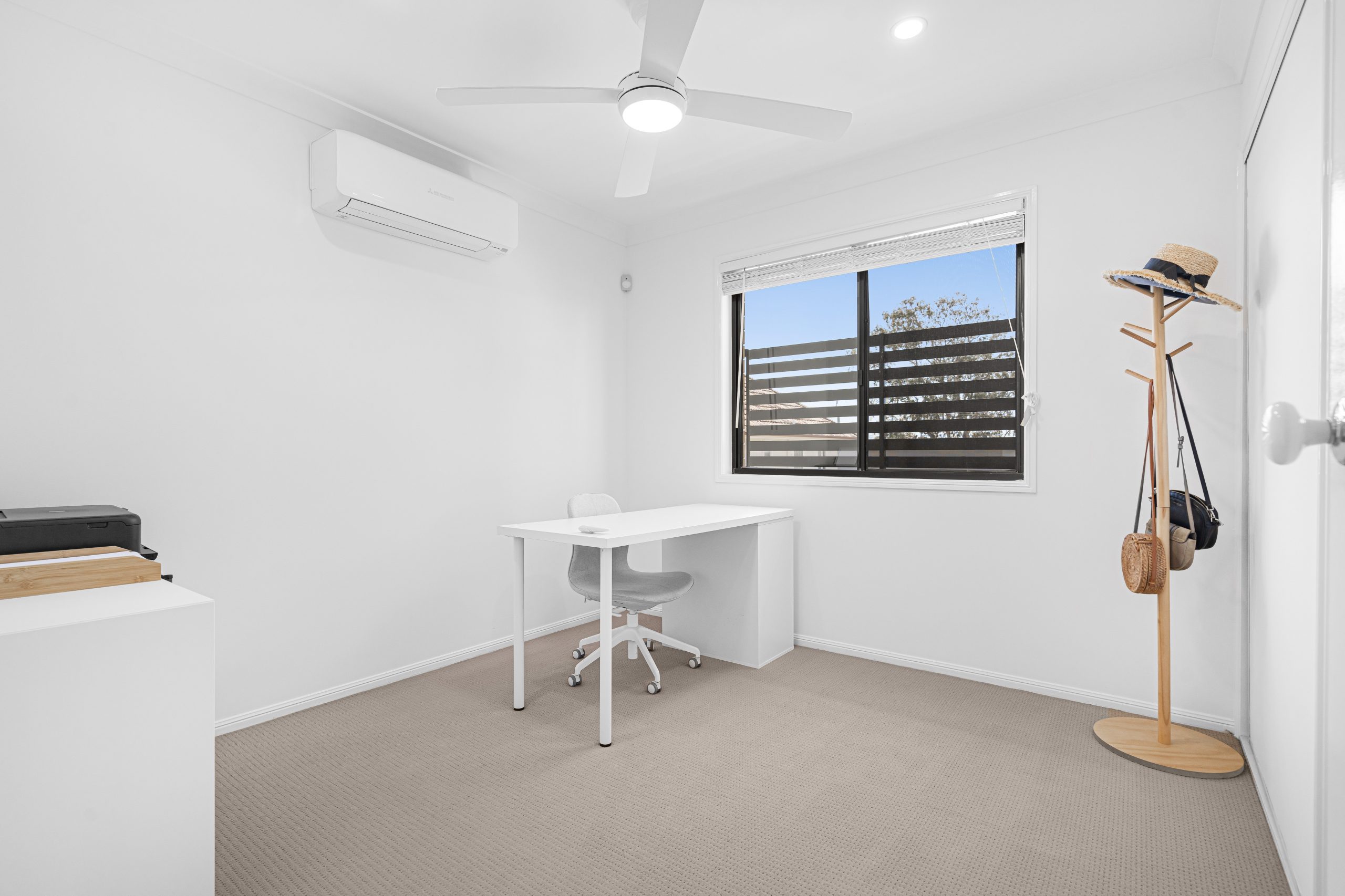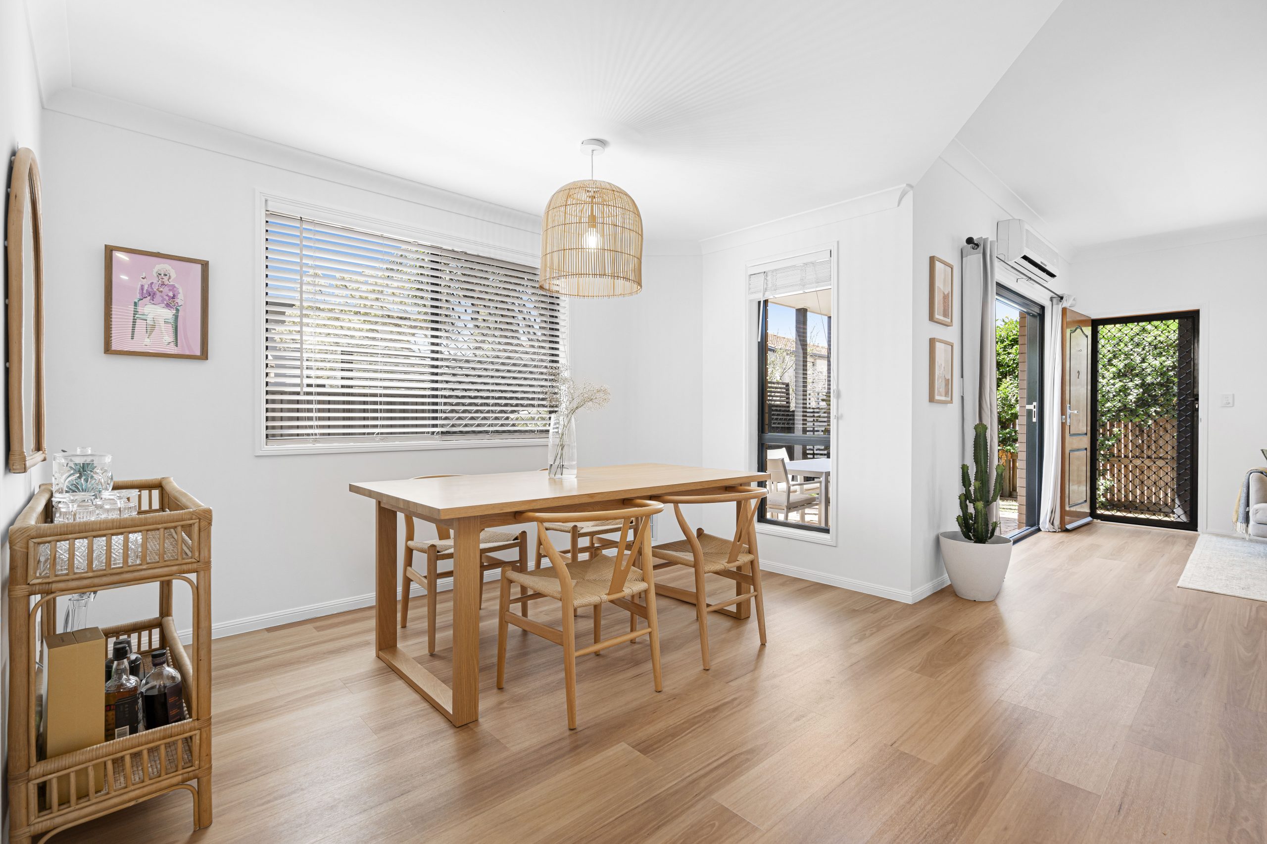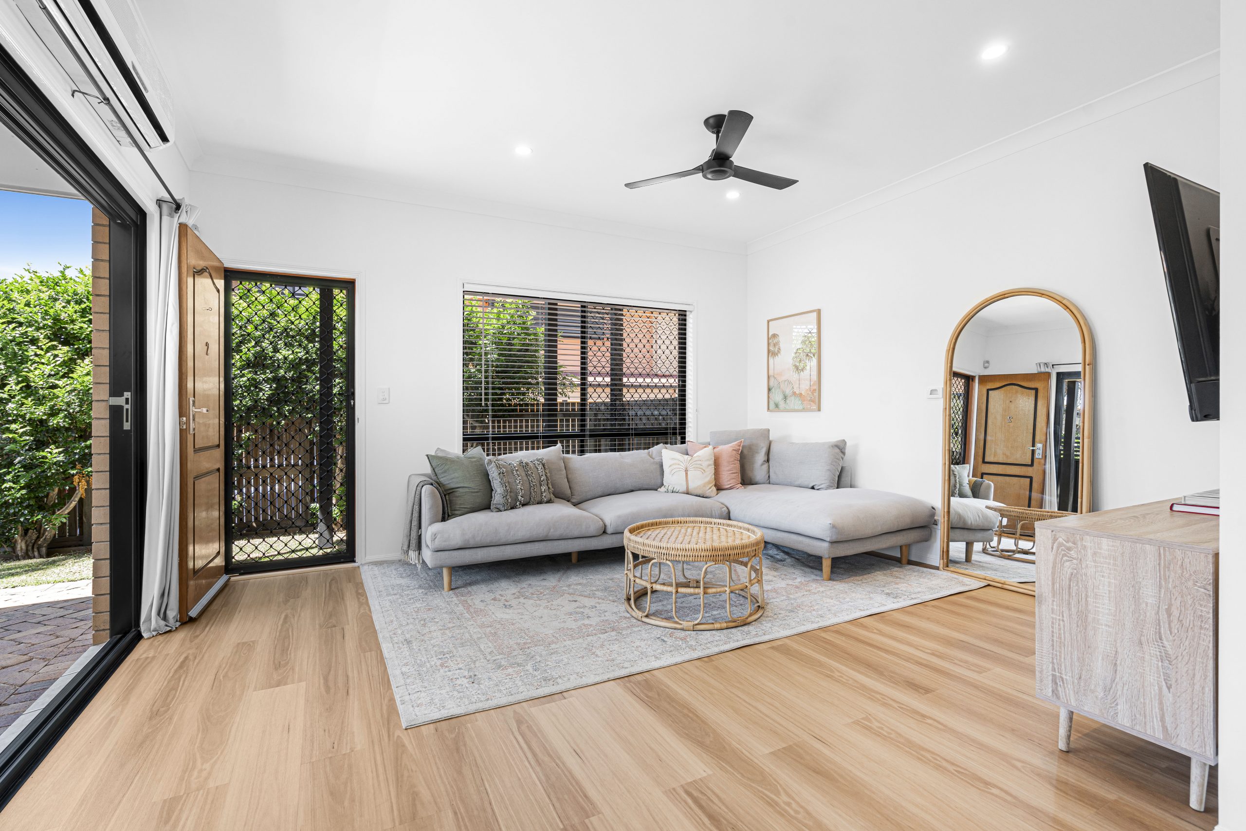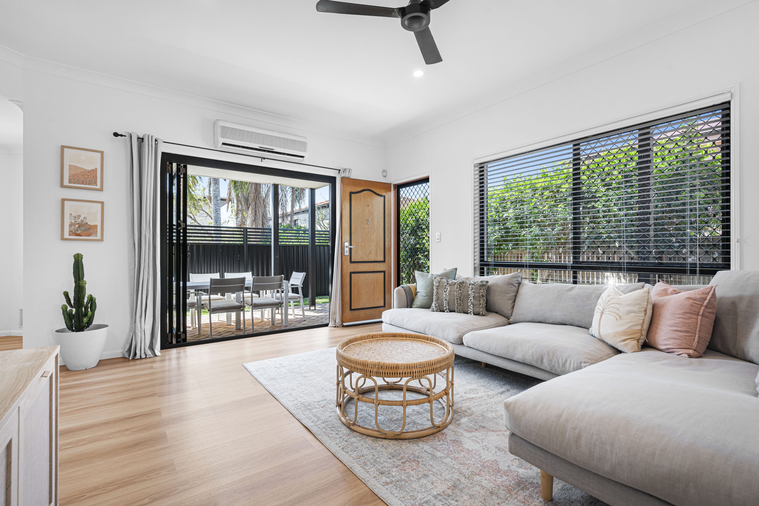 The open-plan layout is filled with natural light, creating a welcoming atmosphere. New flooring complements the space, while sleek black ceiling fans and a split-system air conditioner ensure year-round comfort.