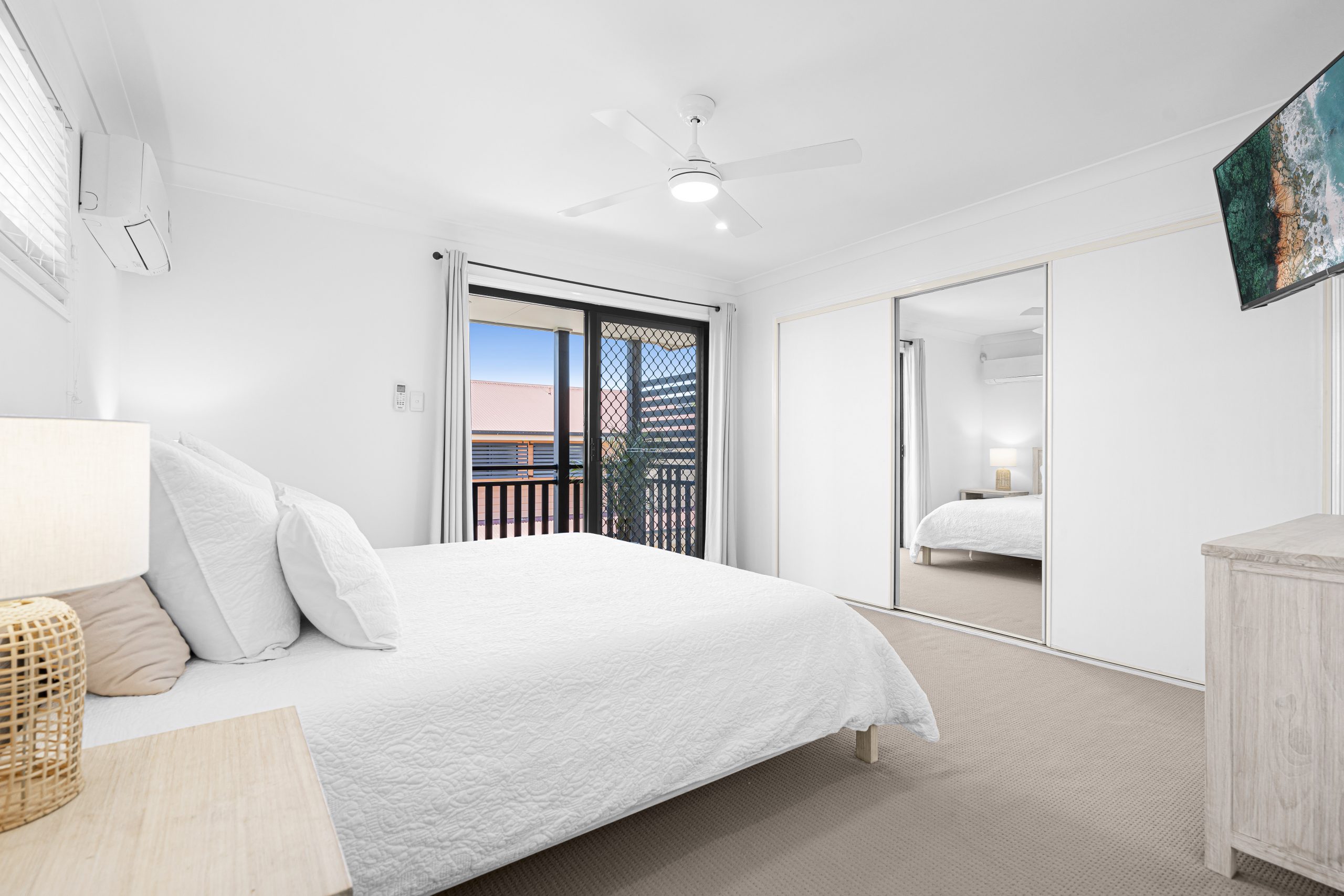 – Three generously sized bedrooms with built-in wardrobes and air conditioning, including a master with an extra spacious ensuite and a private balcony.