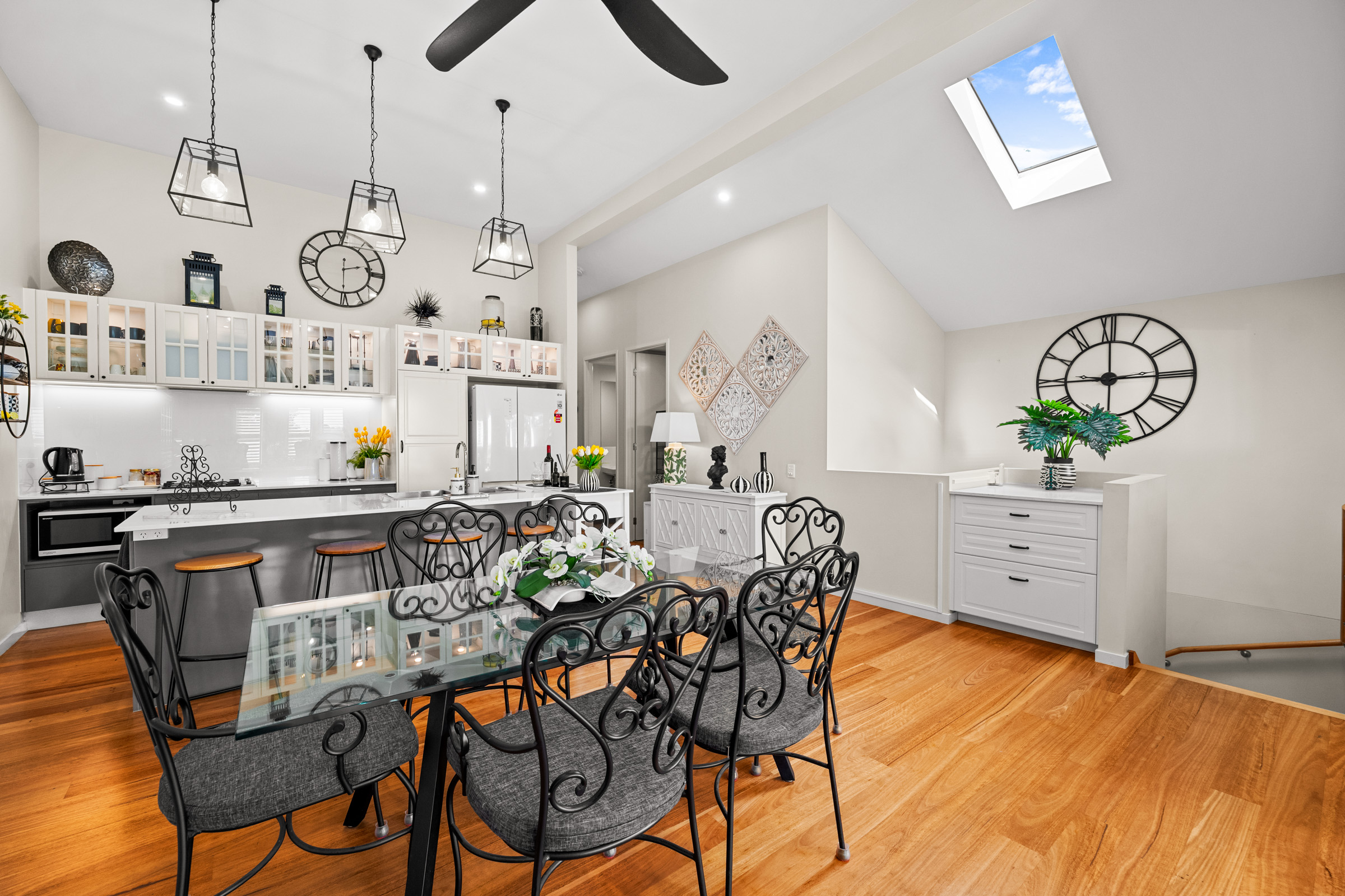 Upstairs, the heart of the home boasts soaring 3.7-metre ceilings, polished timber floors, and an open-plan kitchen, with stone bench top, dining, and living area that flows seamlessly to a generous entertainer’s deck with stunning city skyline views – the perfect spot for sunset drinks or a quiet morning coffee.