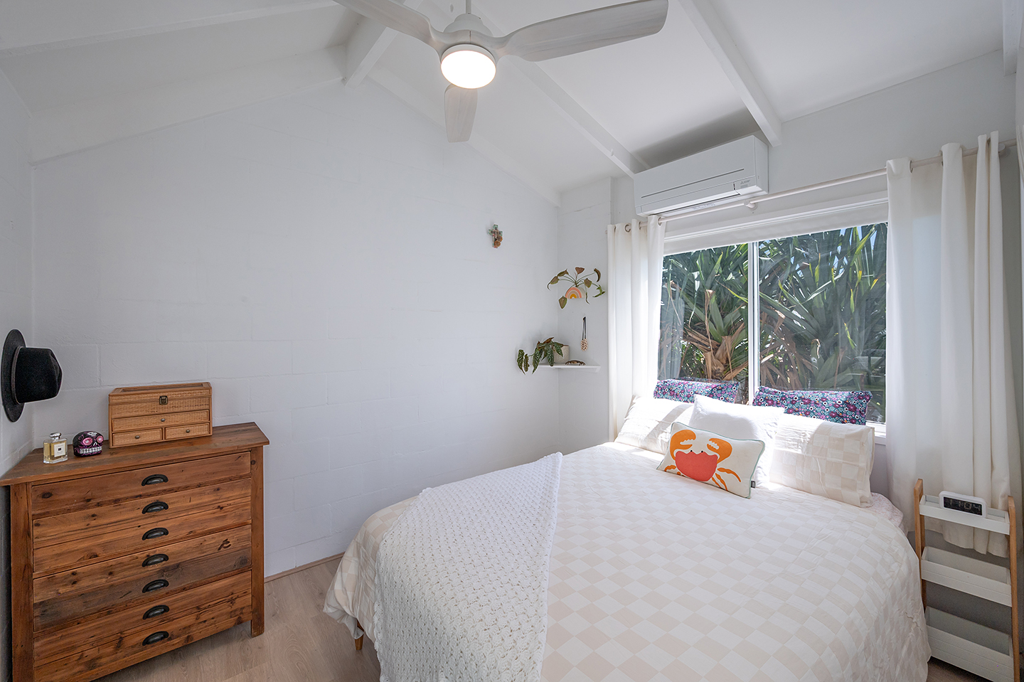 Two Bedrooms Upstairs: Both with built-in wardrobes; the main bedroom has air conditioning, a fan, and high ceilings with a light fresh ambience.