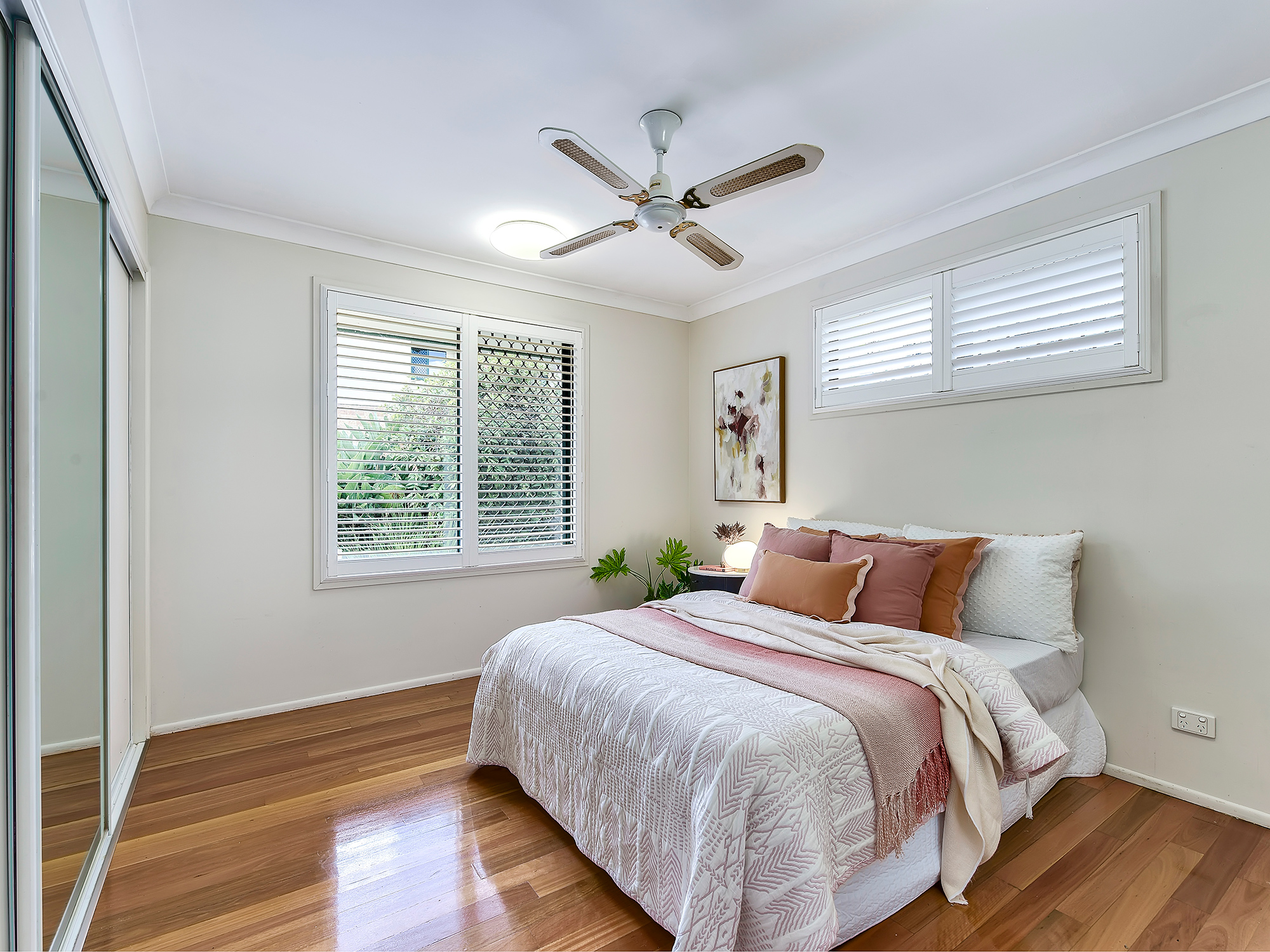 Set on its own level for enhanced privacy, the master suite includes built-in storage and a well-appointed ensuite with excellent vanity storage. Two additional built-in bedrooms are positioned on the upper level, serviced by a spacious second bathroom with a generous footprint and ample storage. Additional features include ceiling fans and a single garage.