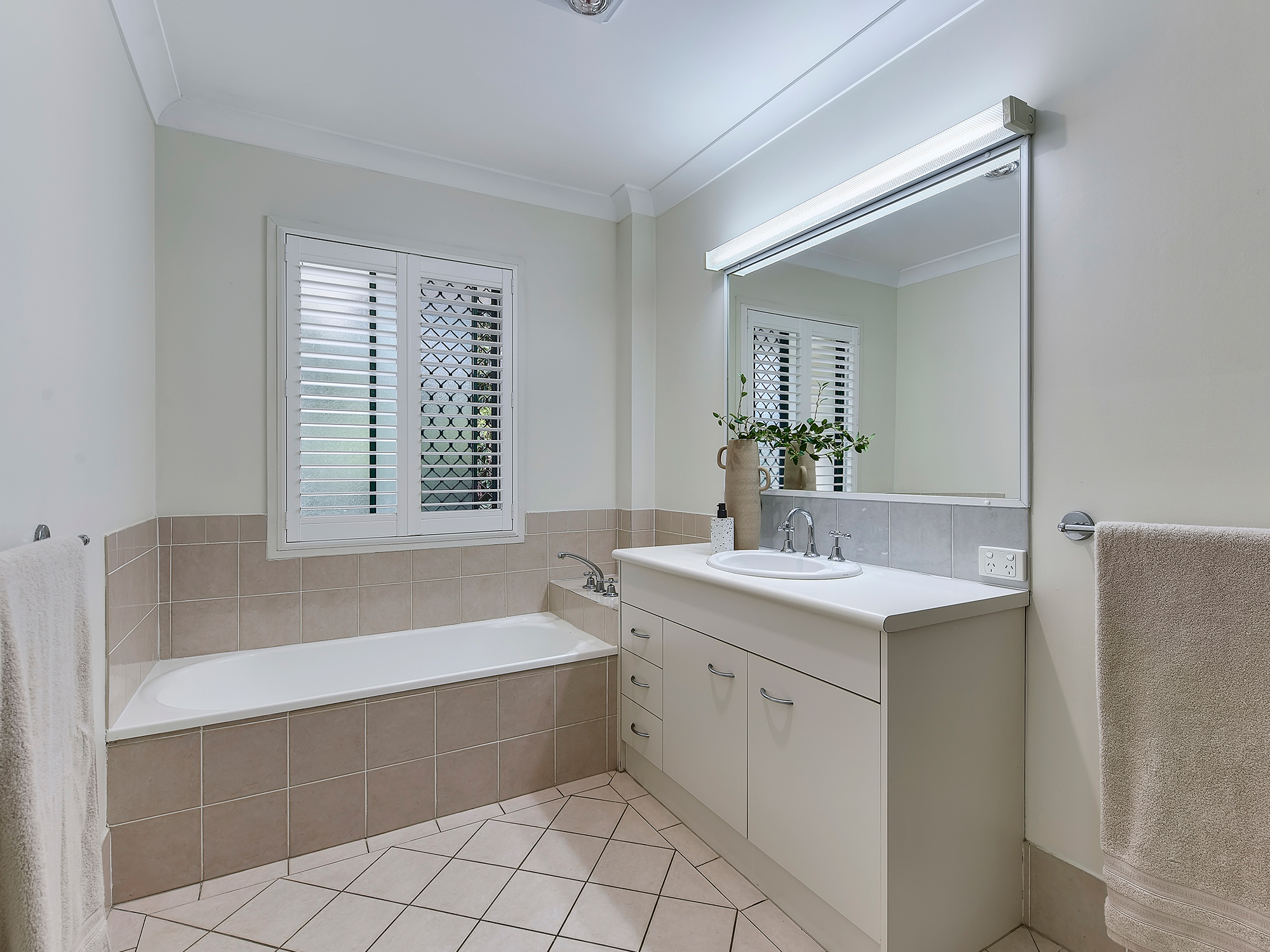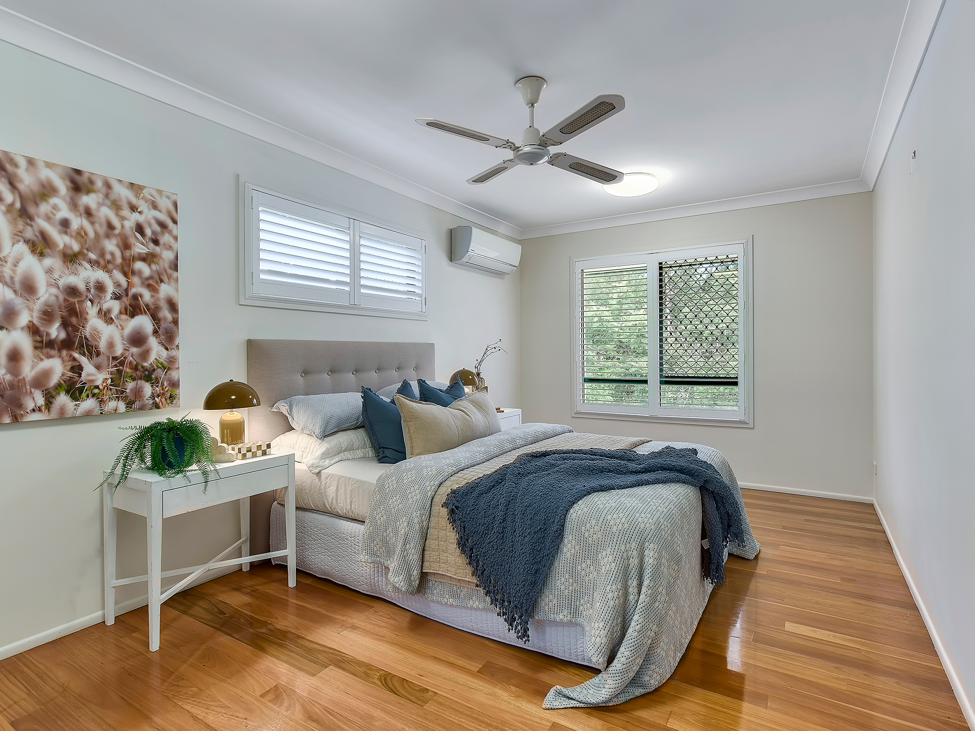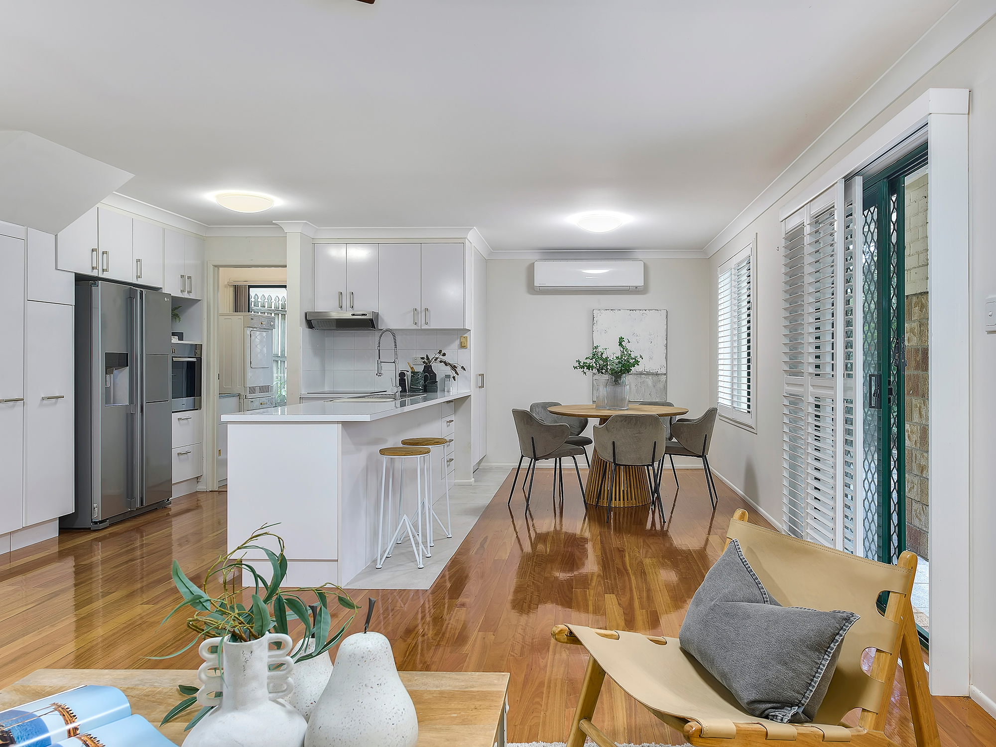 Gorgeous timber flooring, plantation shutters and a neutral palette bring timeless appeal to a light-filled open-plan interior, where living and dining enjoy air-conditioning and easy connection outdoors. The kitchen balances style and function with white cabinetry, generous storage, stainless appliances and expansive bench space with breakfast bar seating.