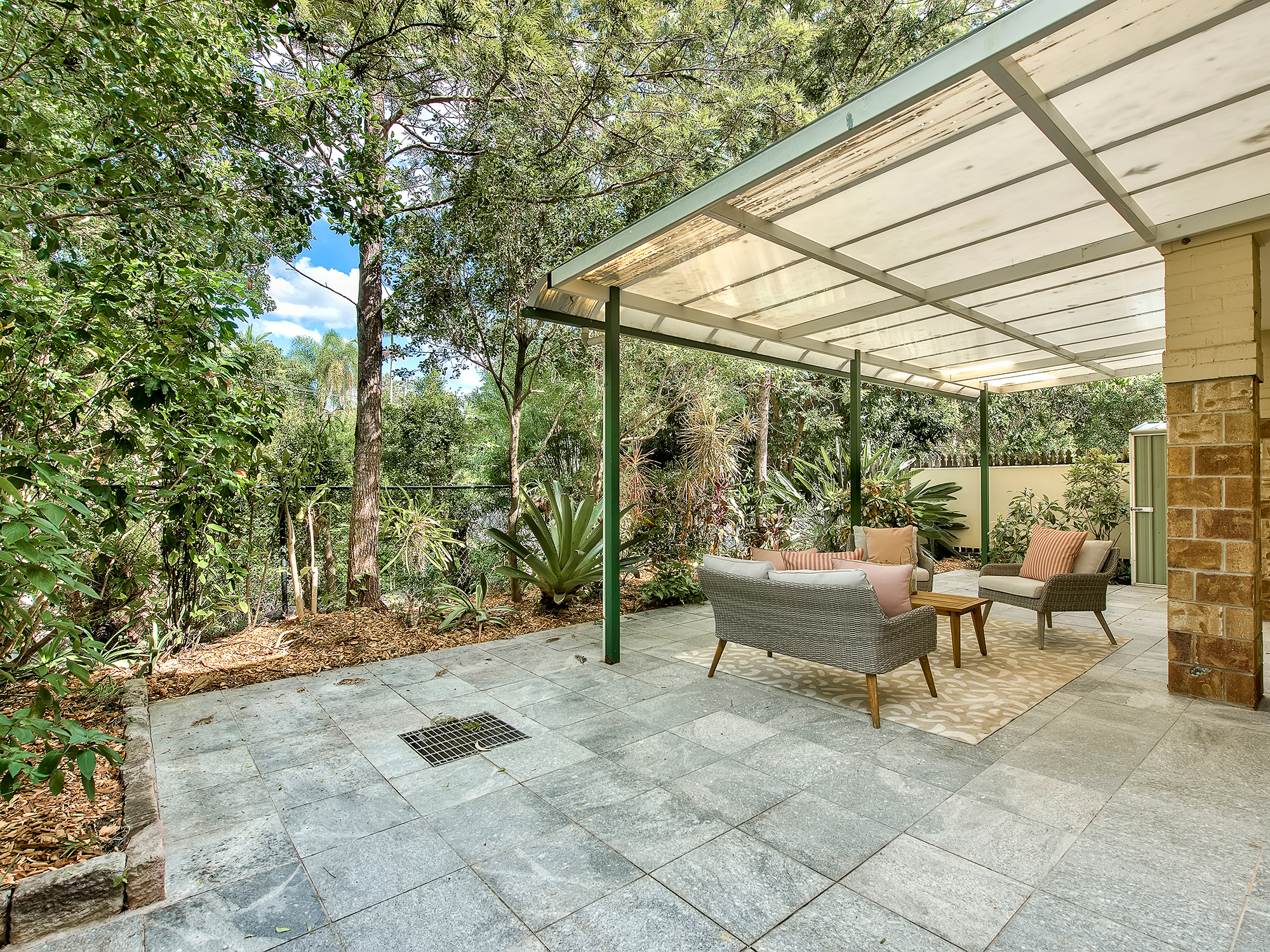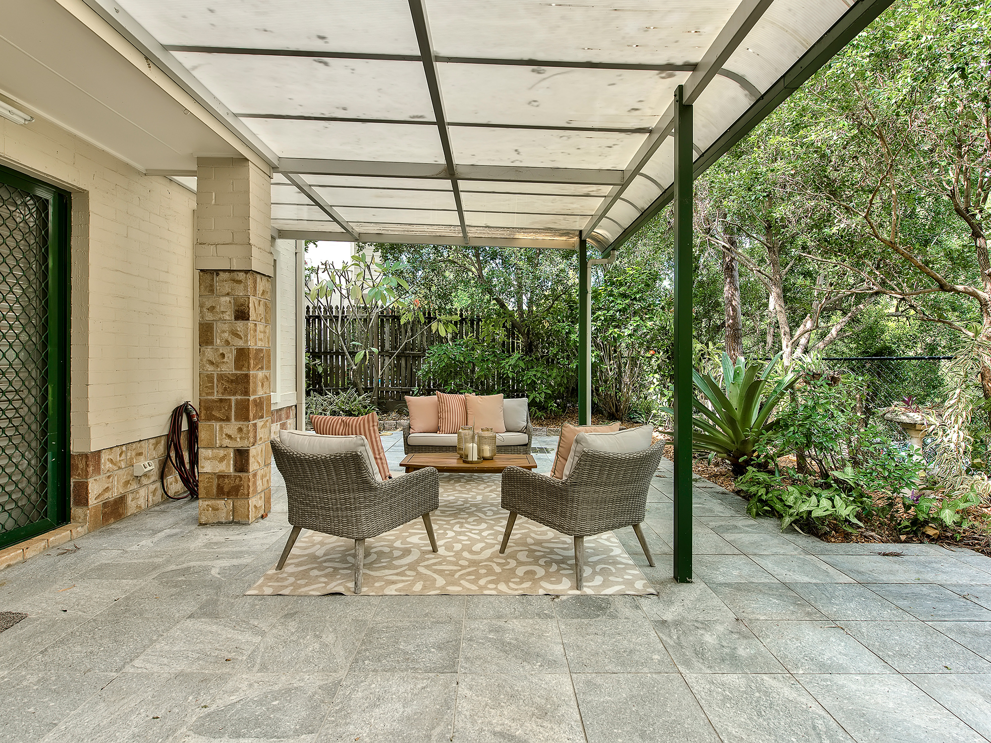 Sliding doors open to a large, private alfresco zone overlooking a lush, tree-lined outlook. Generously sized and stylishly paved, the space offers both covered and open-air entertaining, with surrounding landscaping designed for low-maintenance ease. Residents also enjoy access to excellent on-site facilities, including a tennis court and a large swimming pool with lounging.