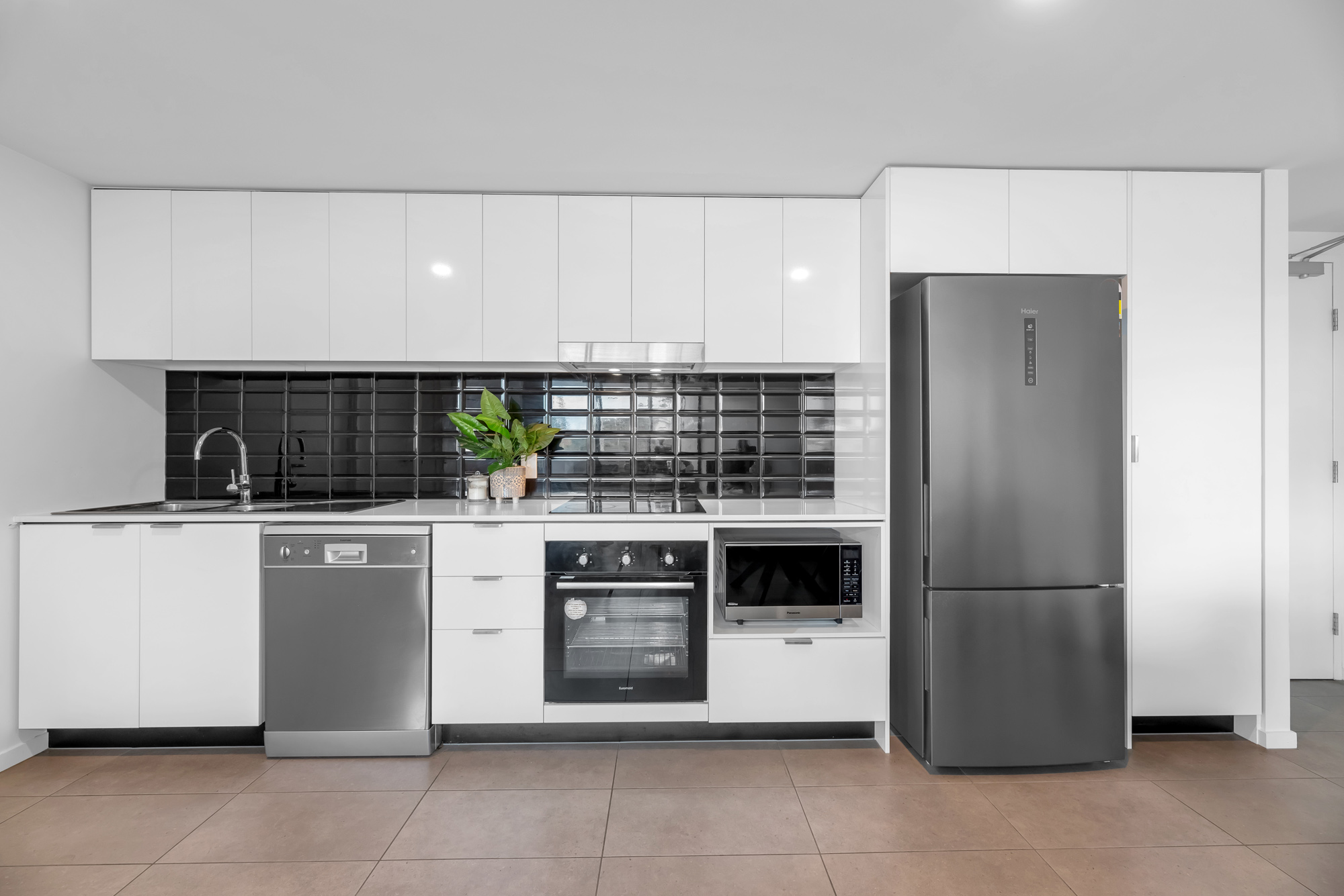 * Modern galley kitchen with Caesar stone bench top and stainless steel appliances including dishwasher