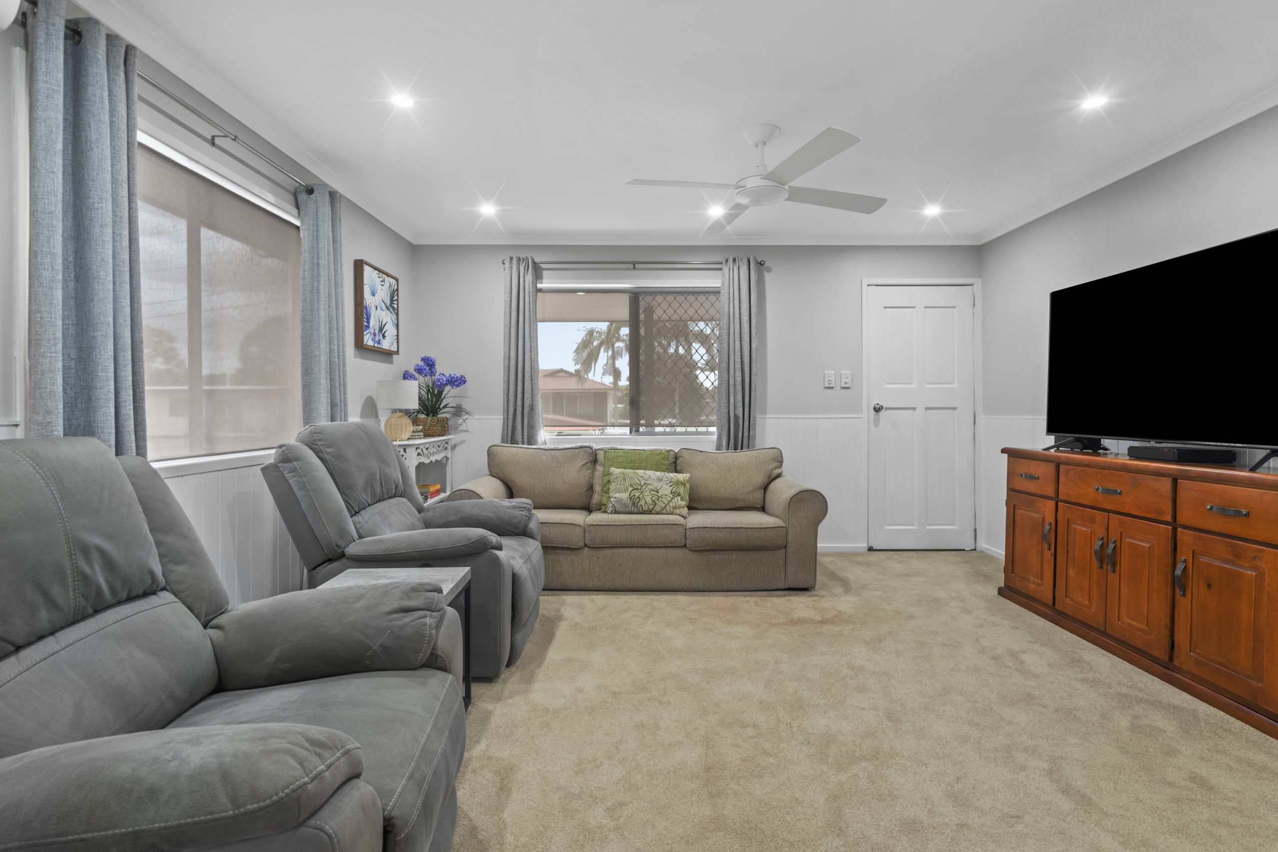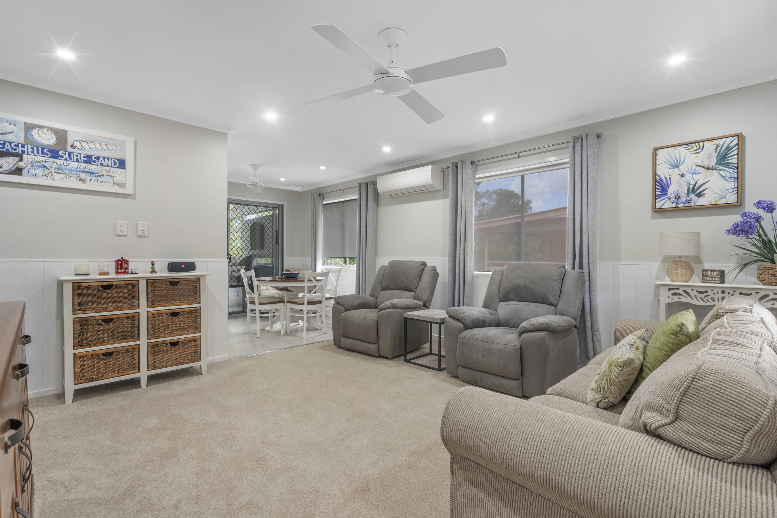 Spacious loungeroom with 7.1kW reverse cycle air conditioner and ceiling fan