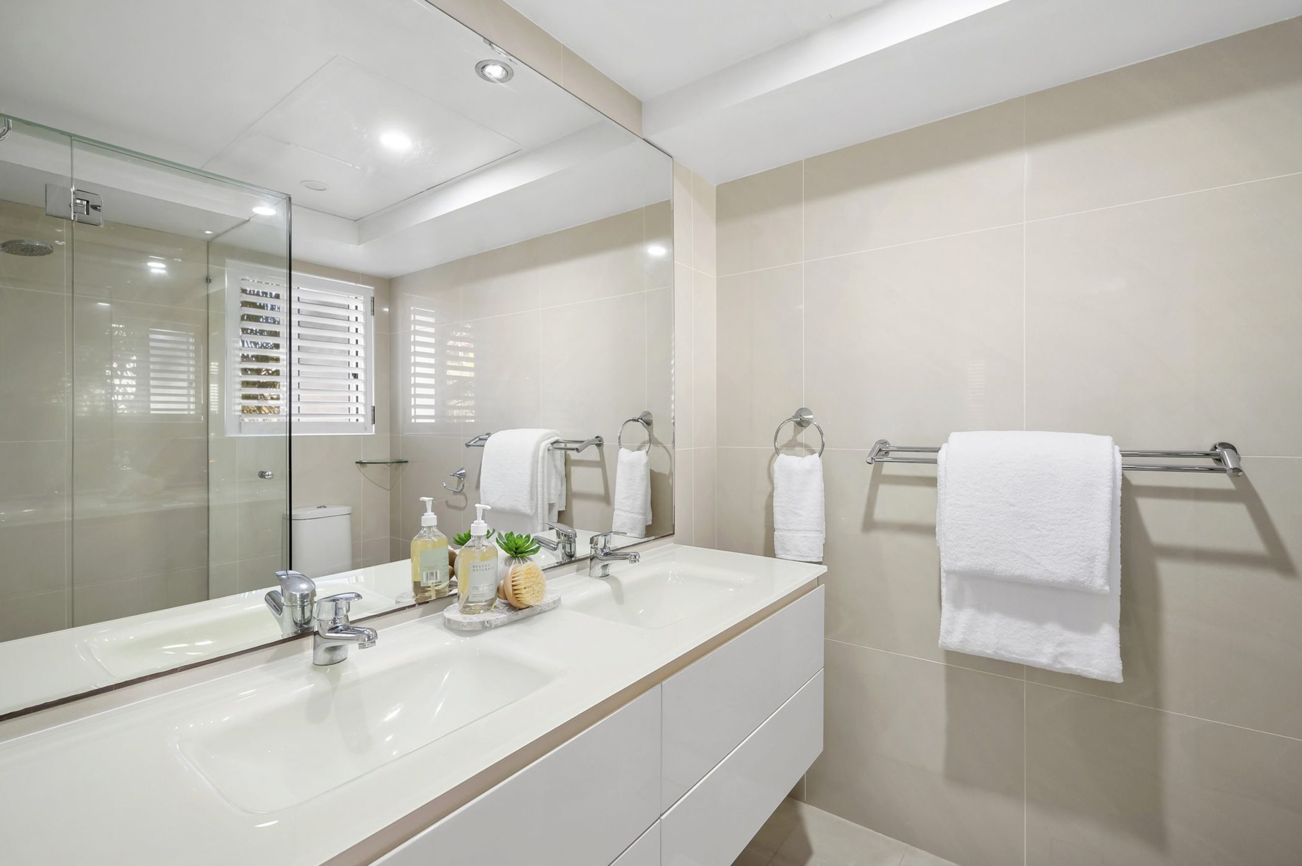 The residence features two spacious bedrooms, one with an ensuite, and a guest bathroom featuring floor-to-ceiling tiles and contemporary vanities. Plantation shutters and white timber blinds add character. Additional amenities include a well-equipped laundry with washer and dryer, two storage cupboards, an undercover parking space with a lockable shed, offering ample roof storage for kayaks and sup boards.