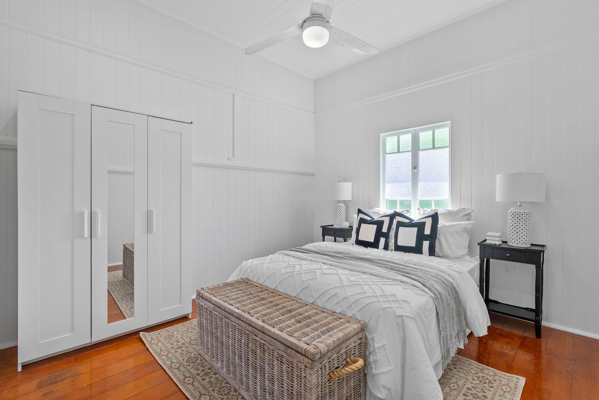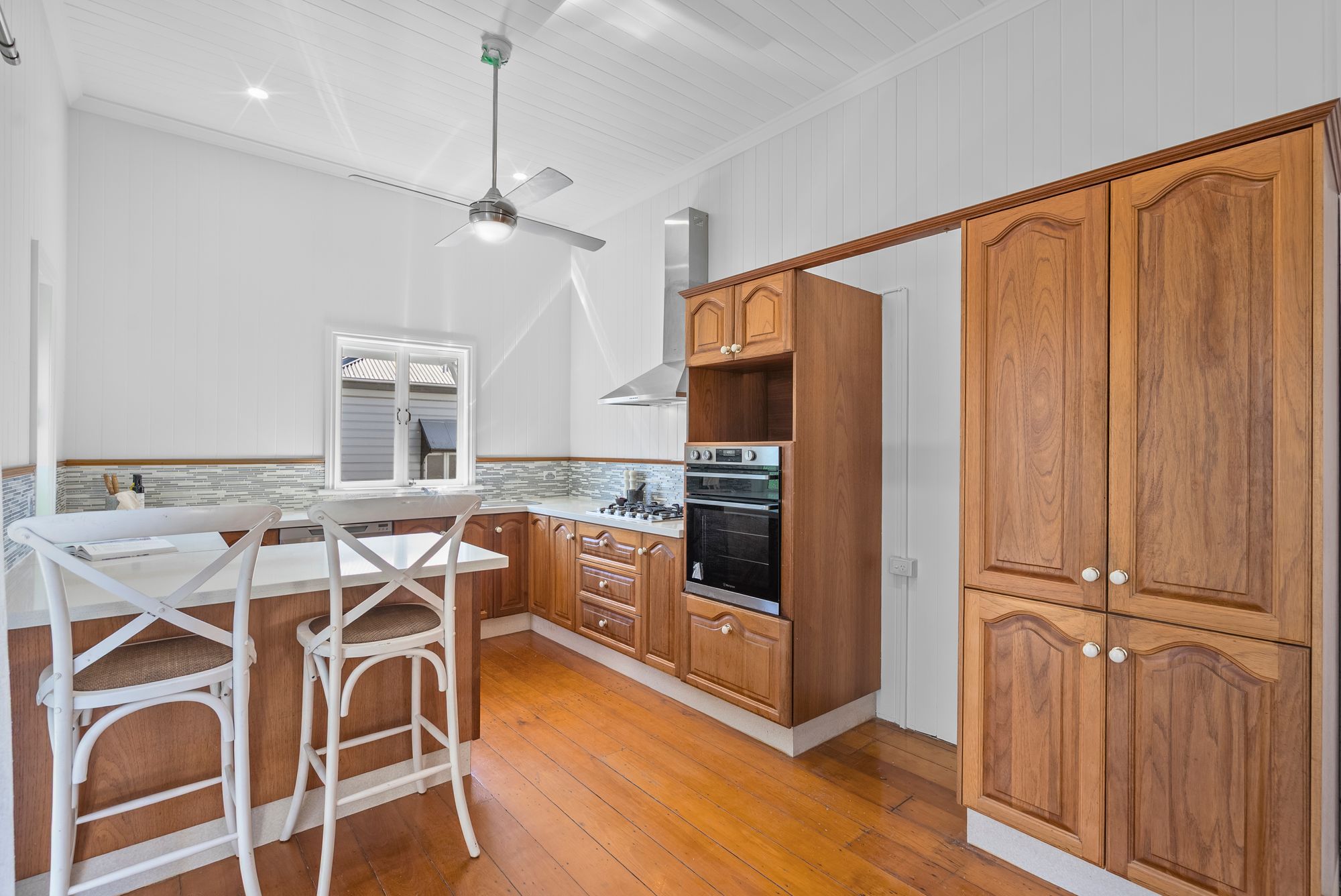 From the moment you arrive, the classic elevated façade makes a lasting impression, showcasing the proud heritage of this original Queenslander. Upstairs, you’re welcomed into a home bathed in natural light, where soaring ceilings, original VJ panelling, intricate mouldings, and stunning timber flooring create a sense of warmth, space, and elegance. The open-plan living and dining area flows effortlessly into the heart of the home-a beautiful kitchen featuring a gas cooktop, oven, sleek cabinetry, and spacious benchtops. Ceiling fans and a split-system air conditioner ensure comfort throughout the seasons, while large windows frame the leafy outlook and flood the home with soft, natural light.