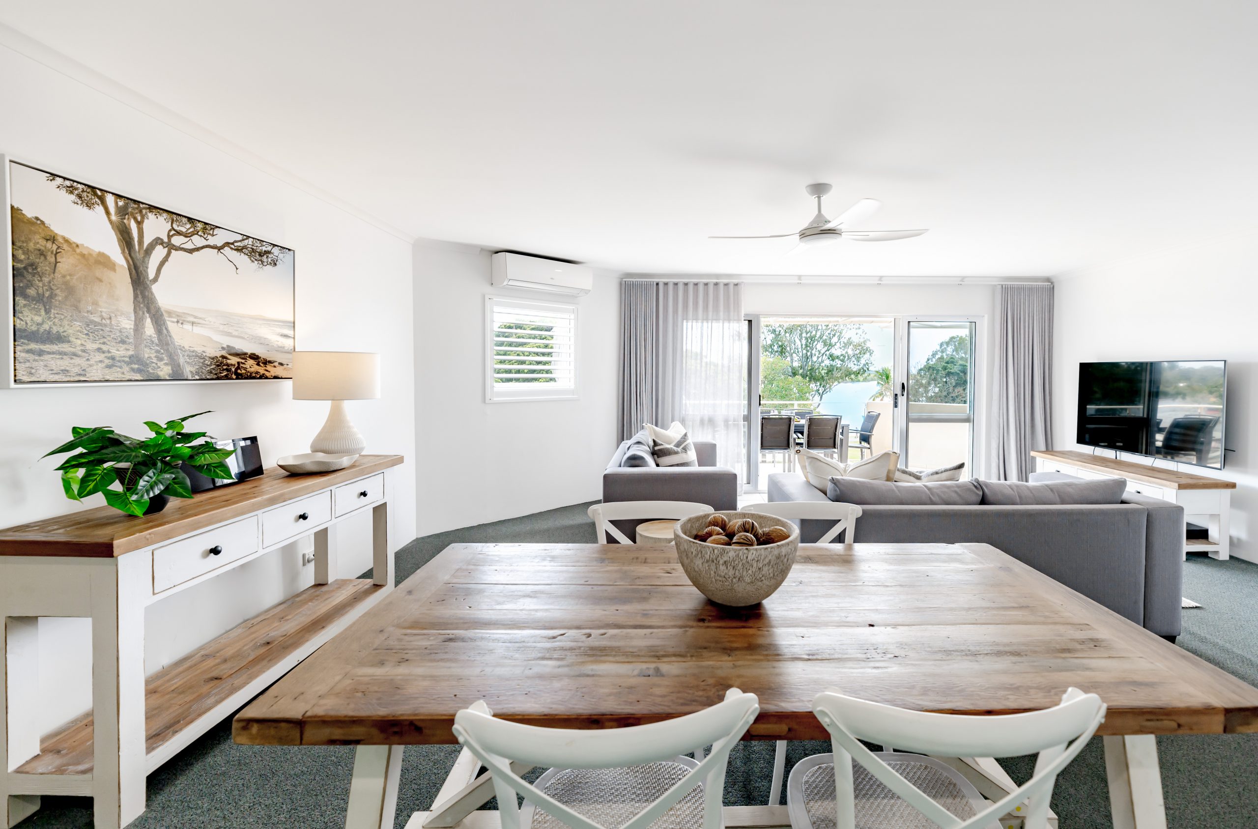 The open plan living and dining is a space of rest and retreat, while the north facing alfresco balcony extends lounging and dining into the fresh air, providing the perfect backdrop for year-round entertaining with expansive wide water views.