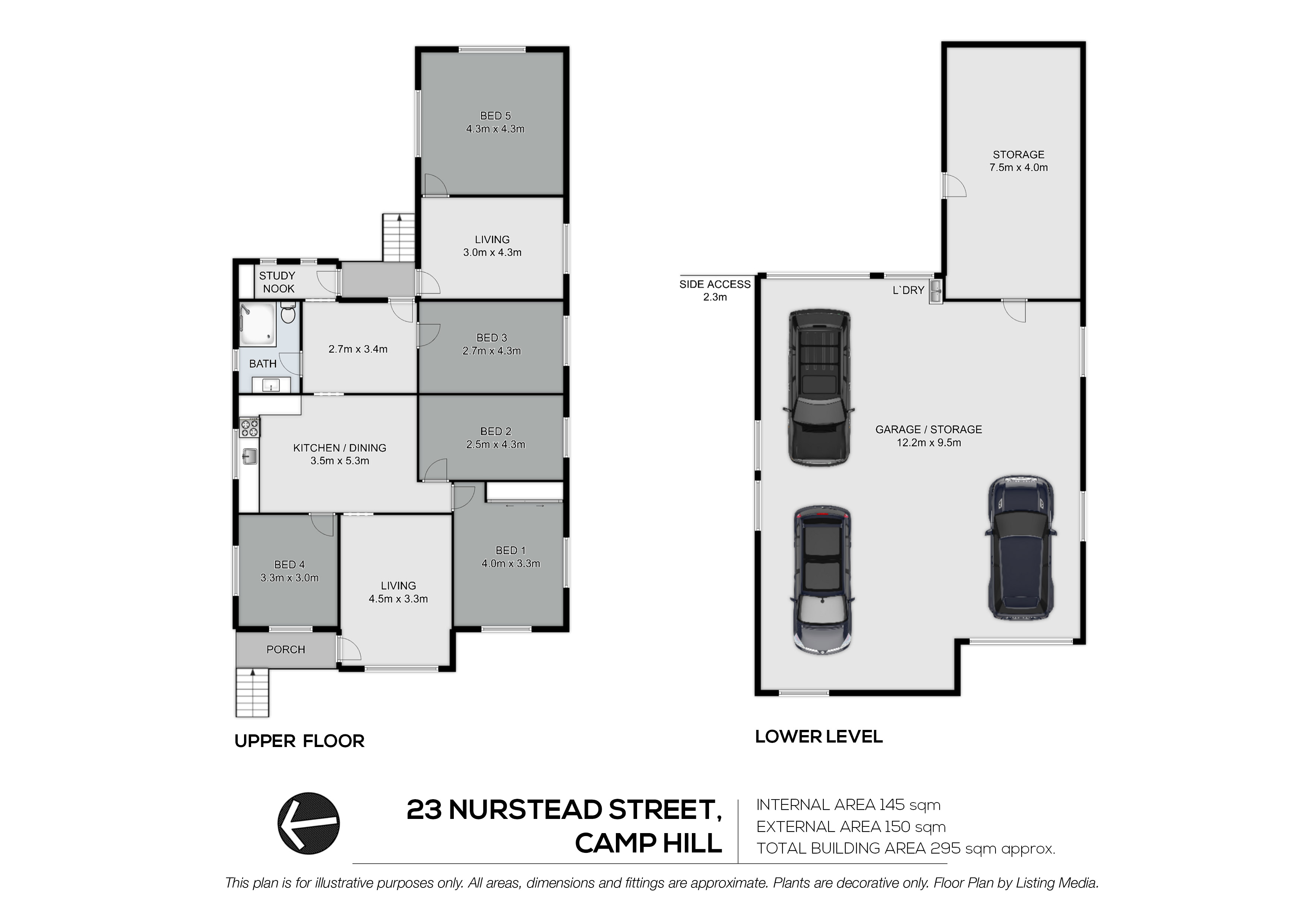 Downstairs, the home offers outstanding utility, including secure parking for three cars, a separate laundry, and an expansive 7.5m x 4m storage area