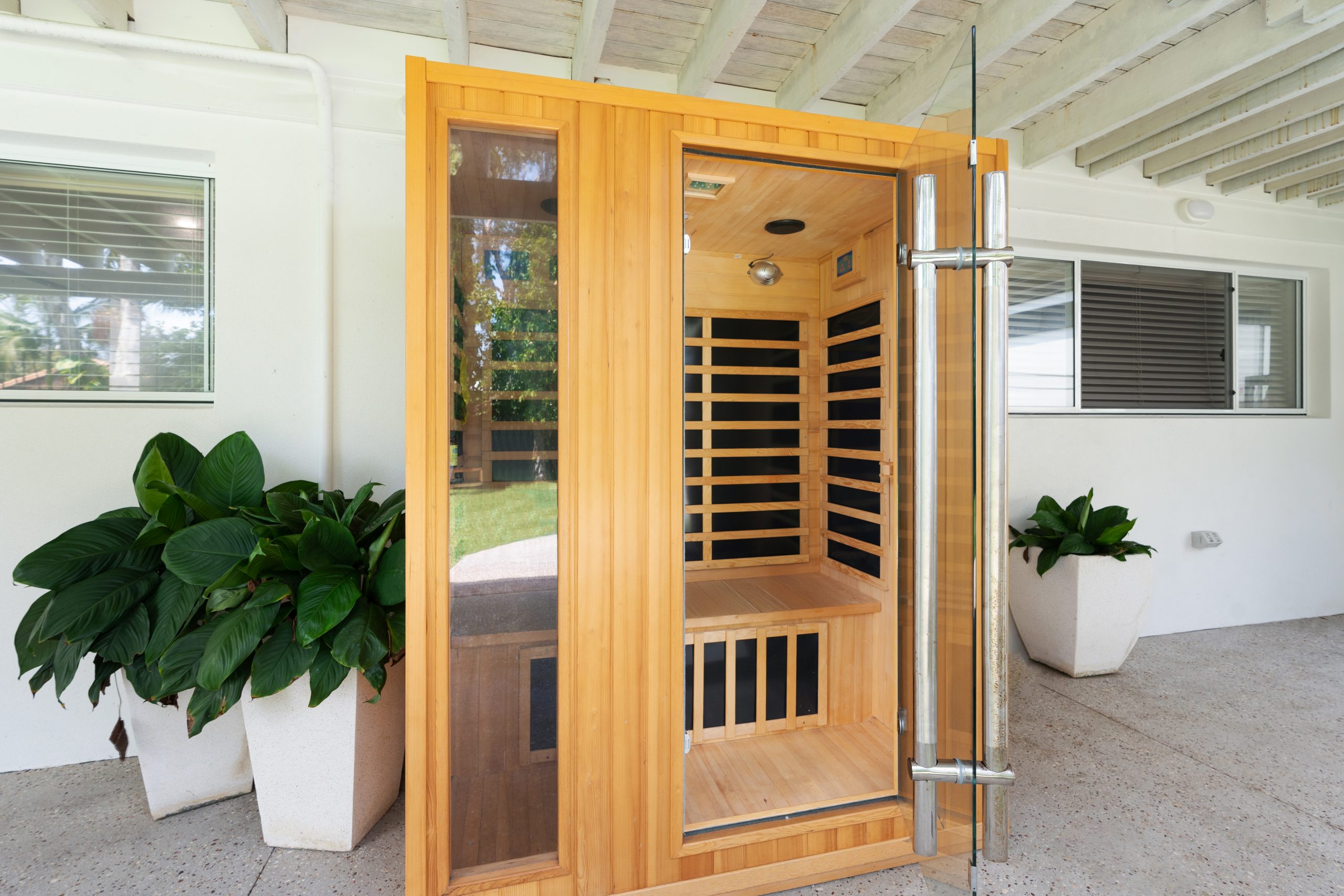 Sparkling salt water pool, a sauna, and level garden perfect for children or dogs to play