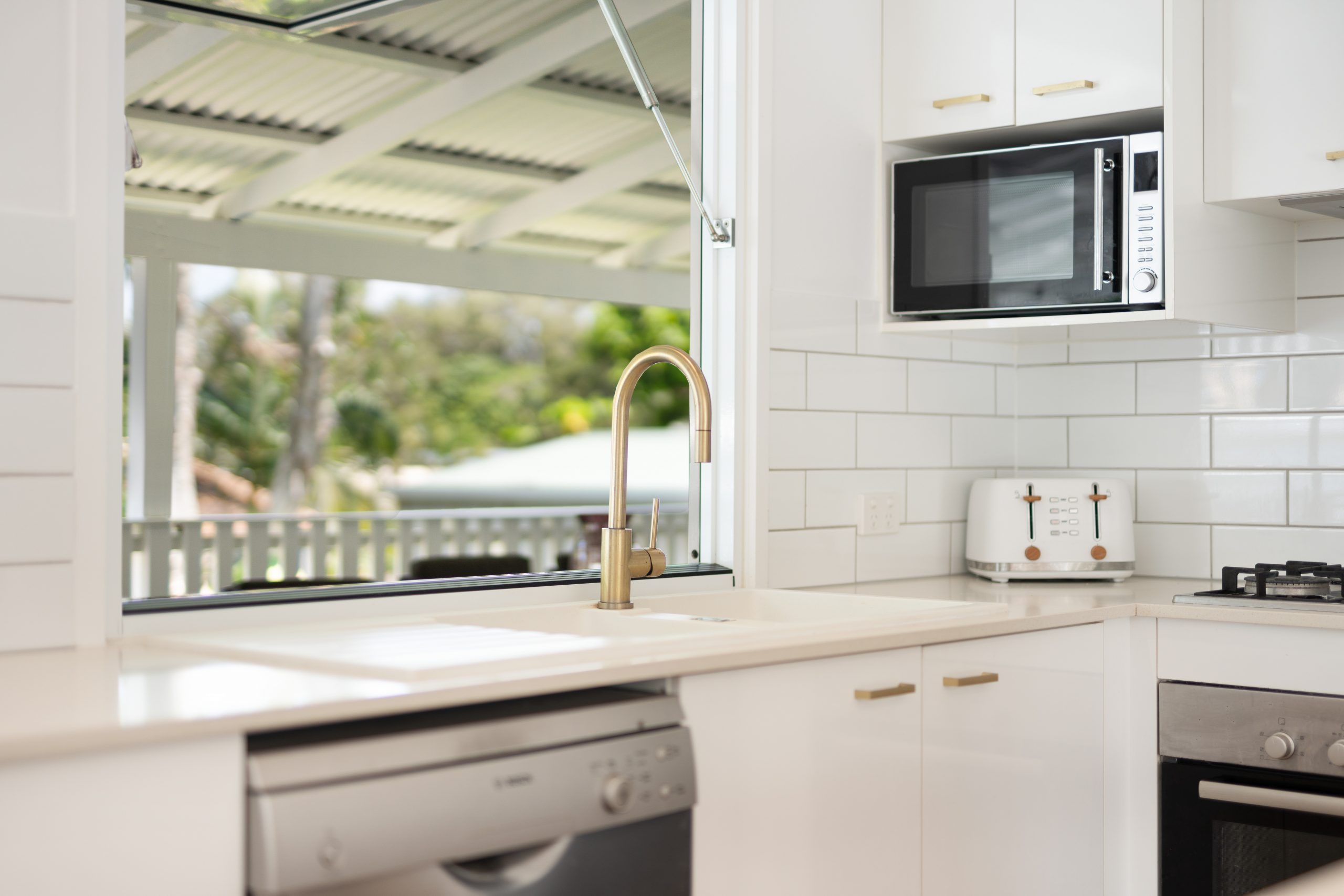 Kitchen with Bosch appliances including gas cooktop, dishwasher, WIP and servery window to deck