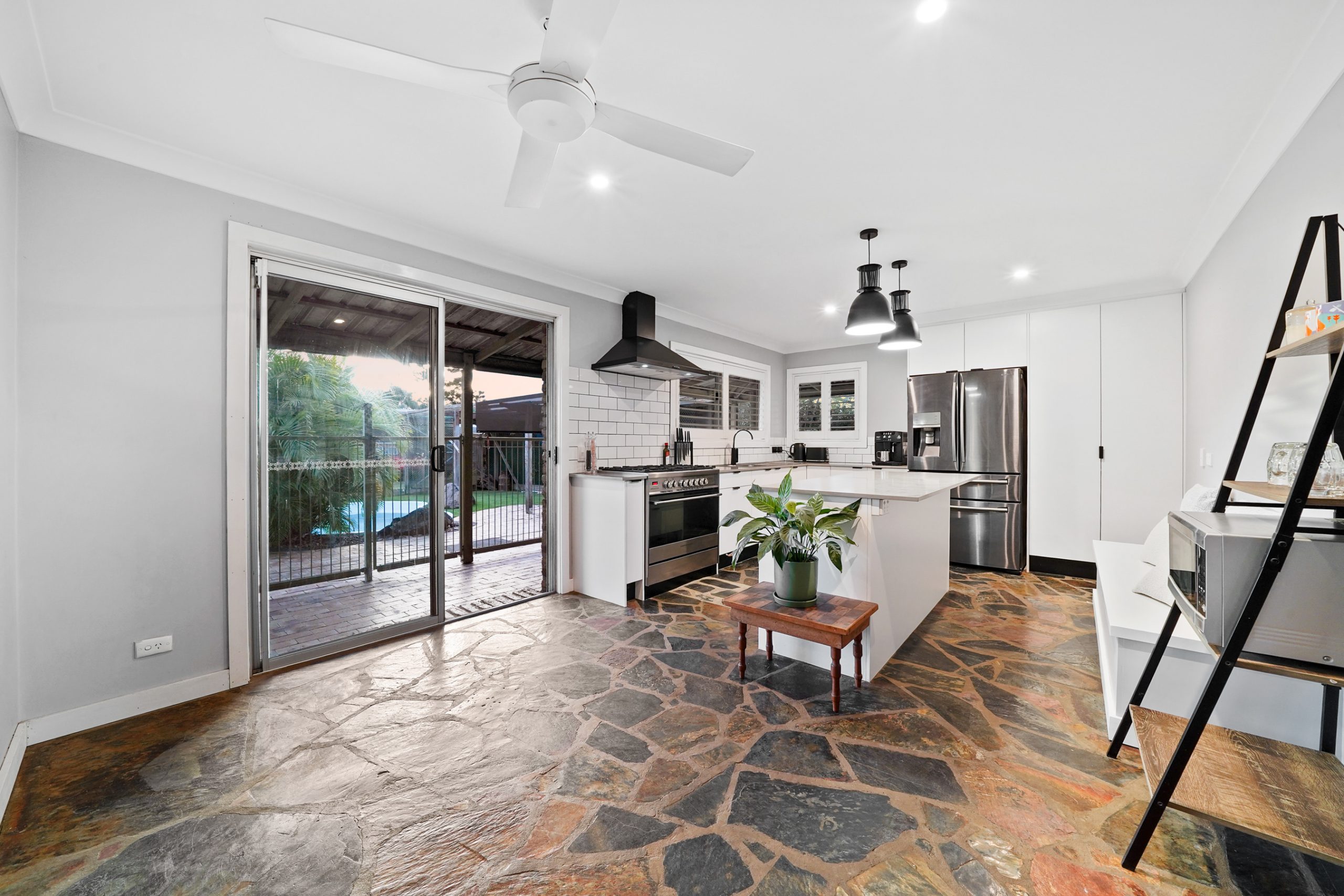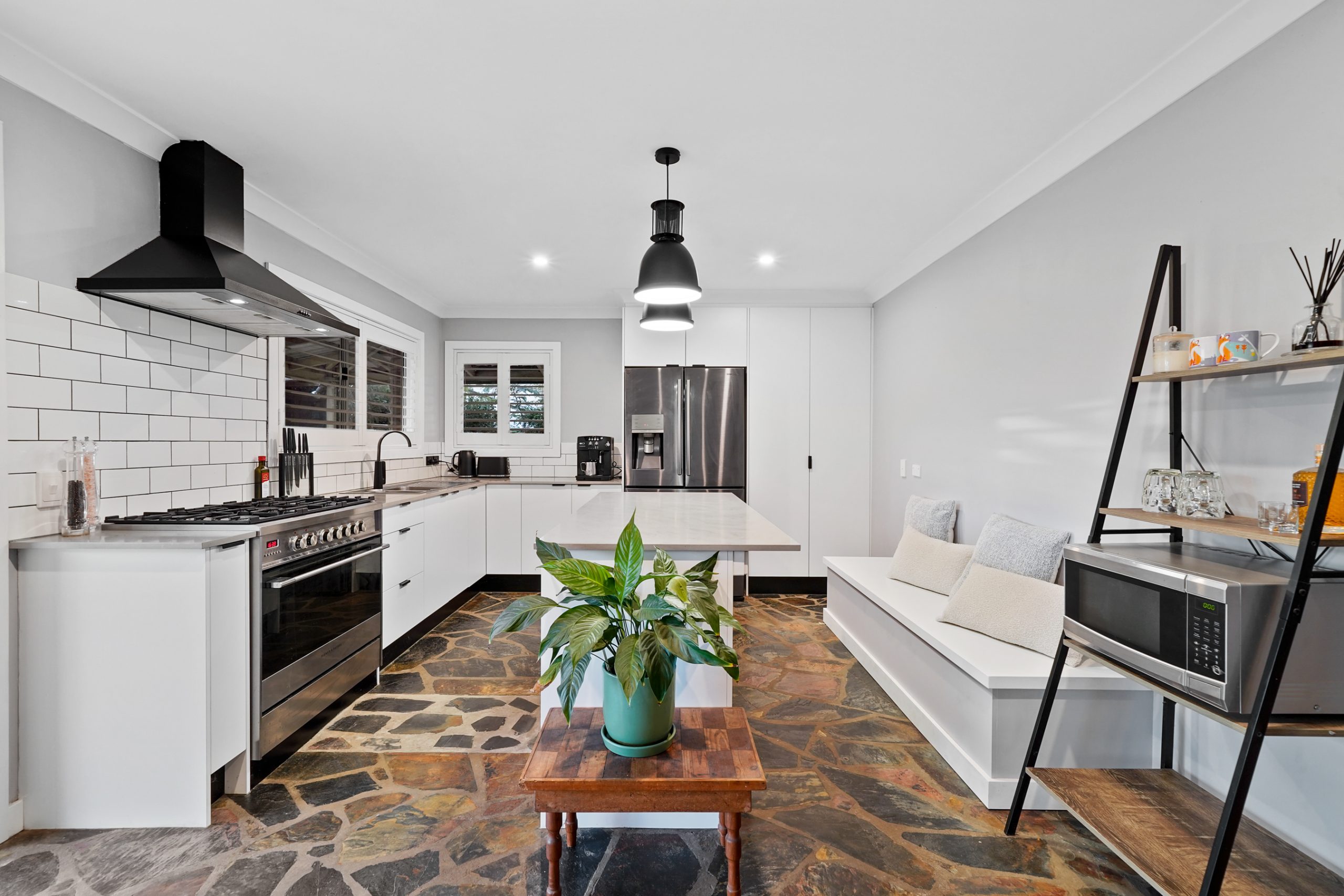 • Large modern kitchen with stone benchtops, black pendant lighting, 900mm gas cooktop and oven, island bench with seating and storage