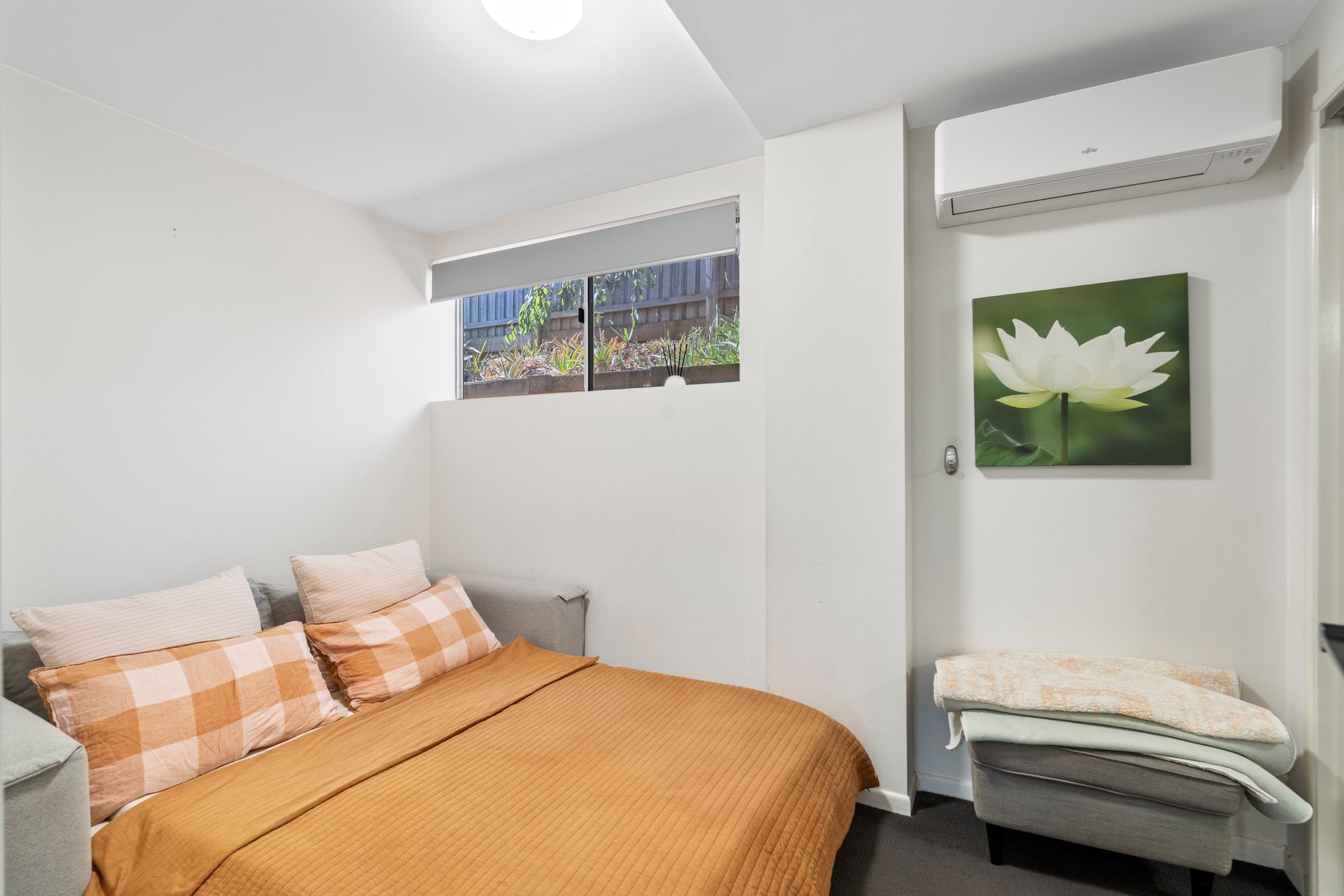 * Bedrooms: 2 additional carpeted bedrooms, with one featuring individual air-conditioning.