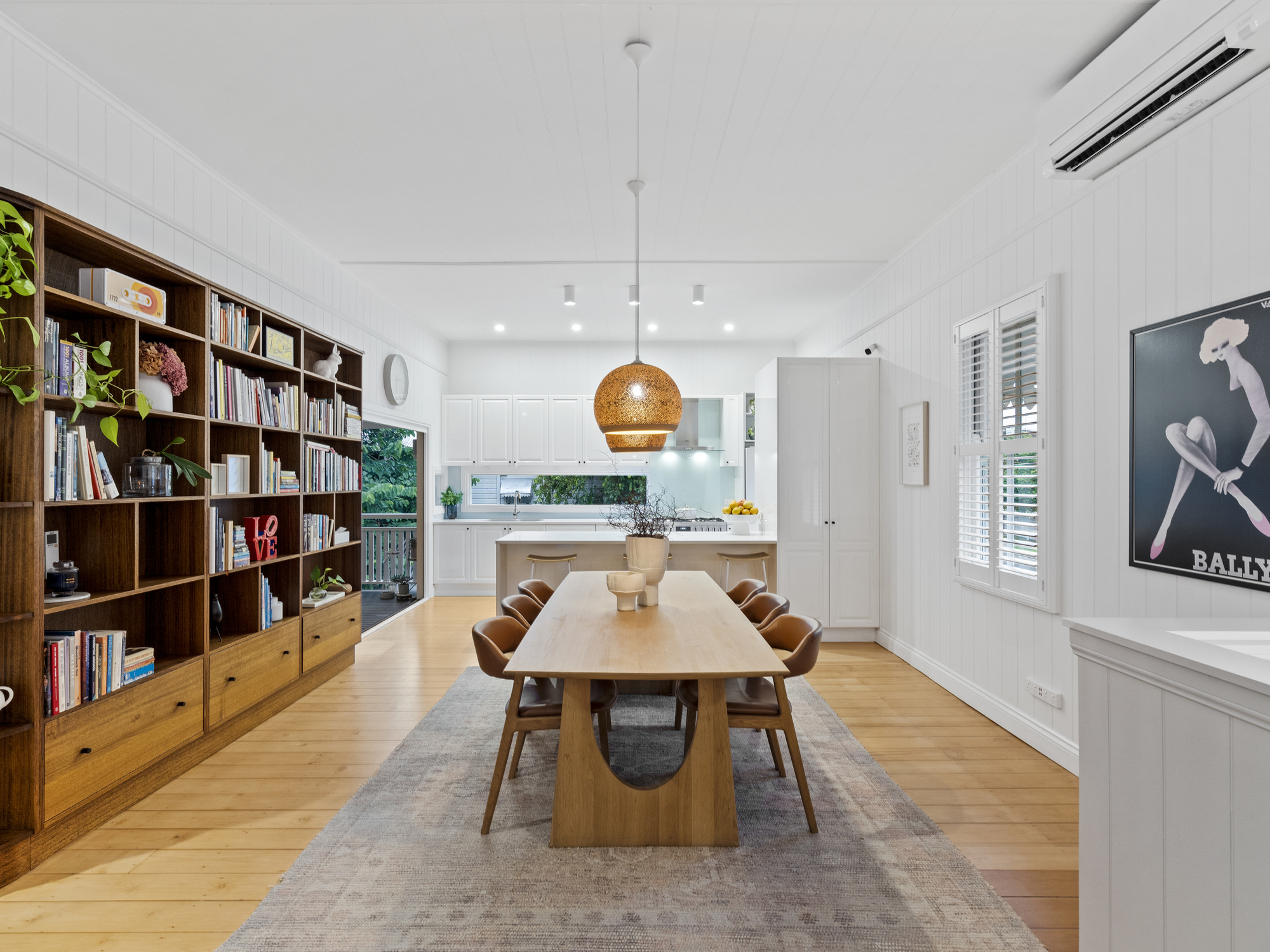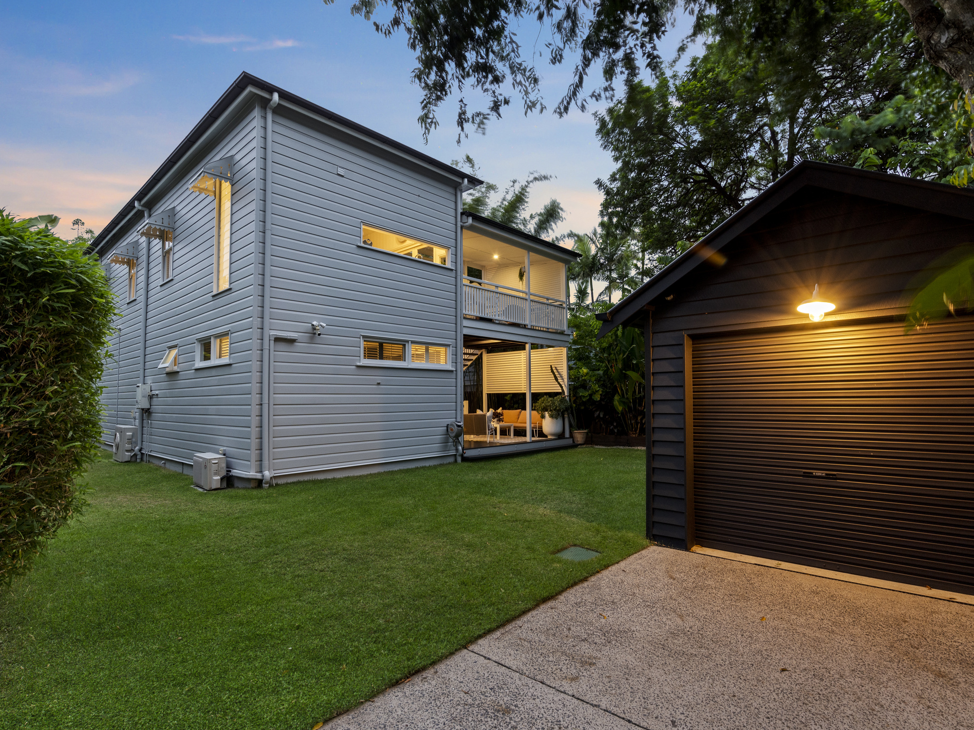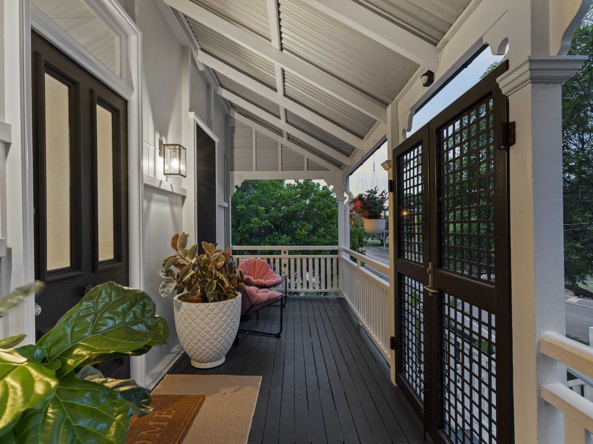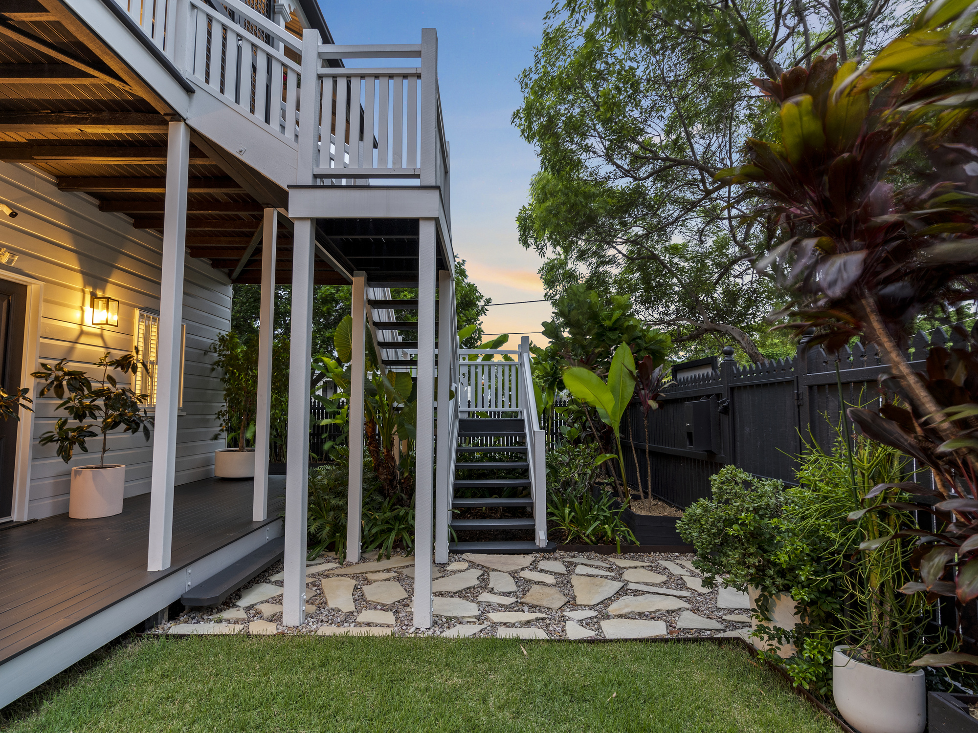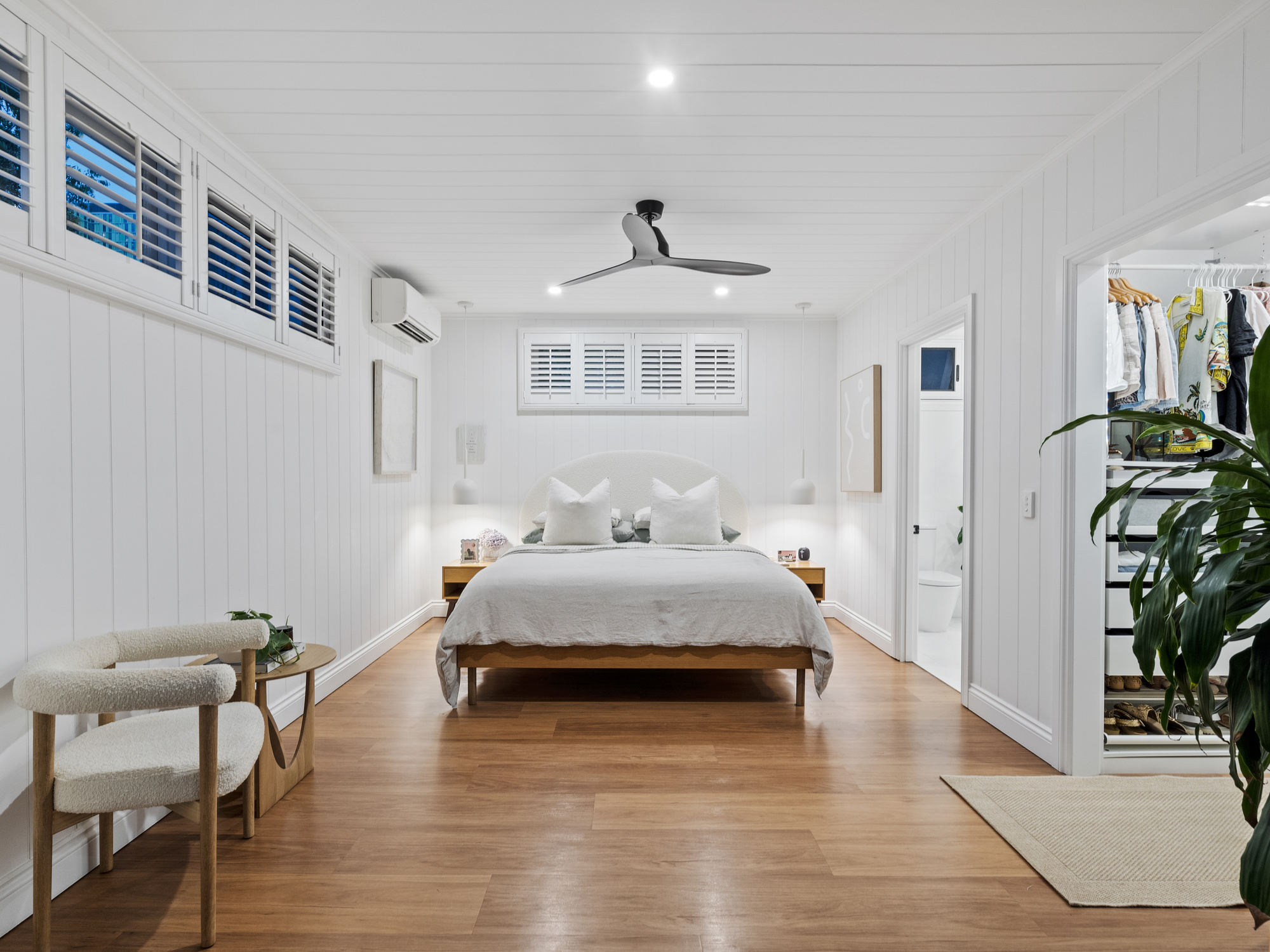 Behind its classic weatherboard façade this flawlessly presented interwar Queenslander blends heritage warmth with contemporary comfort across two thoughtfully renovated levels. Fully raised and built under, the residence offers rare flexibility with a generously proportioned fourth bedroom/retreat providing endless possibilities for a dual living option, private studio, cinema room or a home business space (STCA). Character design elements shine throughout, including wide timber flooring, ornate breezeways, high ceilings and VJ walls, all paired with the benefits of a flood-free block and beautifully landscaped low maintenance tropical surrounds.