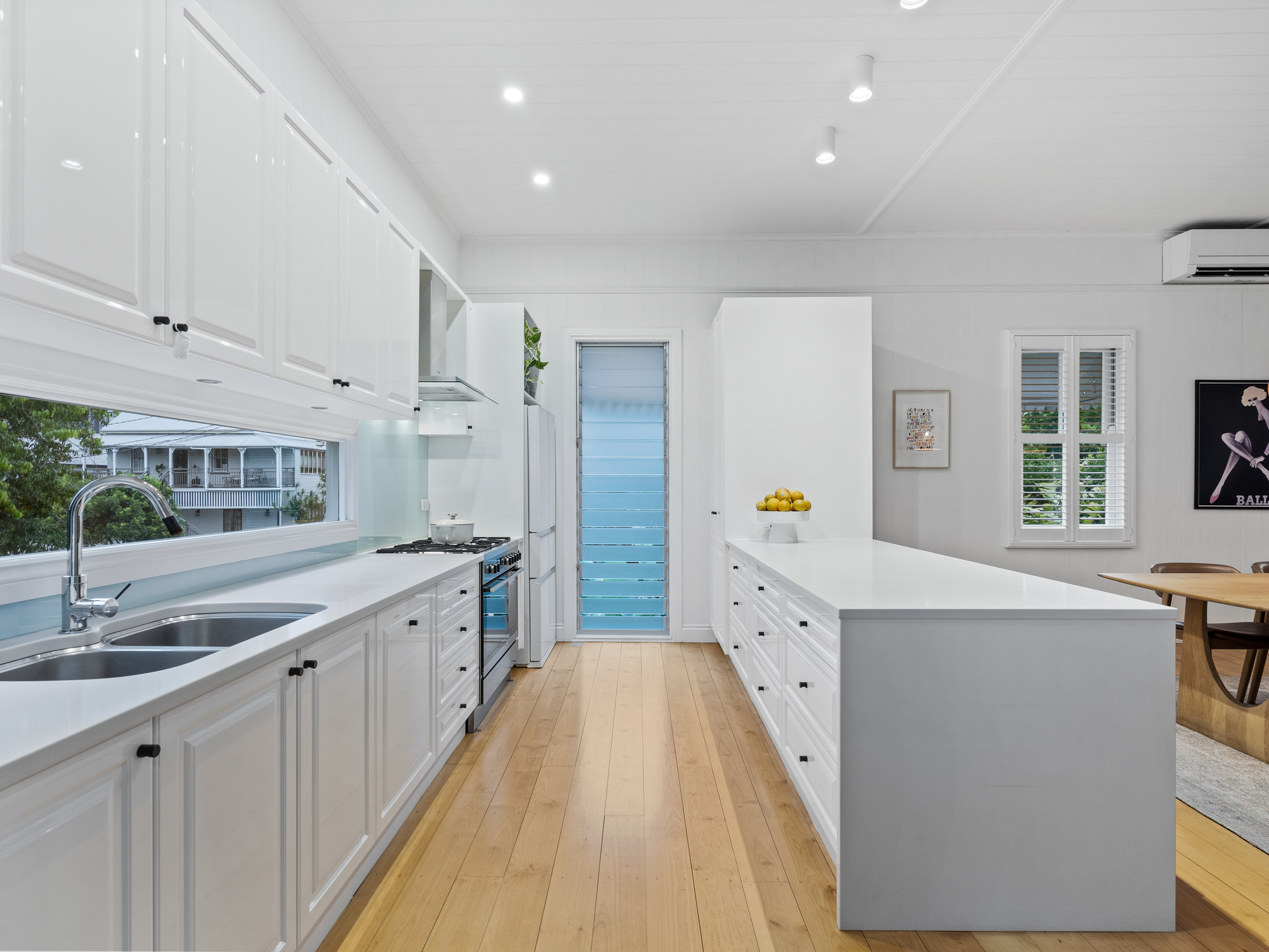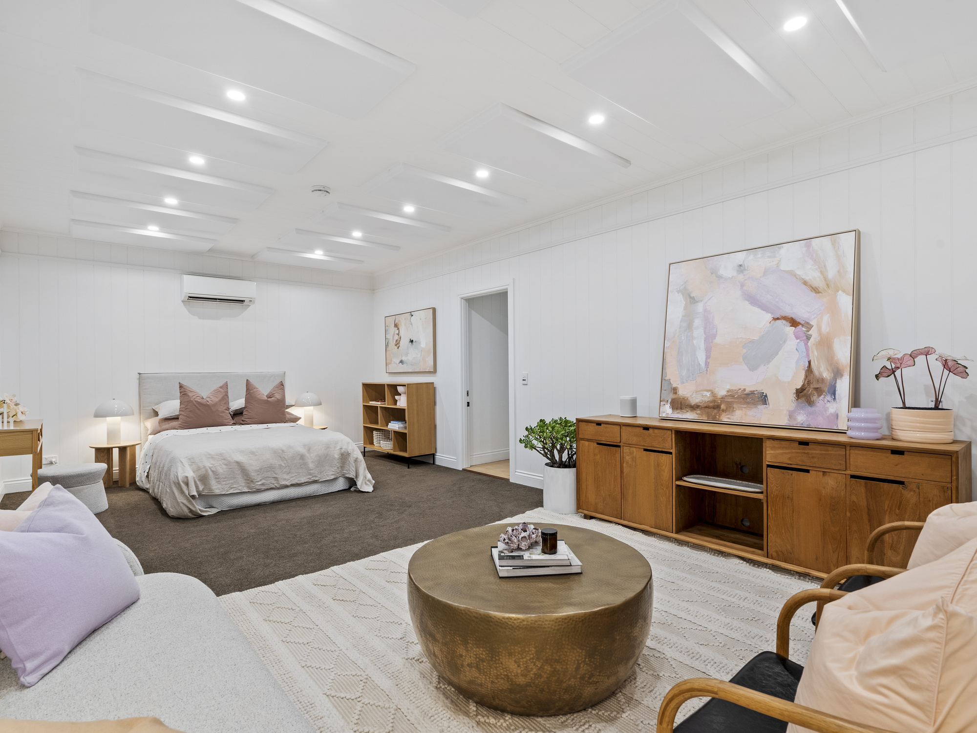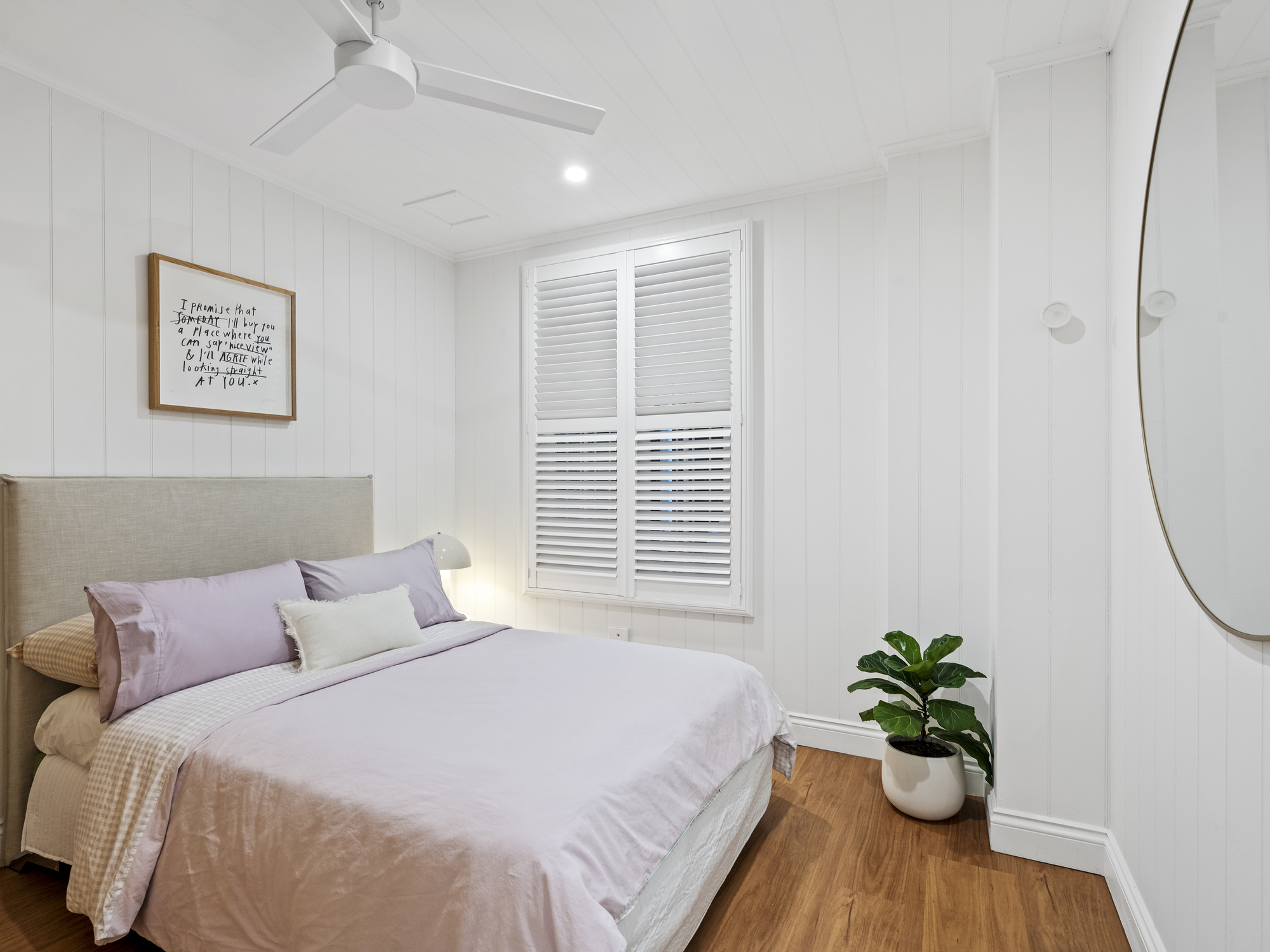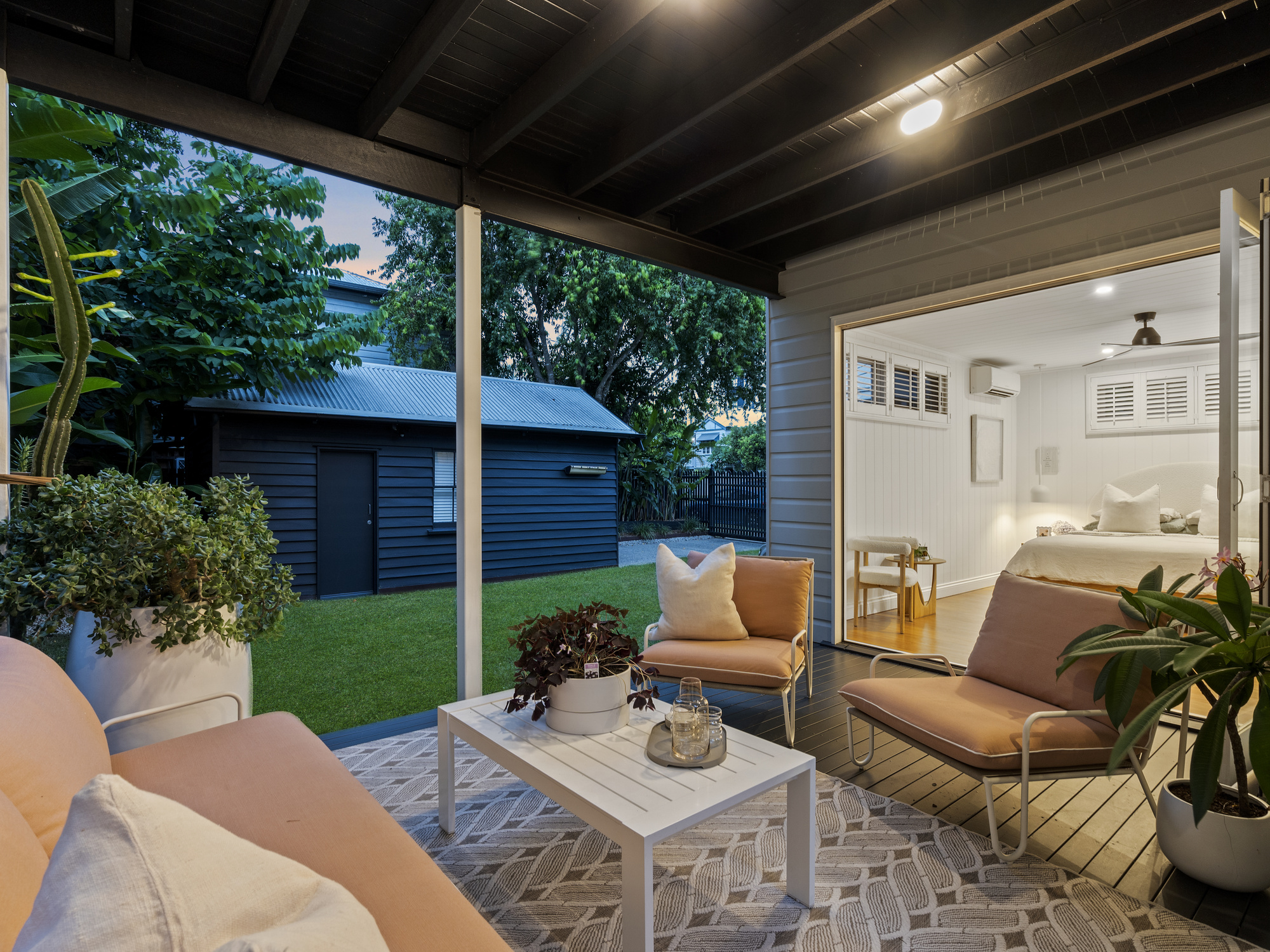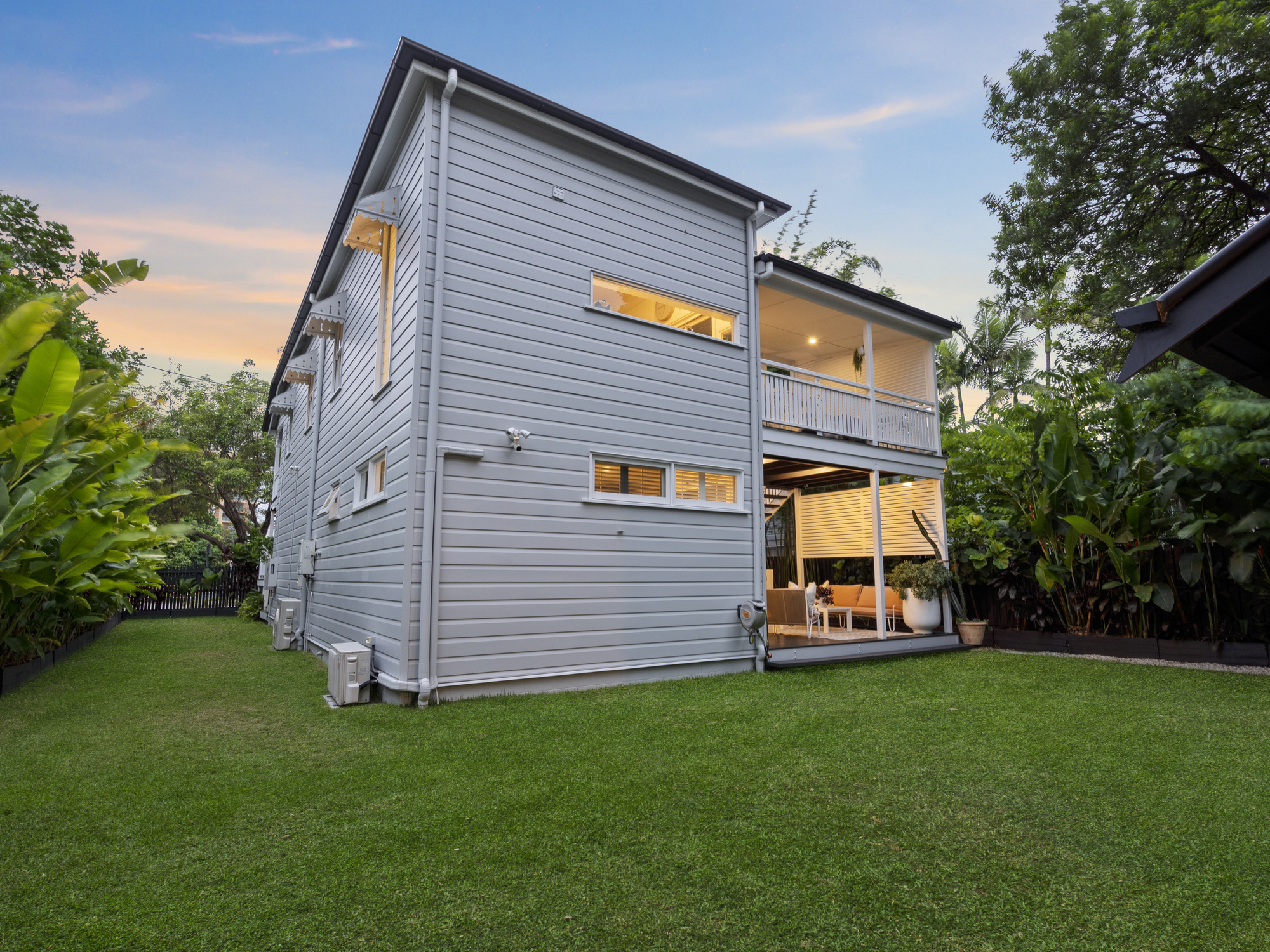 Behind its classic weatherboard façade this flawlessly presented interwar Queenslander blends heritage warmth with contemporary comfort across two thoughtfully renovated levels. Fully raised and built under, the residence offers rare flexibility with a generously proportioned fourth bedroom/retreat providing endless possibilities for a dual living option, private studio, cinema room or a home business space (STCA). Character design elements shine throughout, including wide timber flooring, ornate breezeways, high ceilings and VJ walls, all paired with the benefits of a flood-free block and beautifully landscaped low maintenance tropical surrounds.