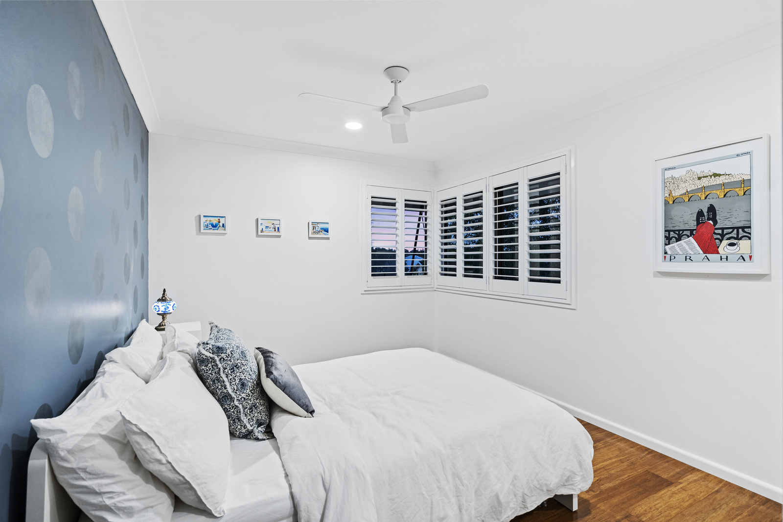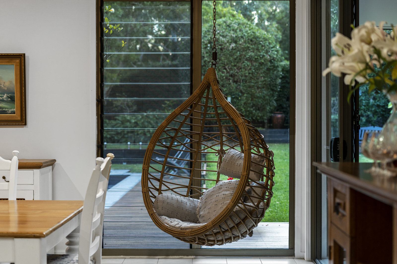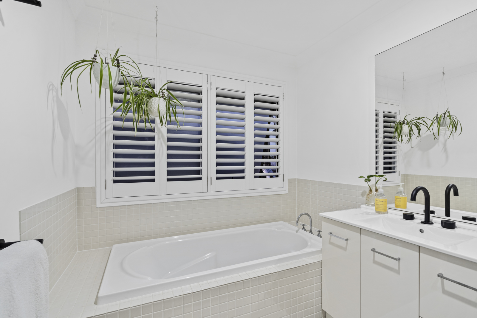 Throughout the home, plantation shutters and louvre windows invite soft breezes and dappled light, adding a touch of timeless style and enhancing the sense of connection with the gardens outside.