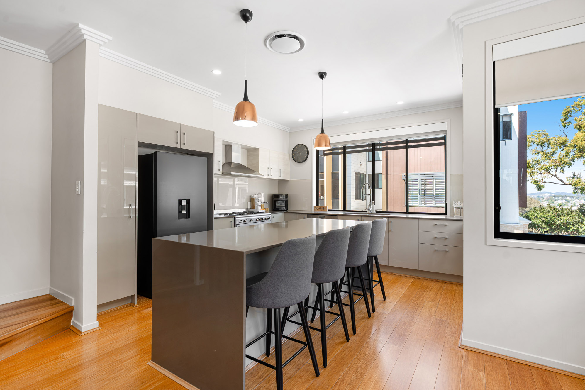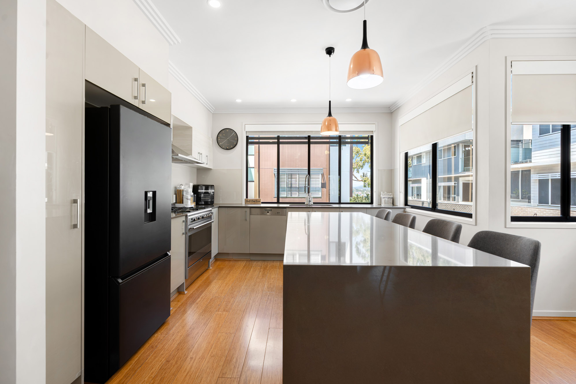 • Gourmet kitchen with Smeg gas cooktop, Miele dishwasher, externally ducted rangehood, pendant lighting and generous stone-topped benches