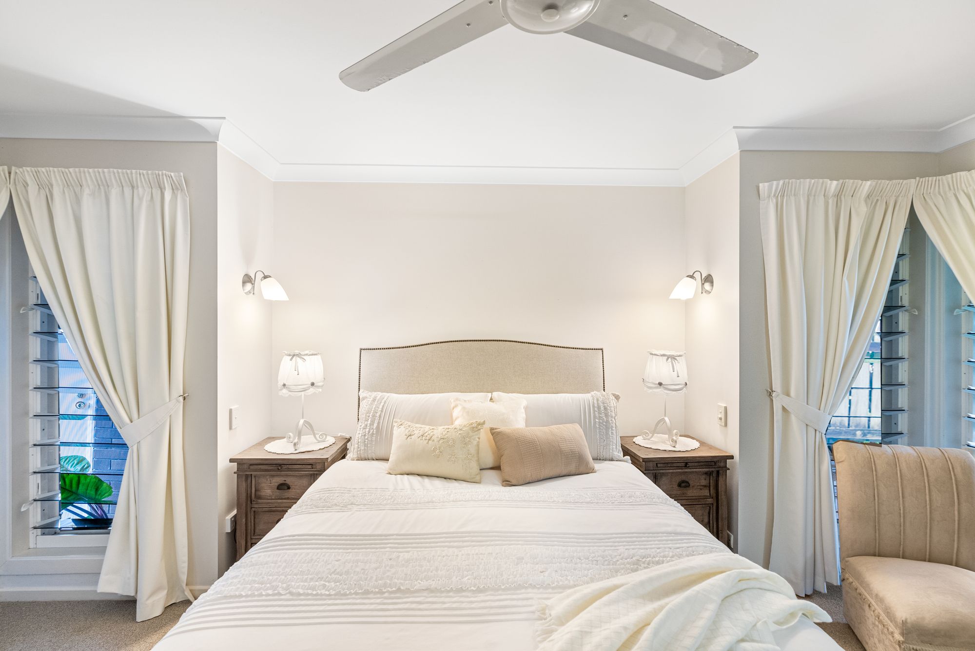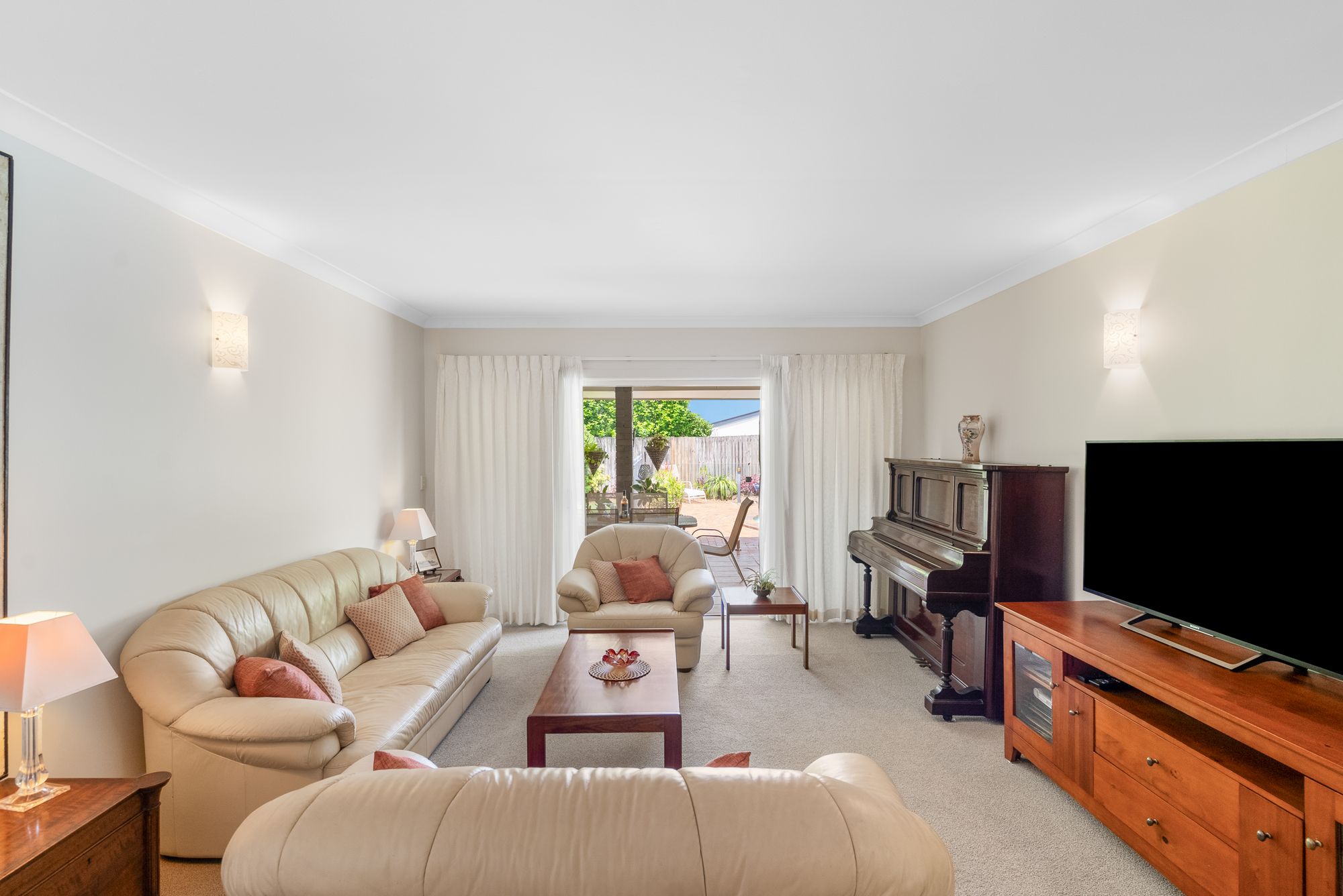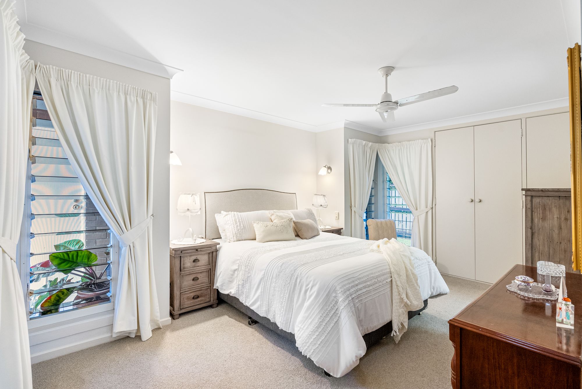 The main bedroom offers a private ensuite, built-in wardrobes, and is located separate from the rest of the bedrooms creating a comfortable retreat. Additional bedrooms are equally well-appointed, with built-ins and ceiling fans. The bathroom features a bathtub and a separate toilet for convenience, while the laundry provides plenty of storage and direct access to the backyard.