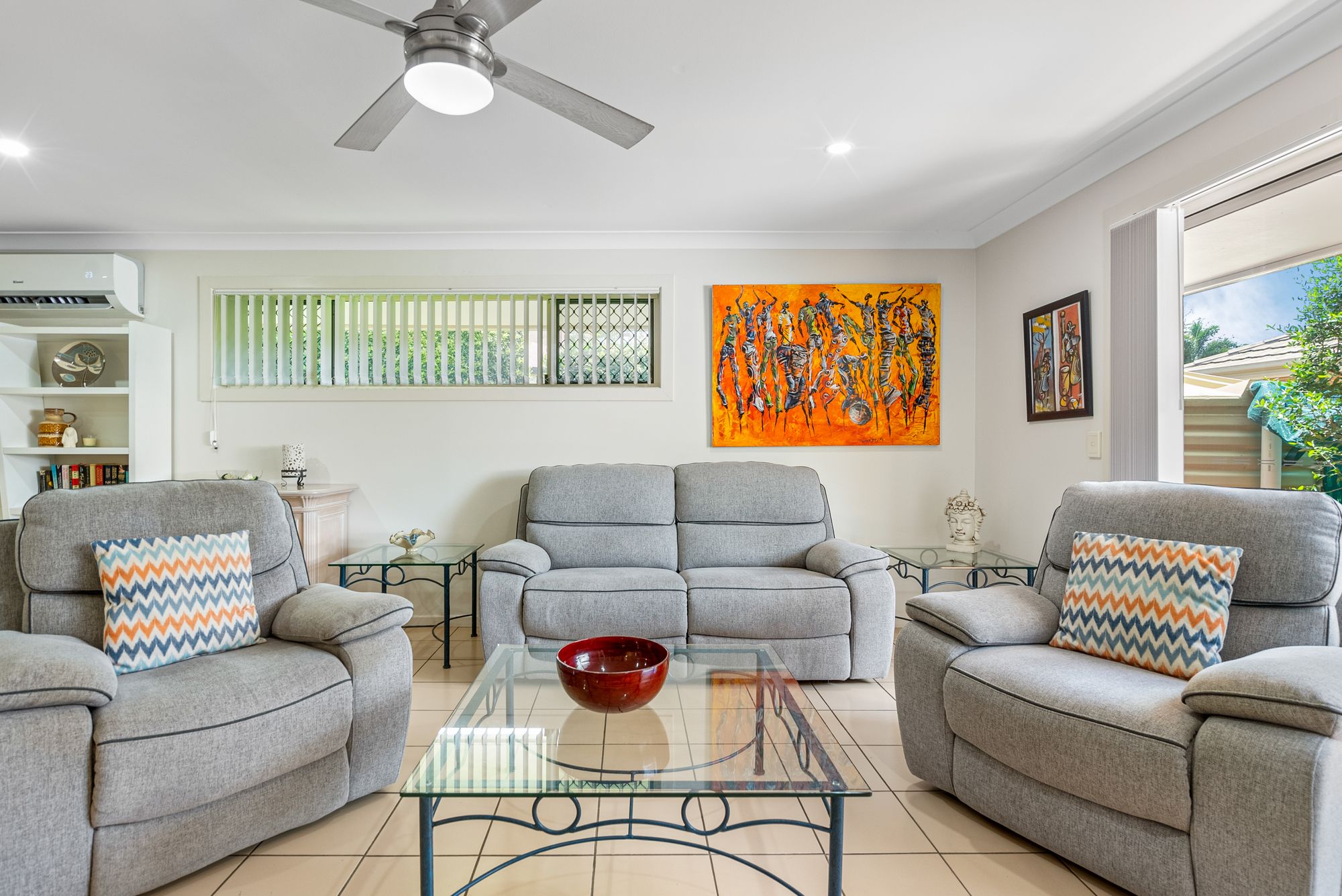 The home welcomes you with an entry foyer featuring ceramic floors that flow seamlessly throughout. The open plan kitchen offers spacious benchtops, and plenty of storage with cabinetry and a large pantry. The property features multiple living spaces, including dining, informal dining nook, lounge area and a family room with access to a cozy patio. The main living areas are air conditioned.
