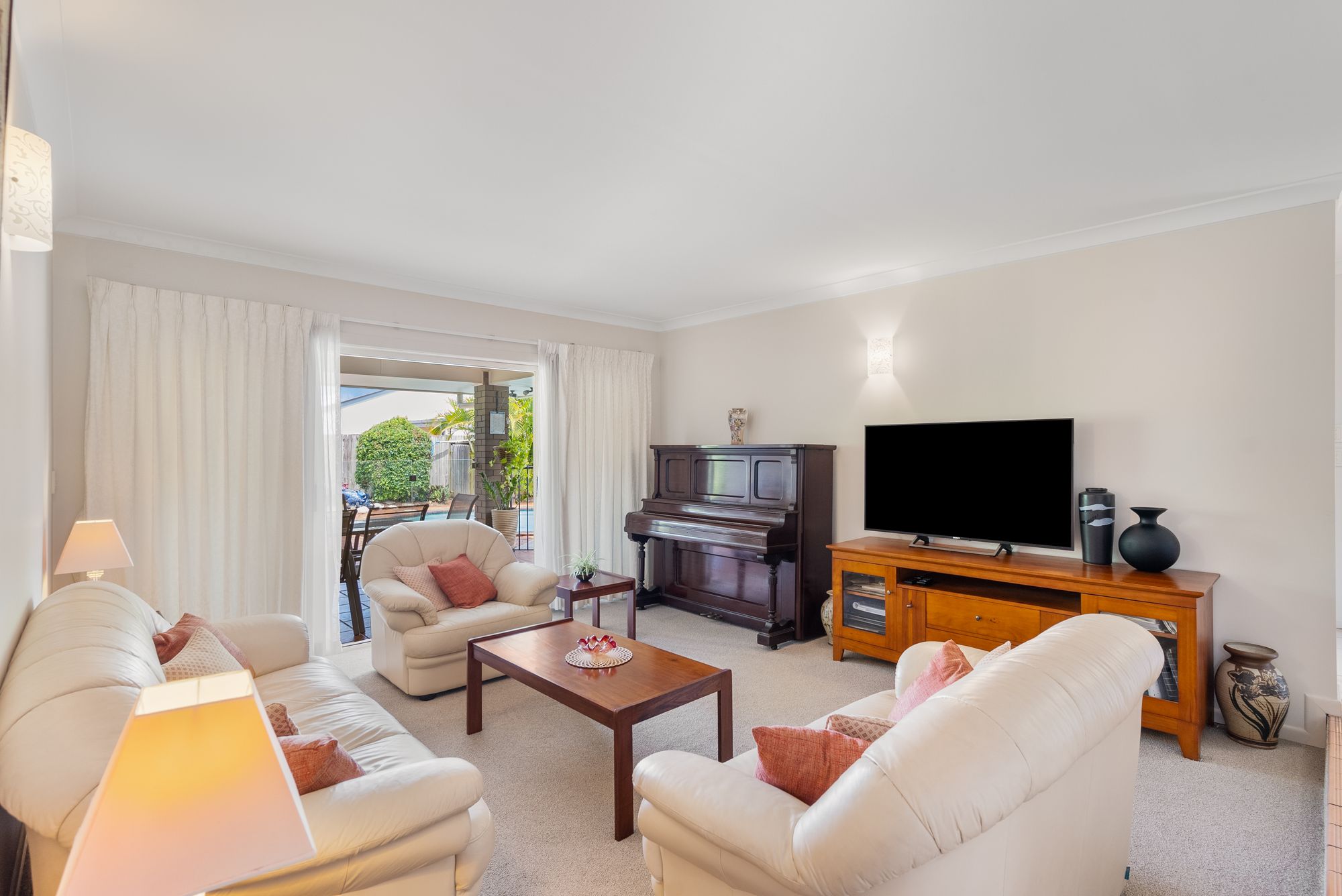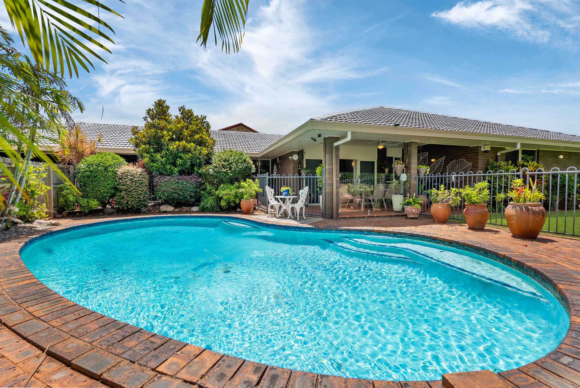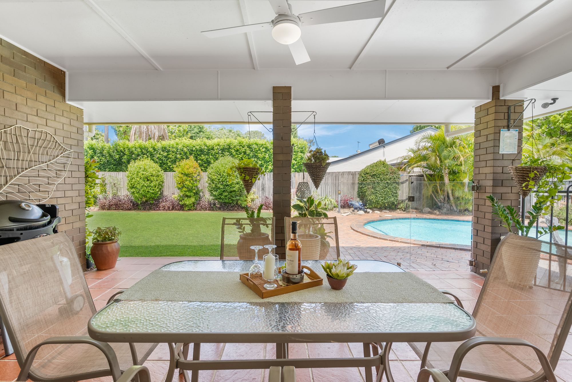 • Covered entertainment area where you can enjoy BBQs and gatherings while overlooking the beautifully landscaped yard and pool.
