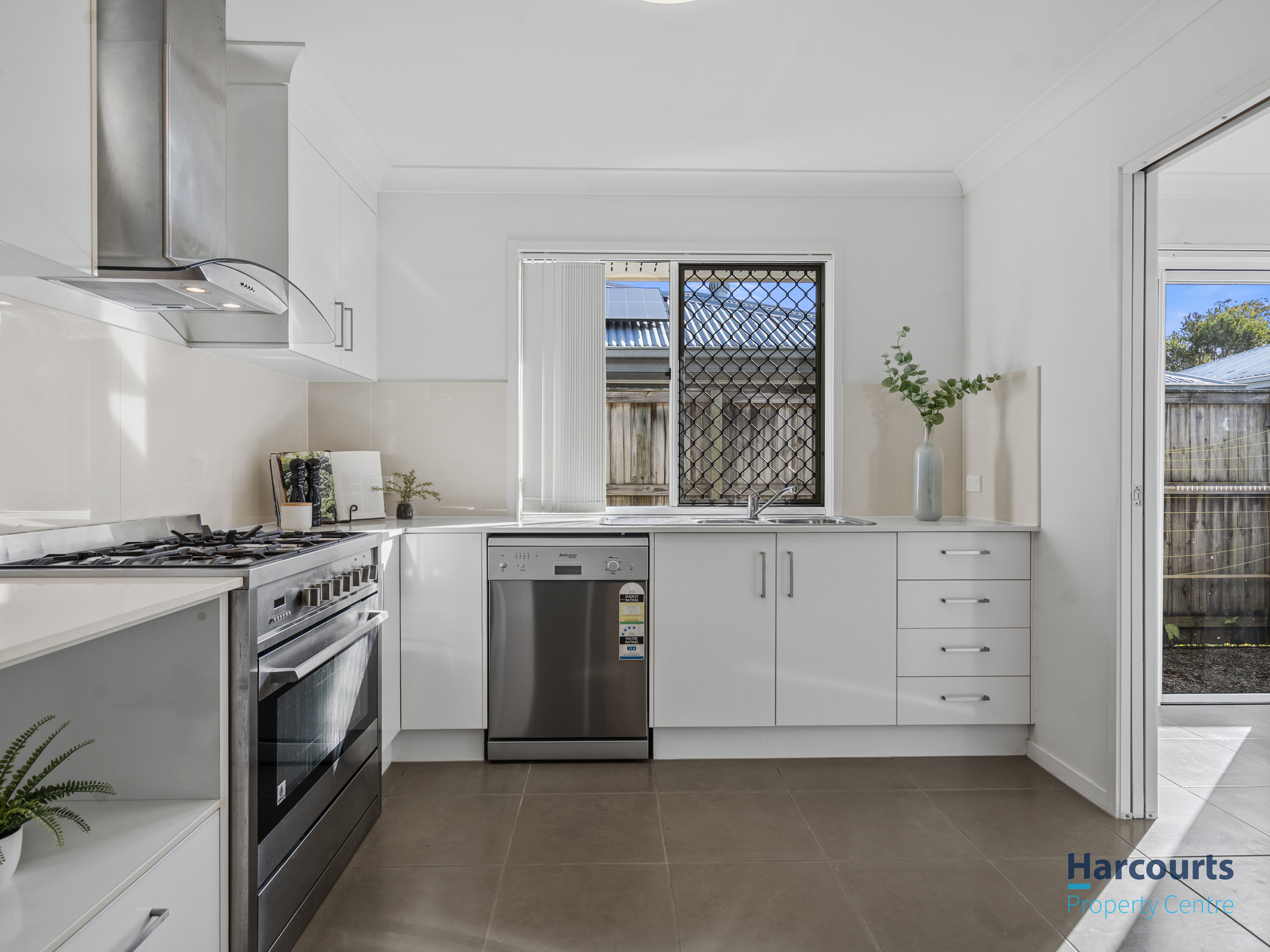 At the heart of the home, the open-plan kitchen, living, and dining areas deliver a light-filled, welcoming space perfect for family living. The stylish kitchen is a highlight, featuring stone benchtops, stainless steel appliances, a large freestanding gas oven, dishwasher, a spacious walk-in pantry, and ample storage.