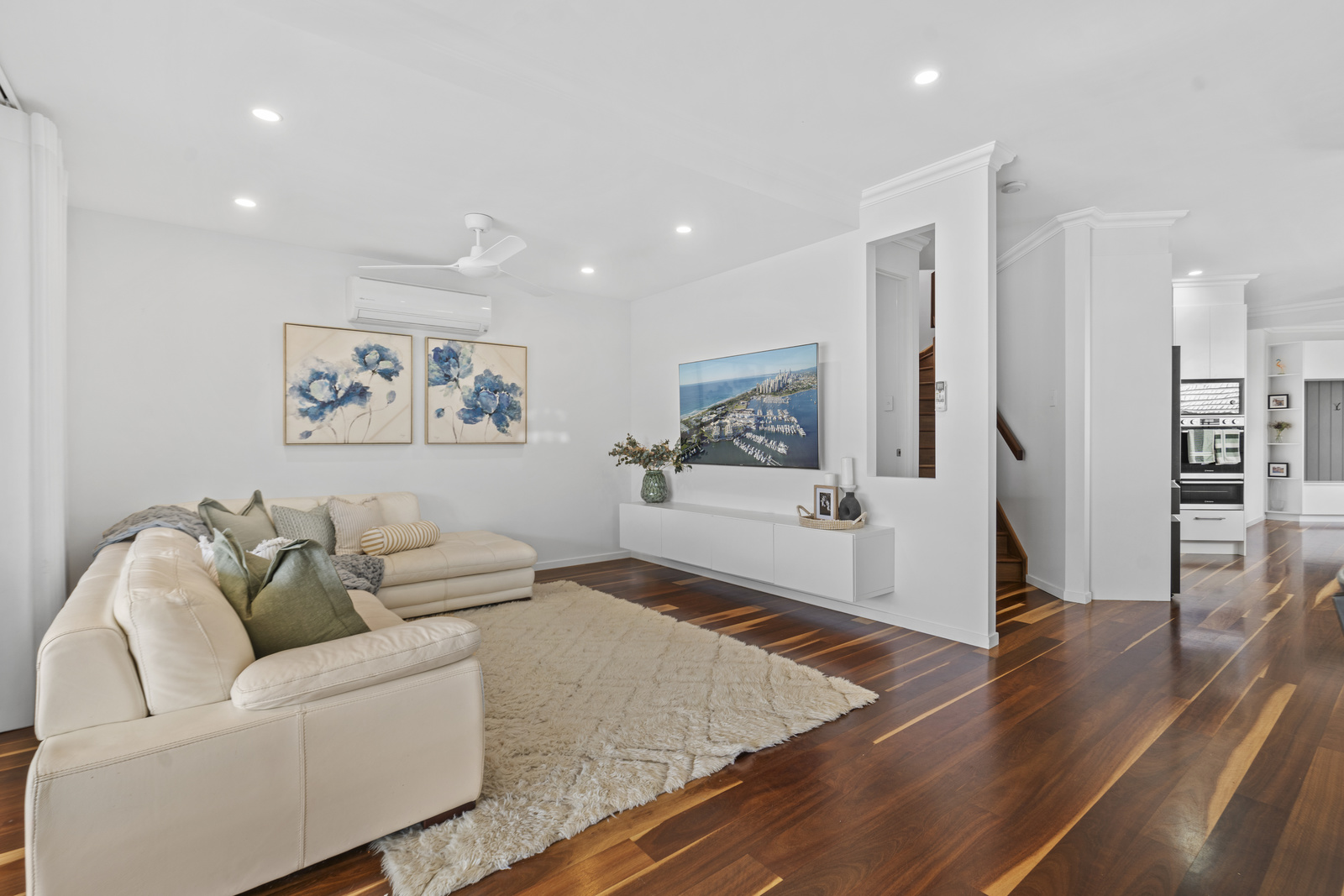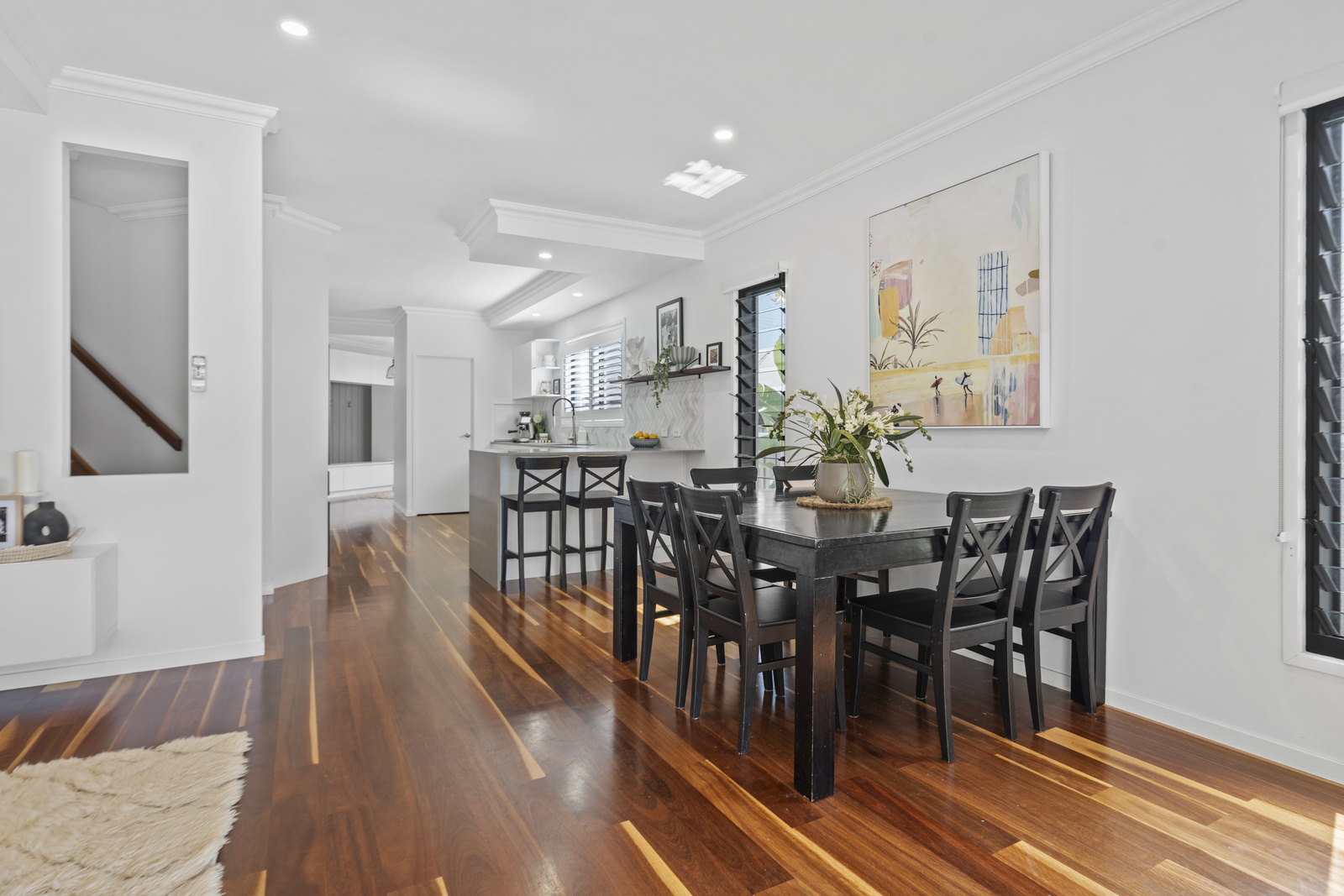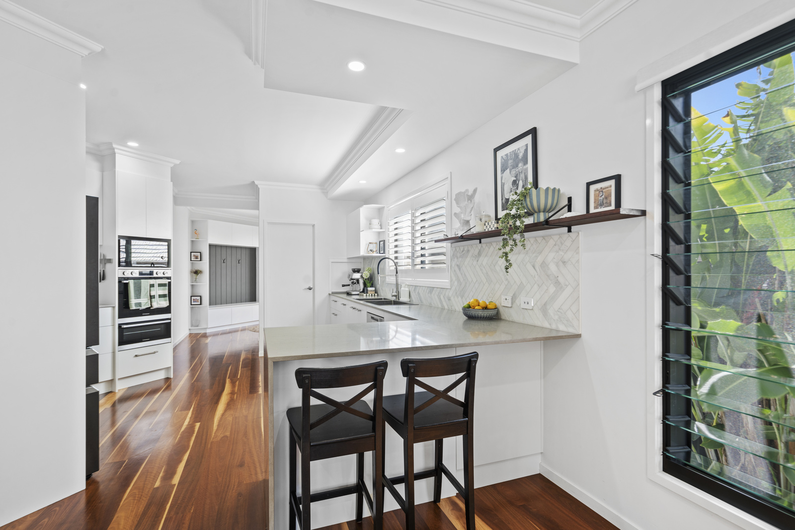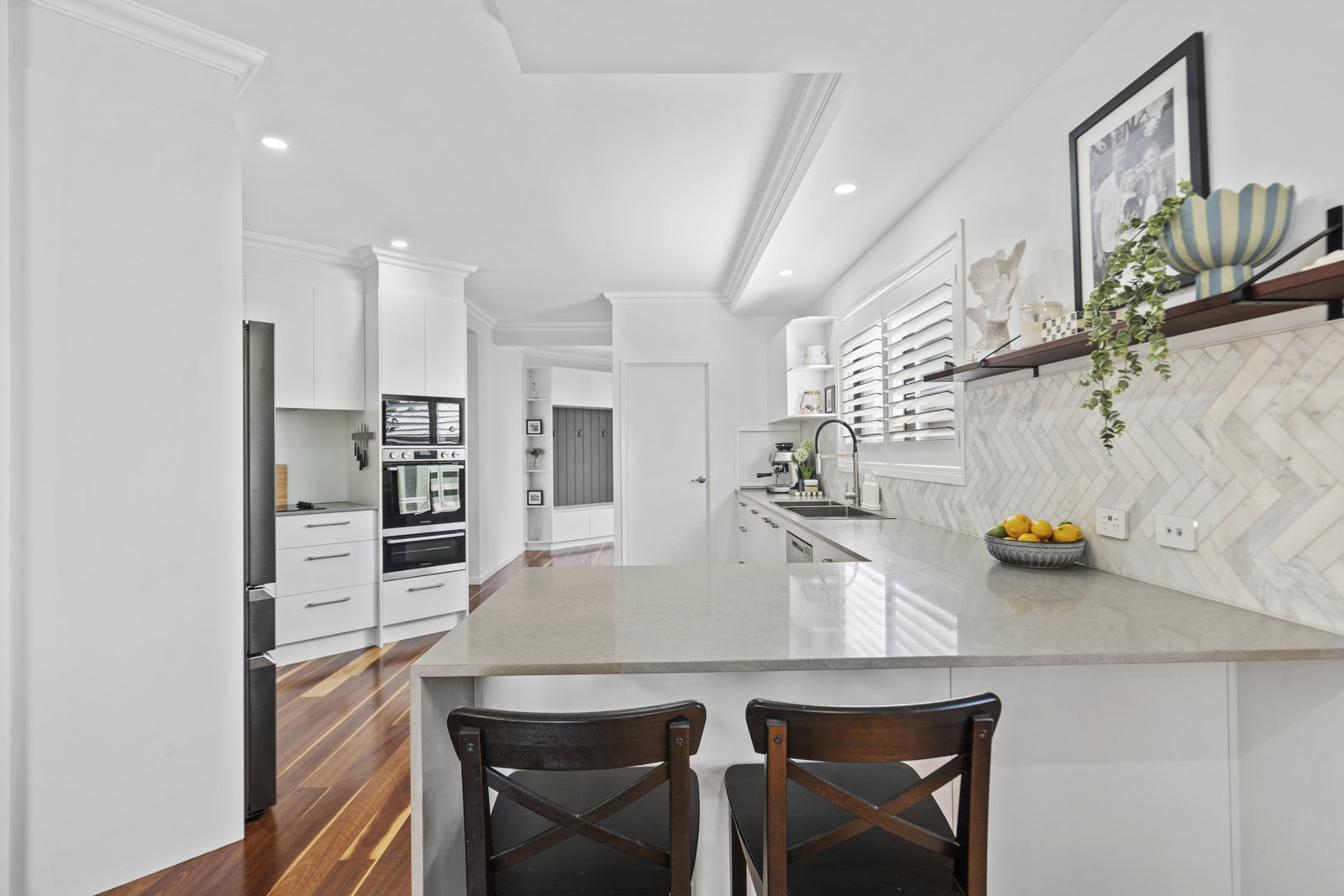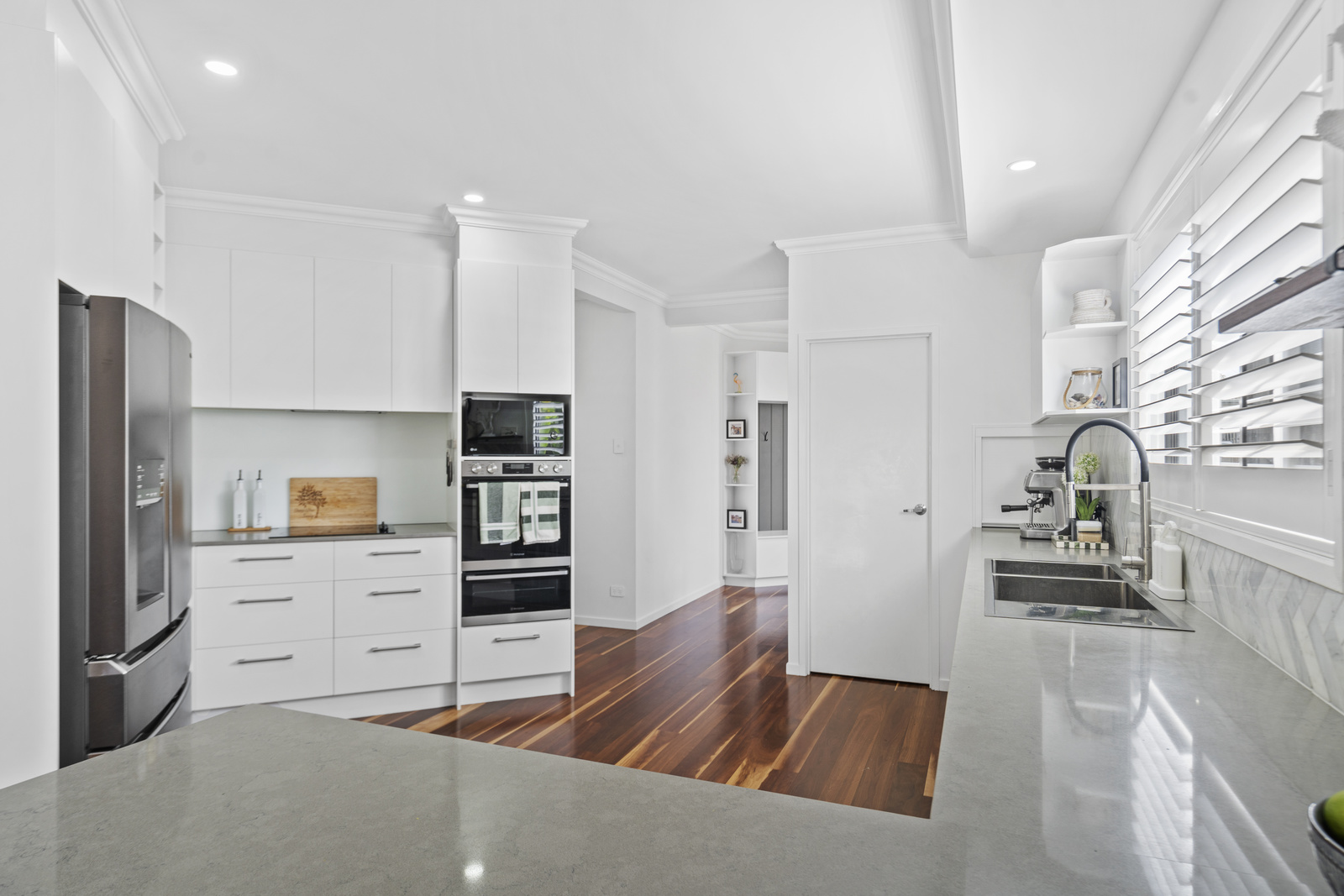 The heart of the home is the open-plan living, dining and kitchen area, highlighted by clean architectural lines, high ceilings and expansive glazing that floods the interiors with natural light. The kitchen has been designed for both style and function, complete with quality appliances, ample storage and a generous island bench perfect for family gatherings.