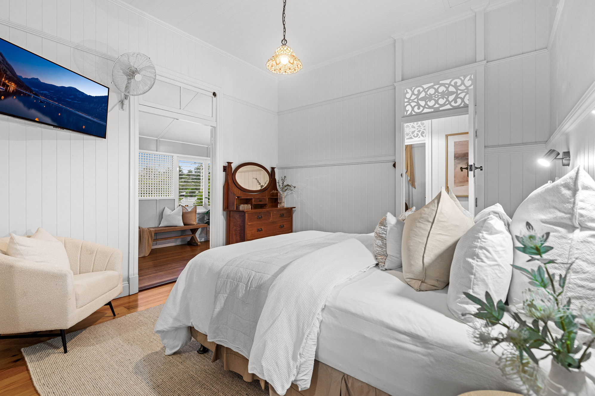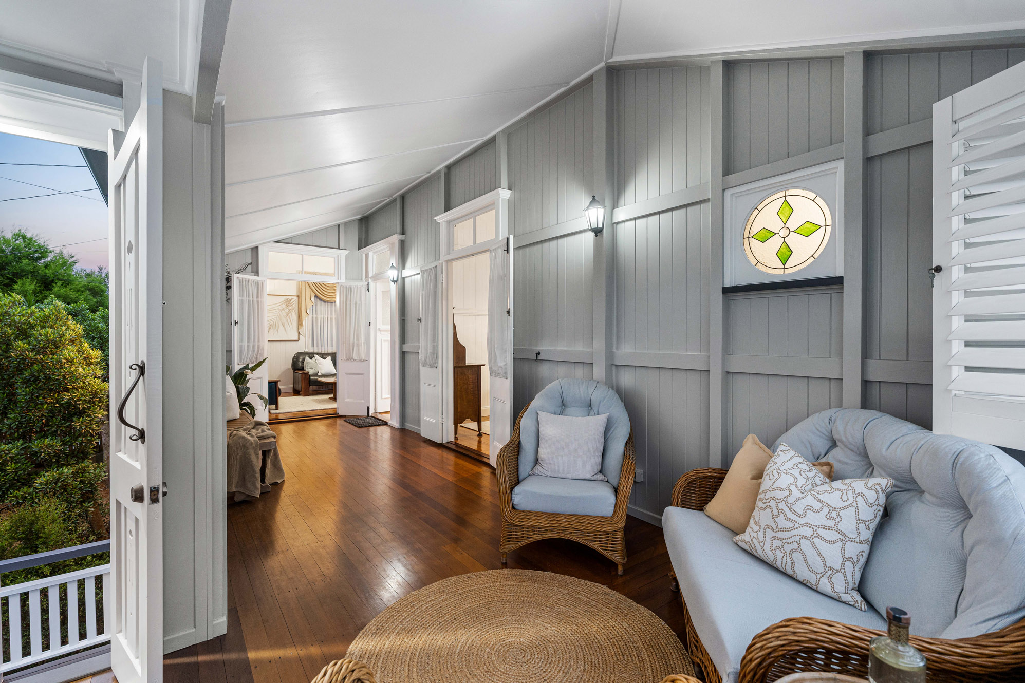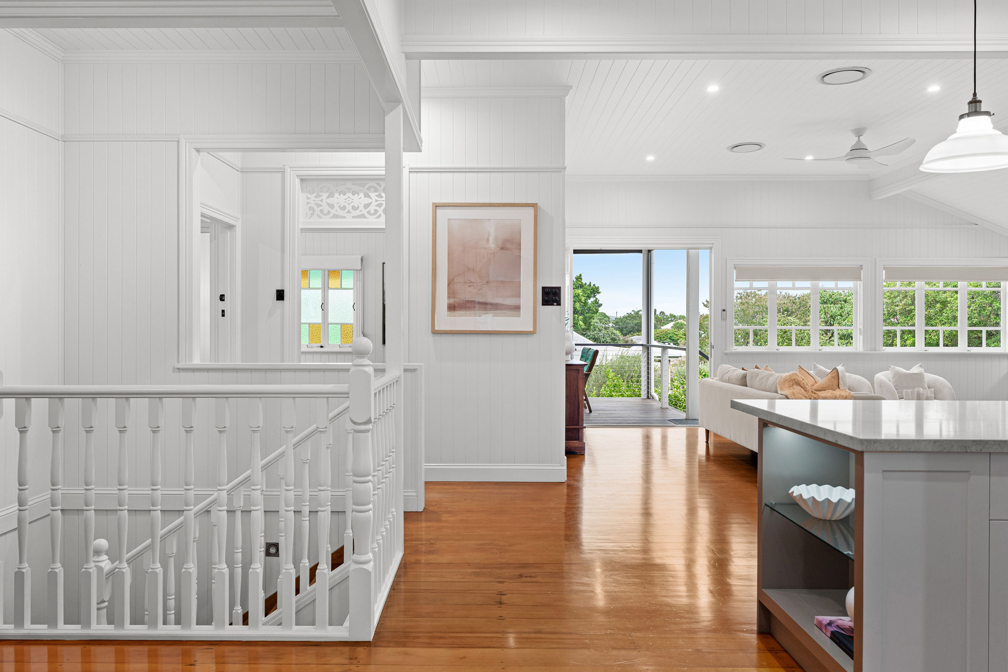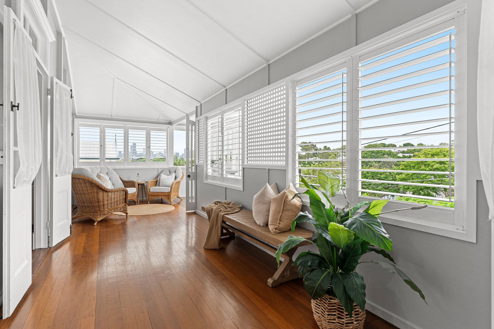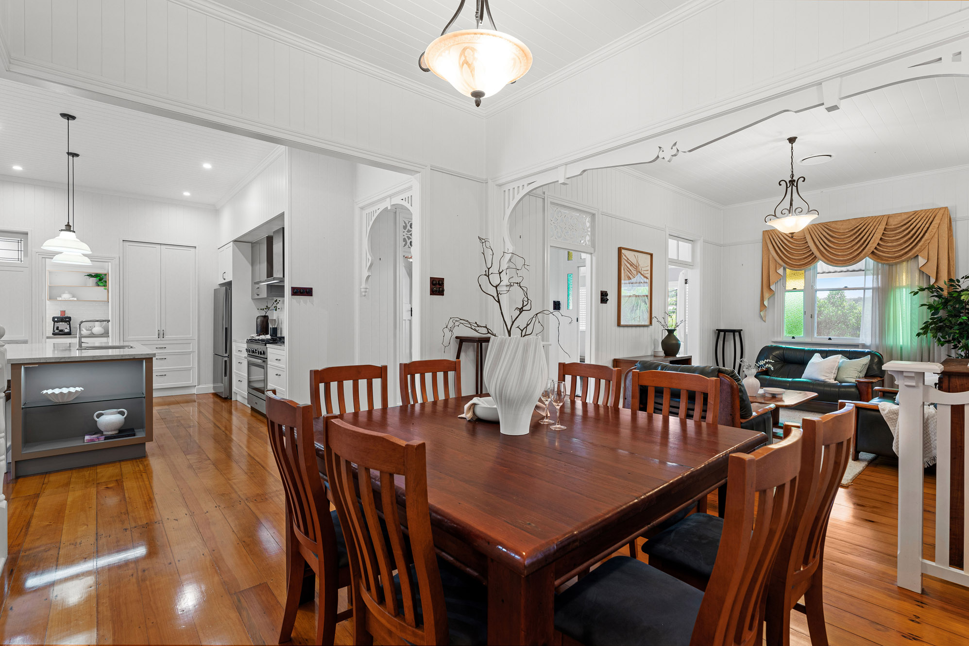• Restored 1920s legacy featuring VJ walls, ornate breezeways, and French doors leading to a front deck with commanding views over the city, The Gabba, and Mt Coot-tha