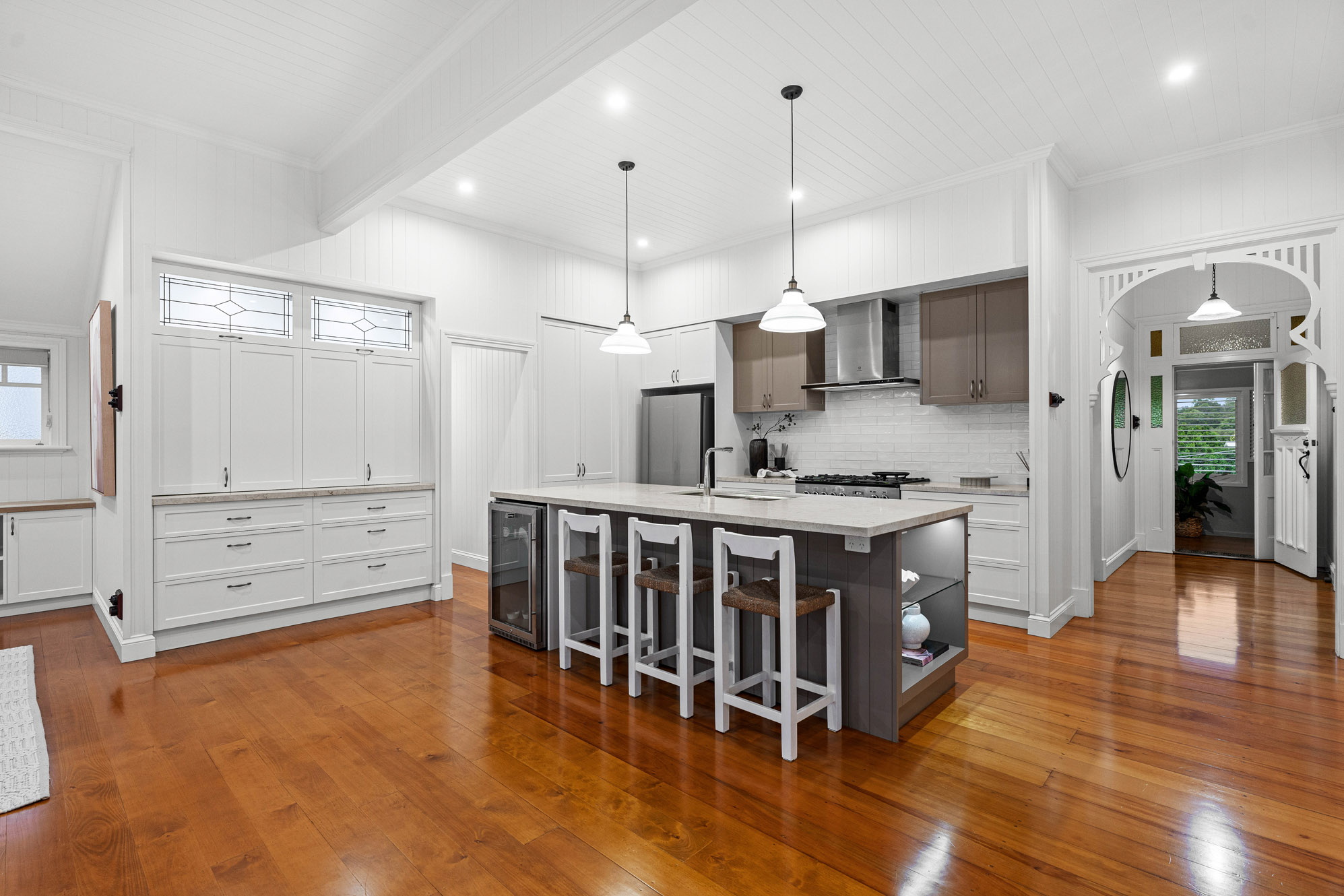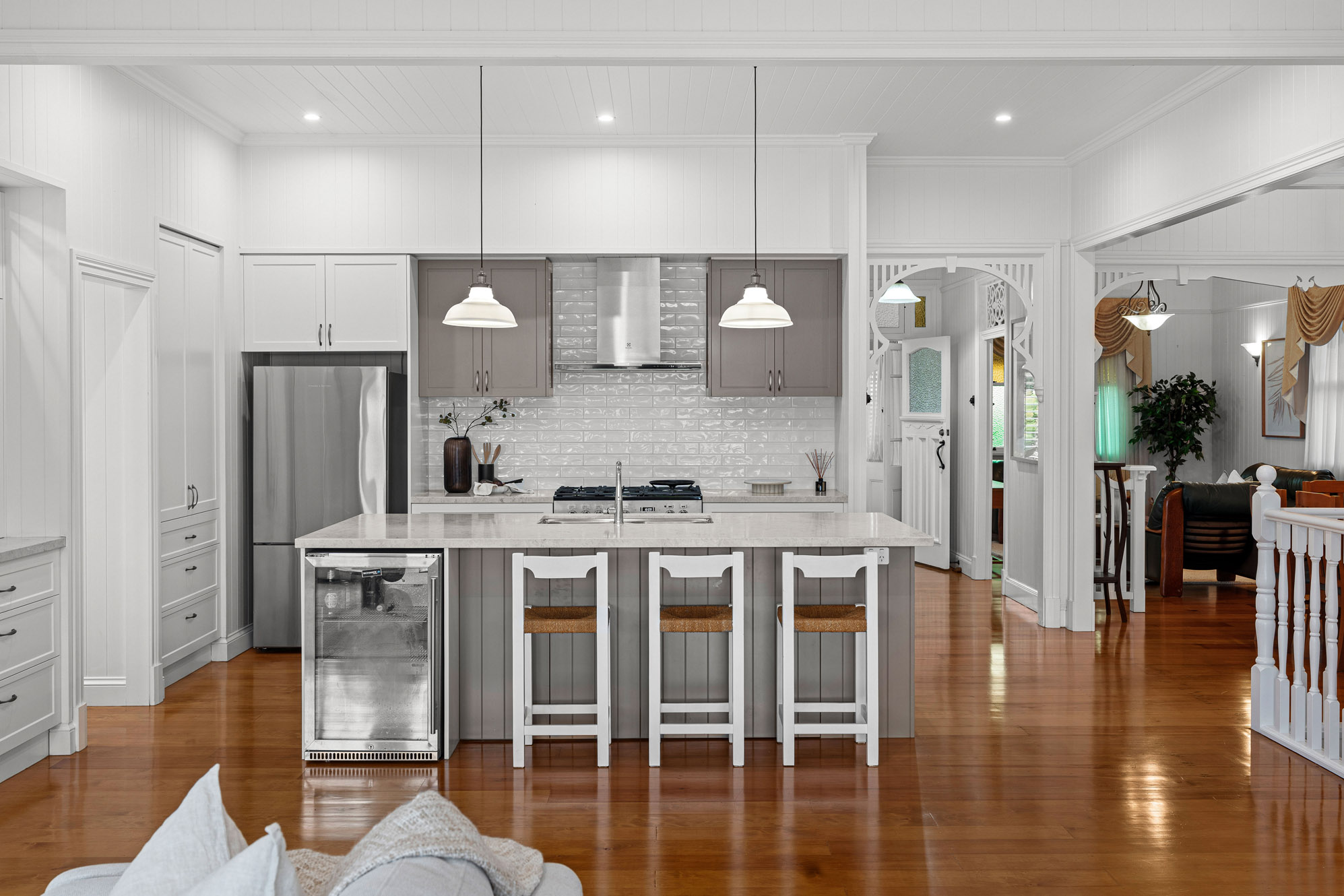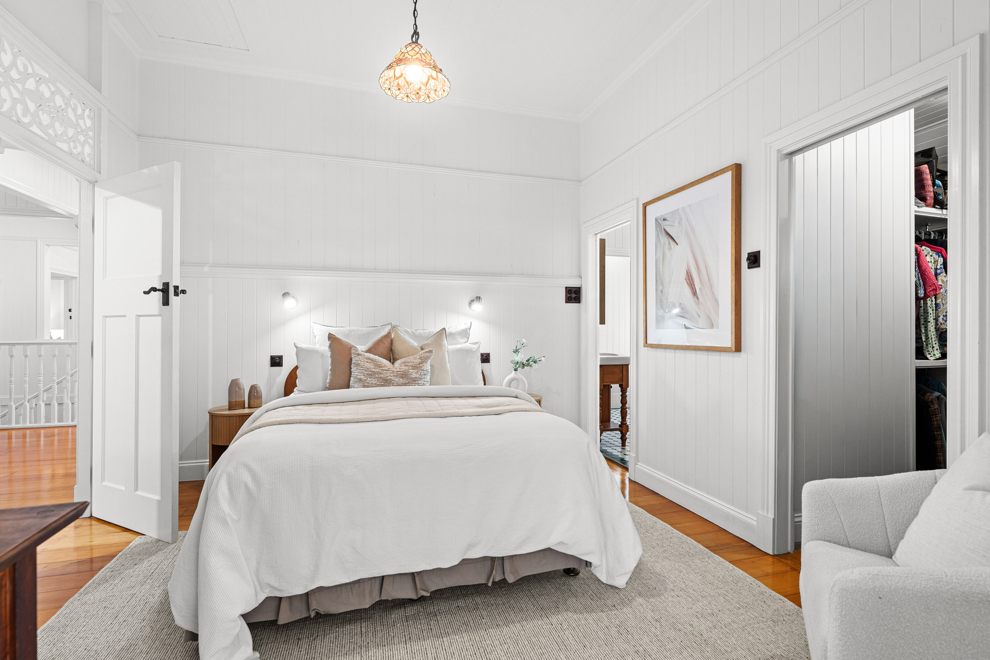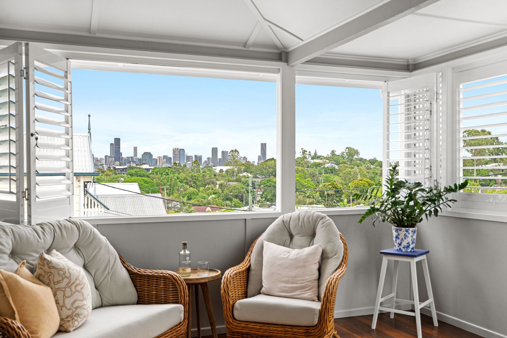 • Restored 1920s legacy featuring VJ walls, ornate breezeways, and French doors leading to a front deck with commanding views over the city, The Gabba, and Mt Coot-tha