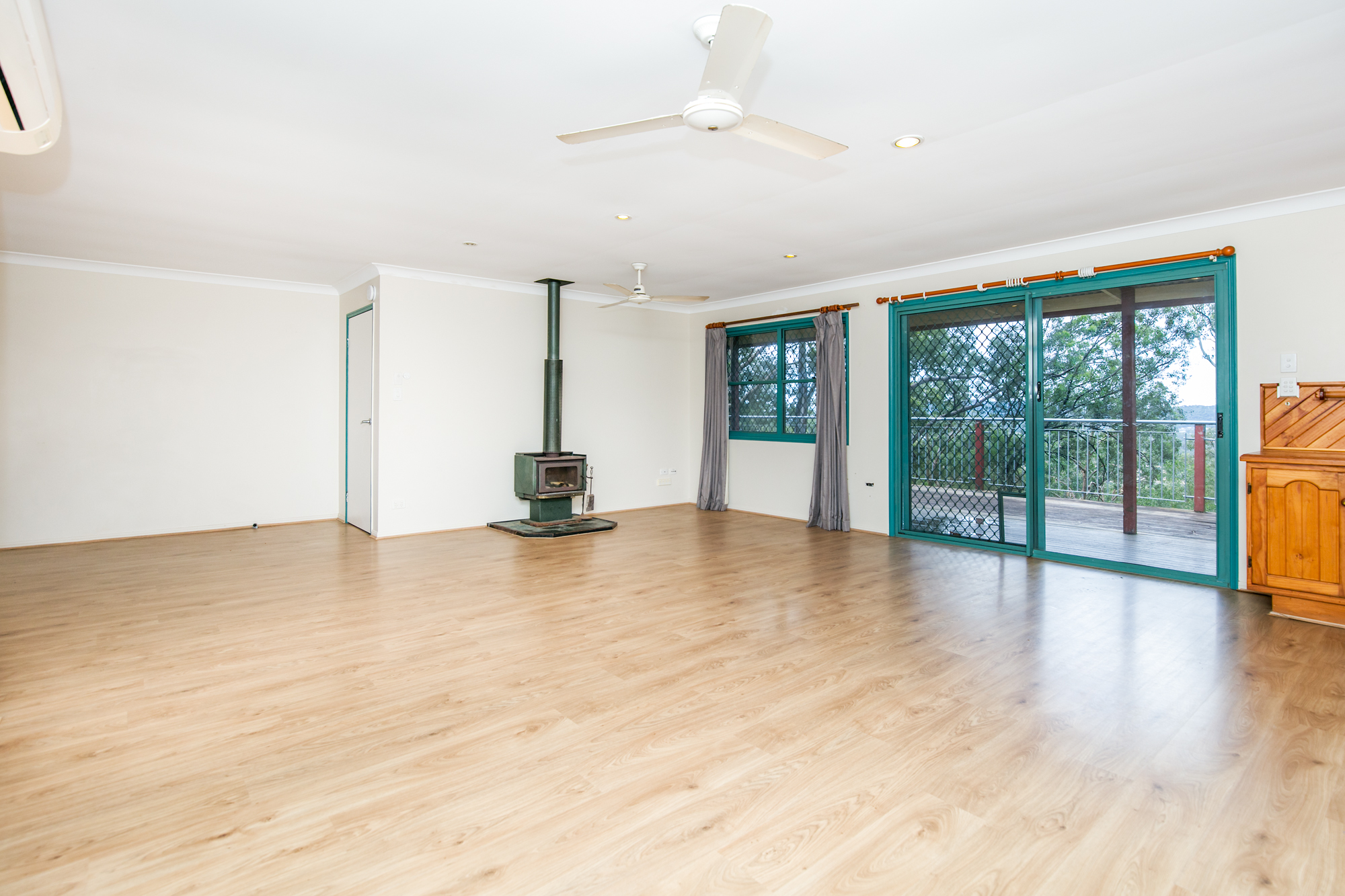 As you step through the doors, you’re welcomed by light-coloured timber flooring that enhances the home’s light and airy feel. The open-plan kitchen, dining, and living area features ceiling fans, air-conditioning, and a cosy fireplace, creating a comfortable atmosphere year-round. This space leads out to a spacious timber deck, seamlessly blending indoor and outdoor living.