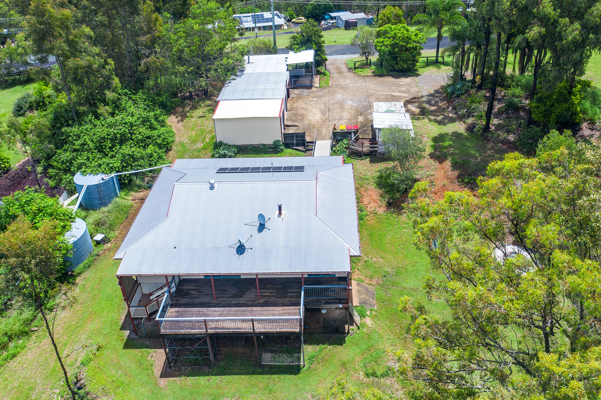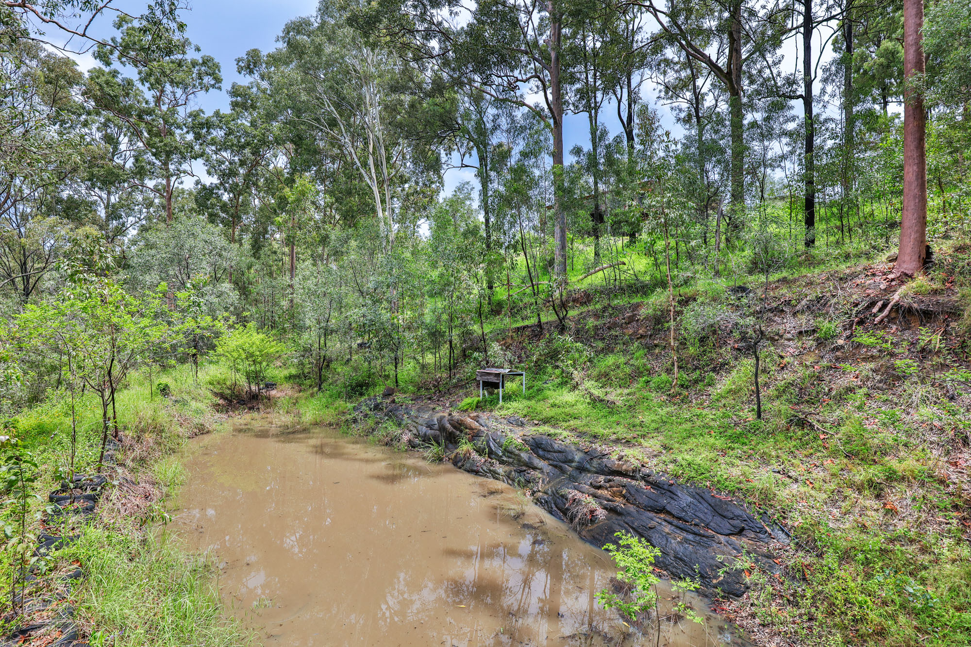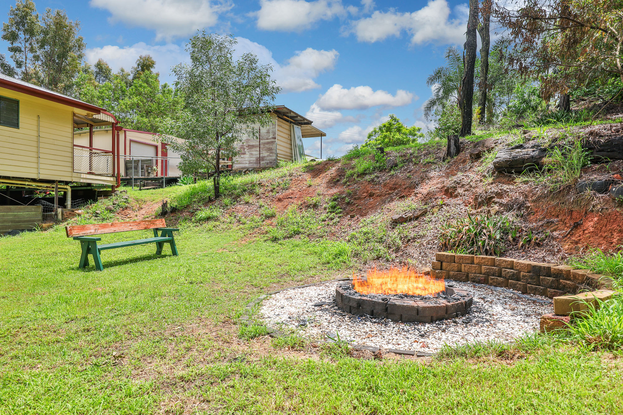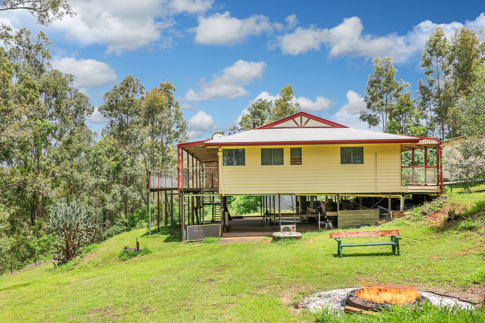 The expansive timber deck is perfect for entertaining or unwinding, with stairs leading to a concreted area beneath the house. The front deck provides another inviting space to enjoy the serene surroundings. Outside, the property boasts a dam, an outdoor fire pit for memorable evenings, and multiple water tanks.