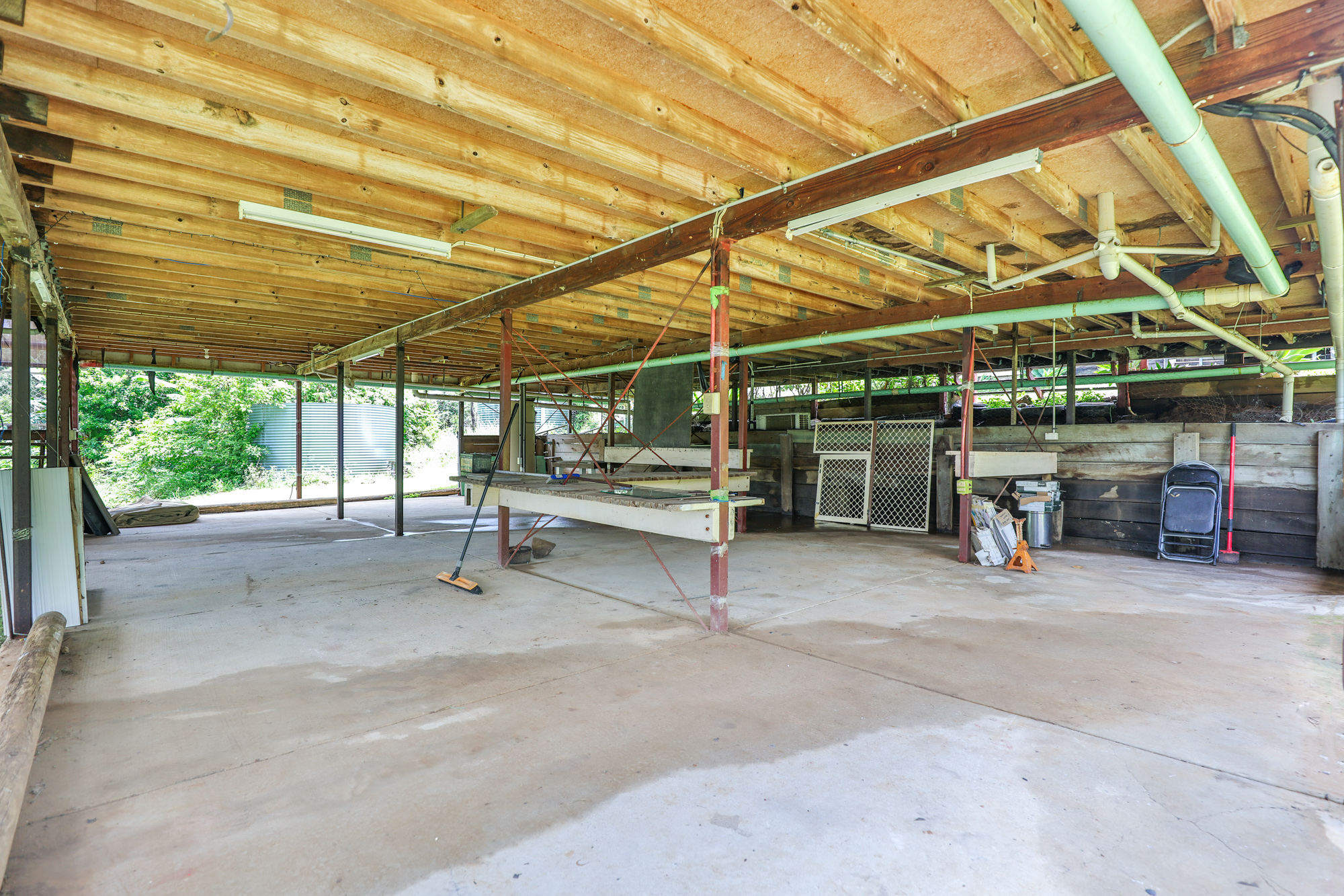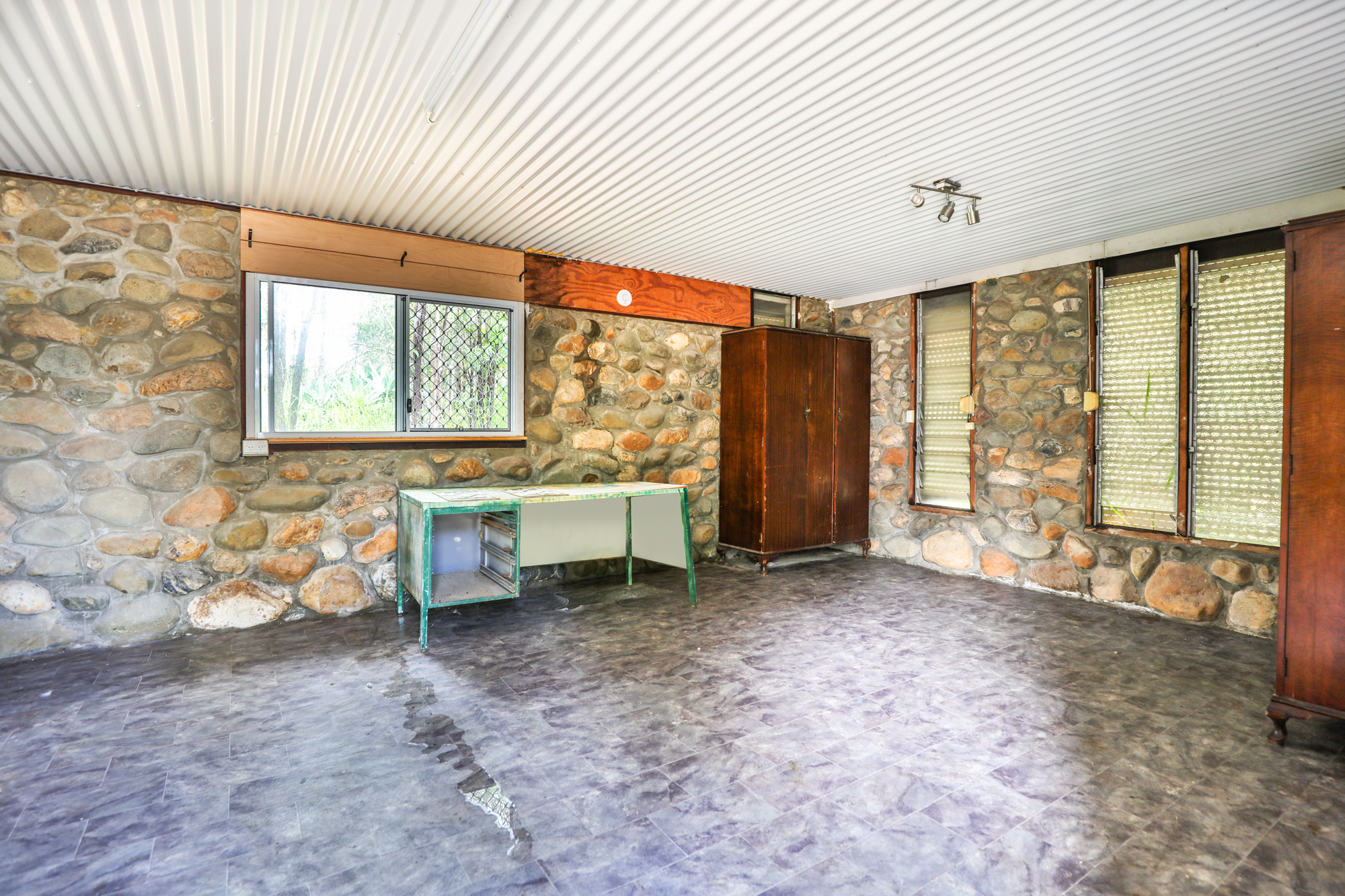 For those needing workspace or storage, a 3-bay shed includes an extra room made from exposed stone, ideal for an office or workshop.
