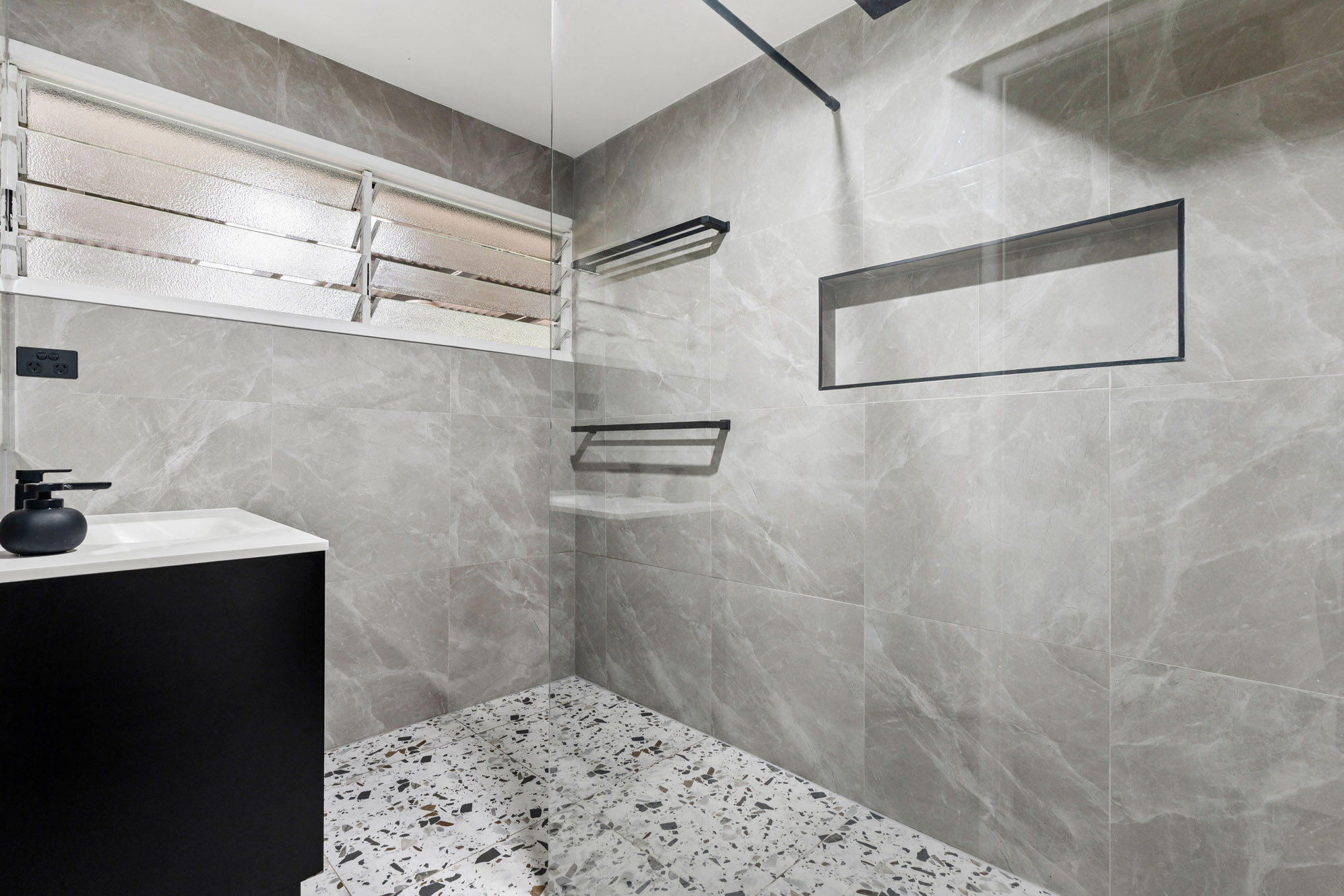 Exquisite main bathroom finished with floor-to-ceiling tiles and a massive walk-in shower featuring a luxurious rainfall head