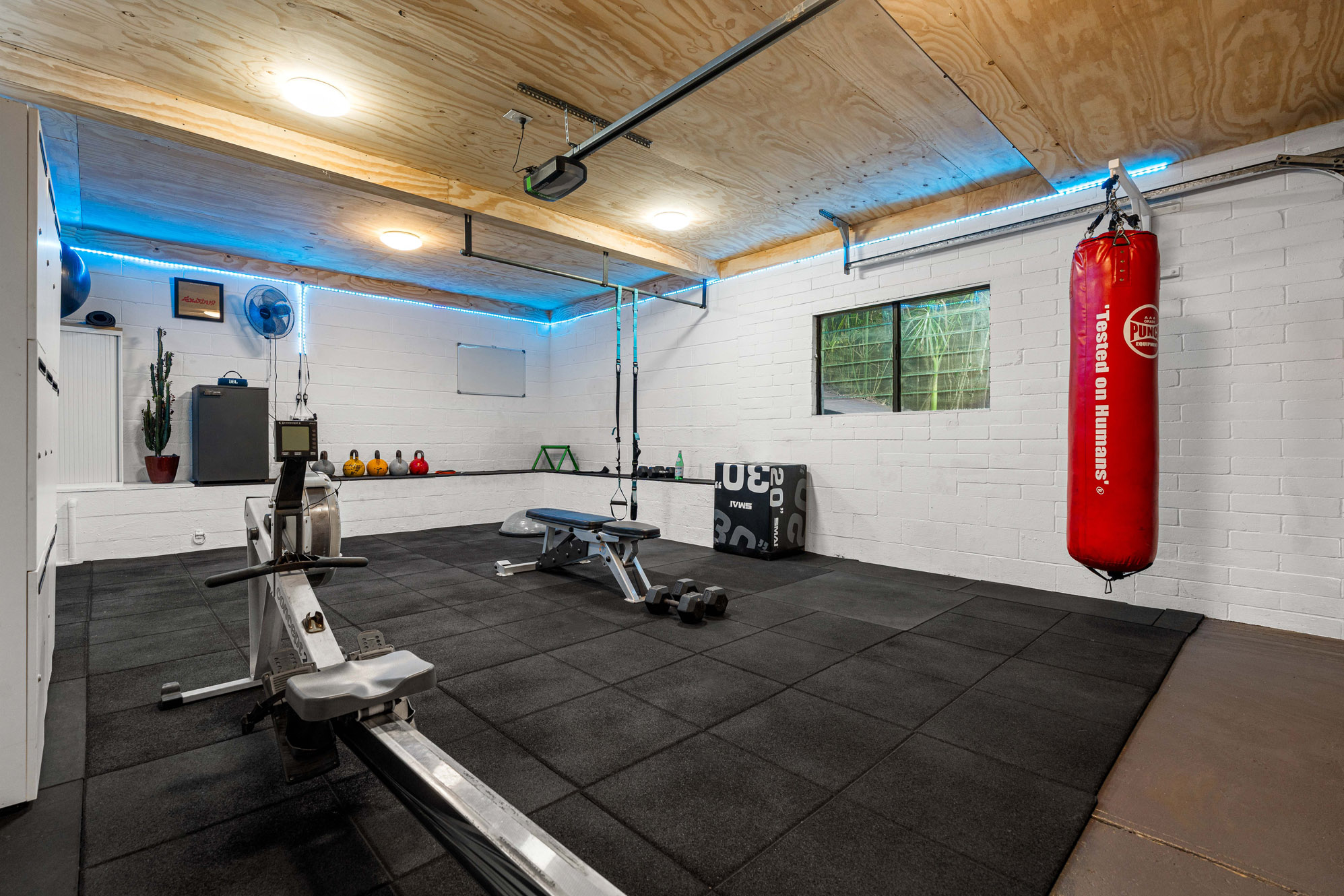 Versatile double garage currently utilised as a high-end home gym, offering the perfect space for fitness enthusiasts or can be converted back easily