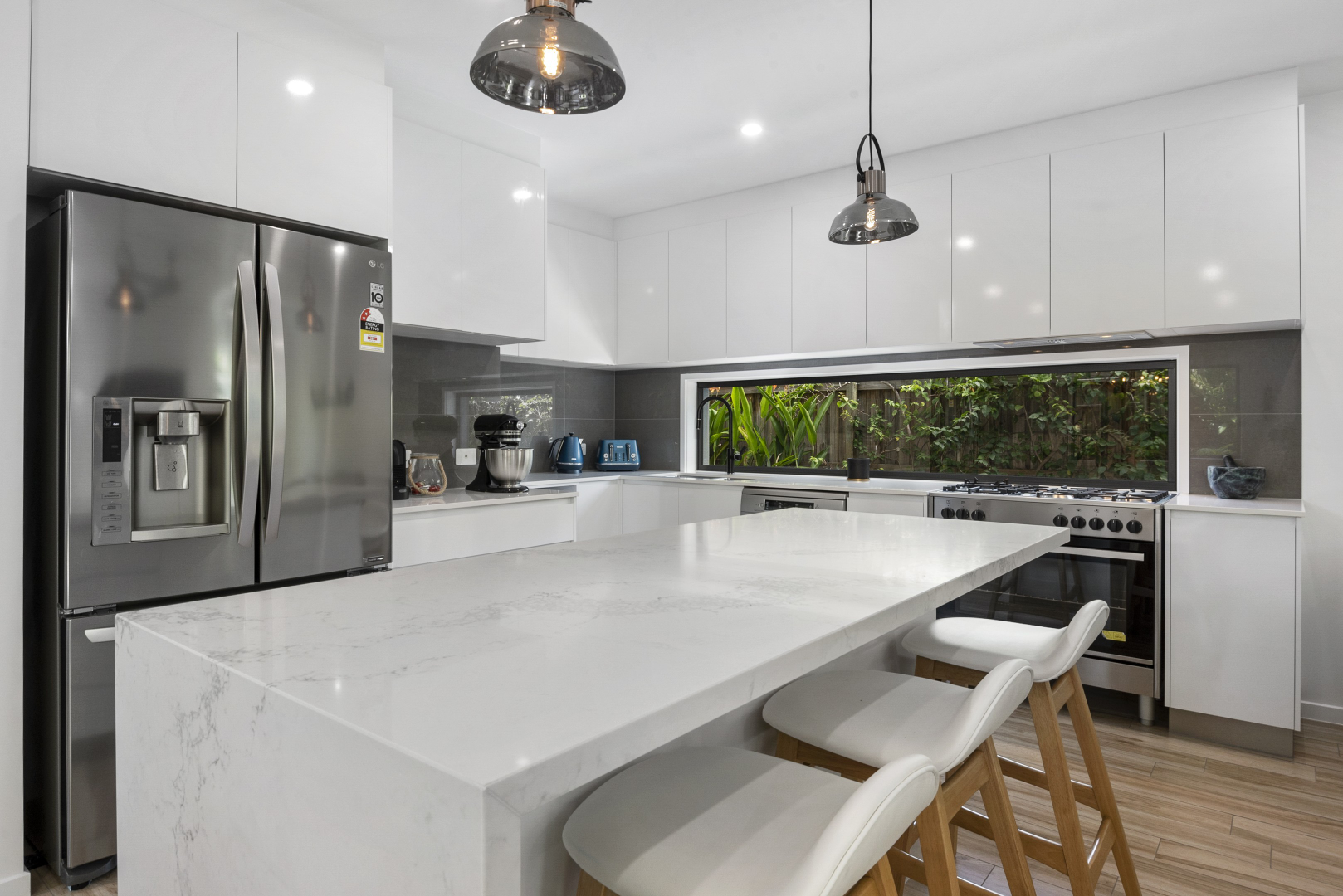 The entertainer’s kitchen features Caesarstone waterfall island bench, 5-burner gas cooktop, electric oven, dishwasher and space for a large plumbed fridge. Completing the ground floor is a home office, laundry, pantry and a secondary master suite with ensuite, walk-in robe and private garden access. The oversized double garage (2.2m clearance) with resin-flex flooring and rear roller door is perfect for lifted 4WDs.