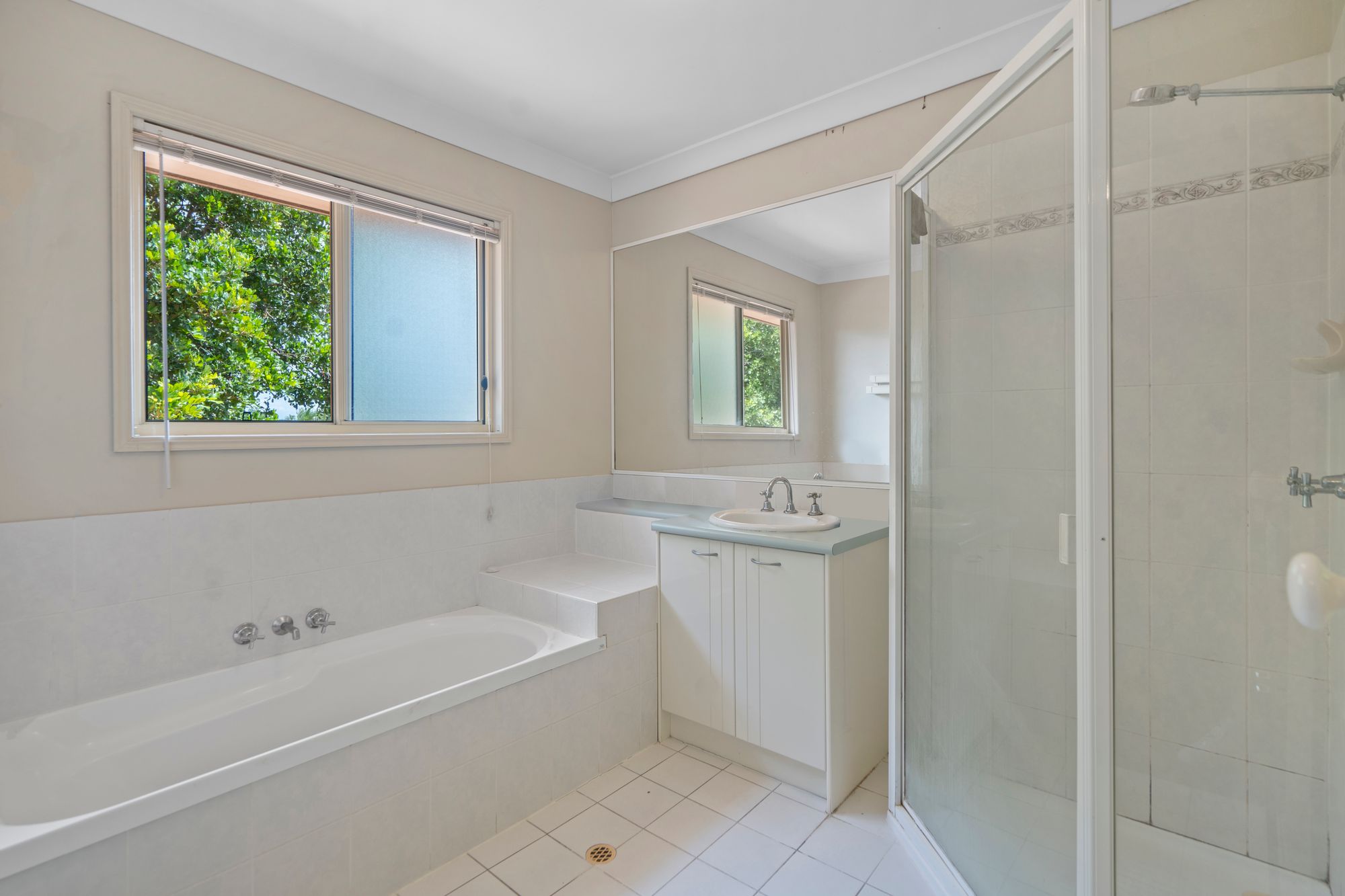 The upper floor hosts two spacious bedrooms with built-in robes and ceiling fans, serviced by a main shared bathroom featuring a separate bath and shower. A linen closet adds to the overall convenience.