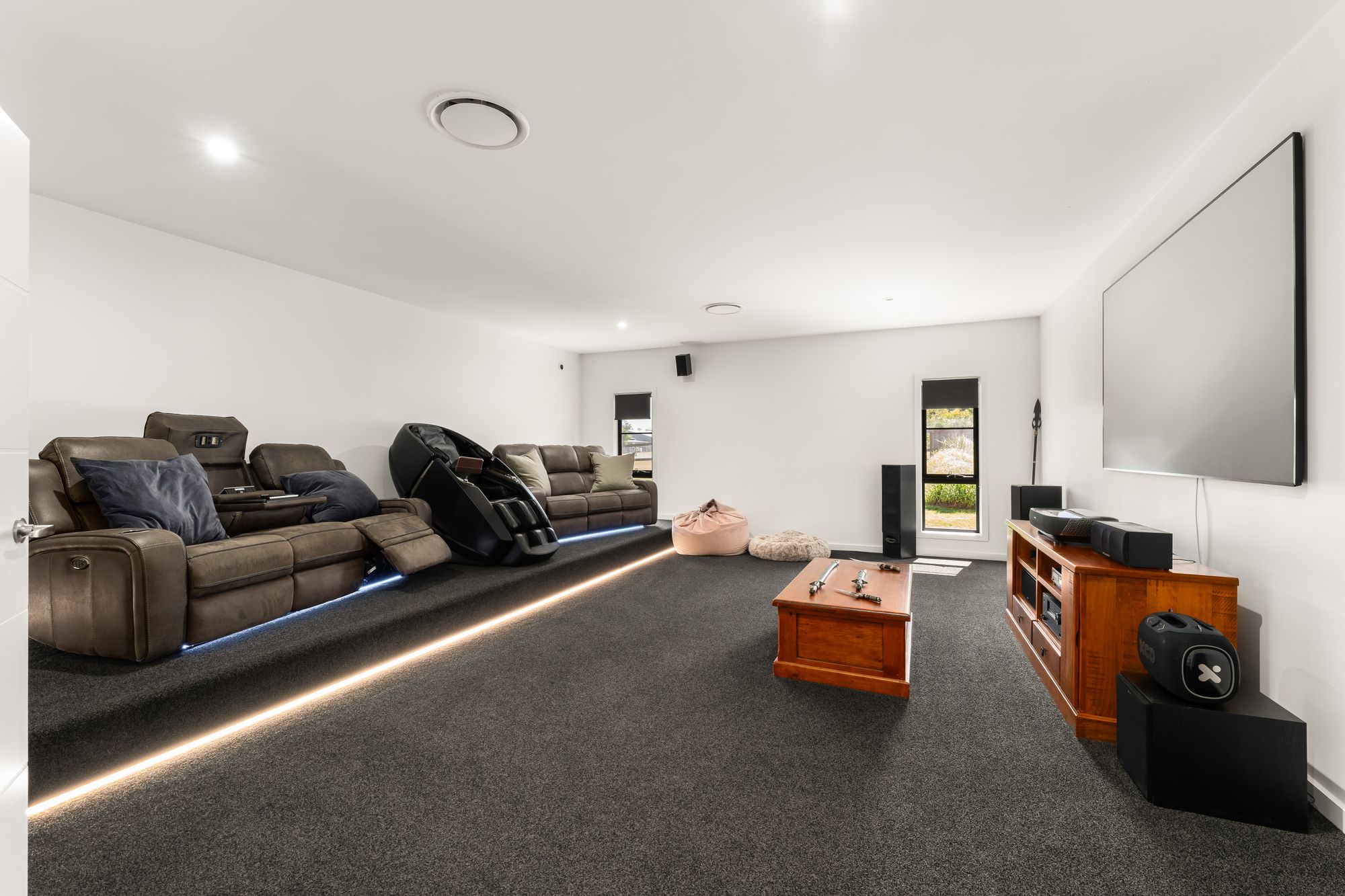 • Large soundproof media room complete with surround sound system and LED feature lighting