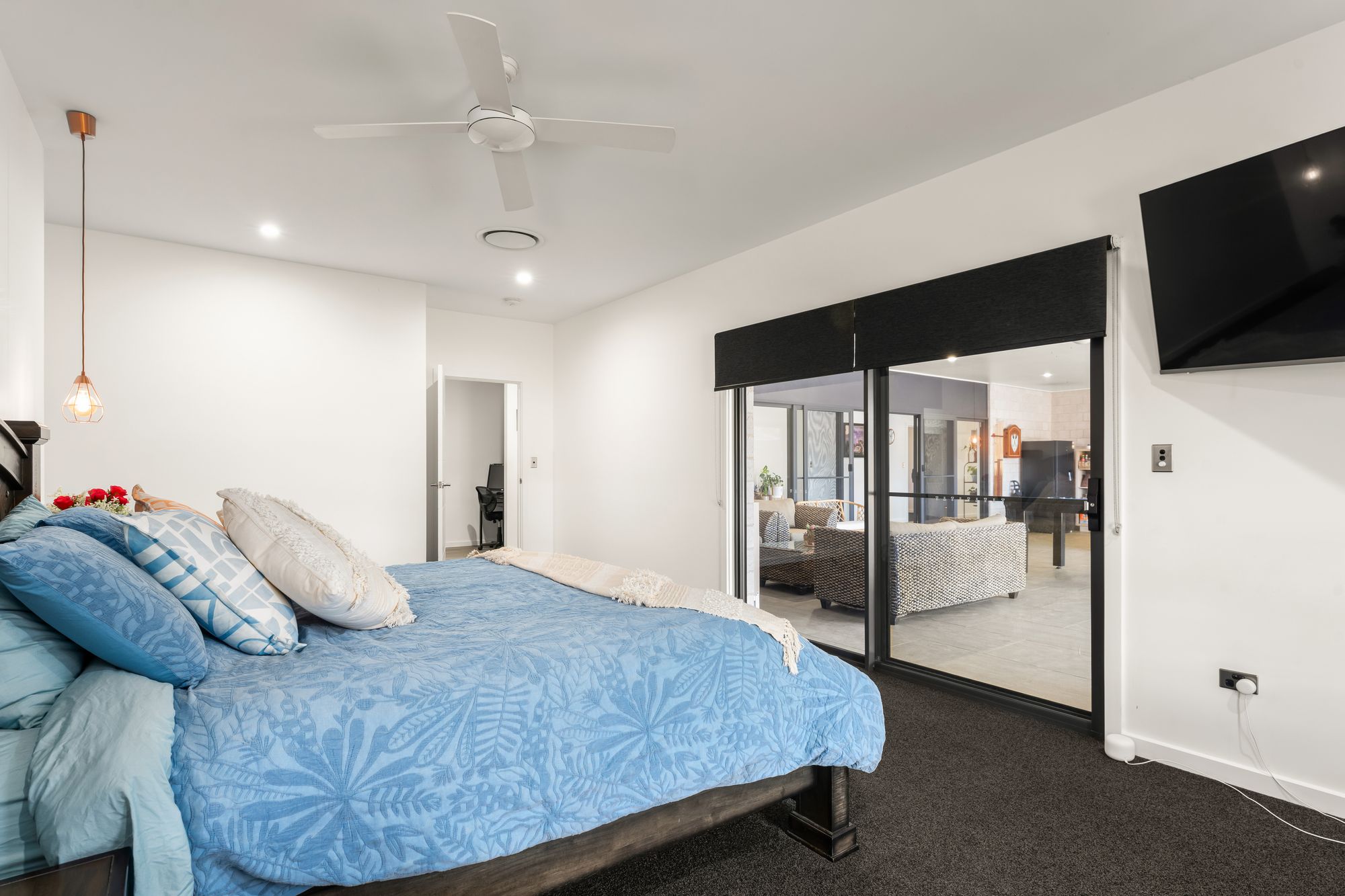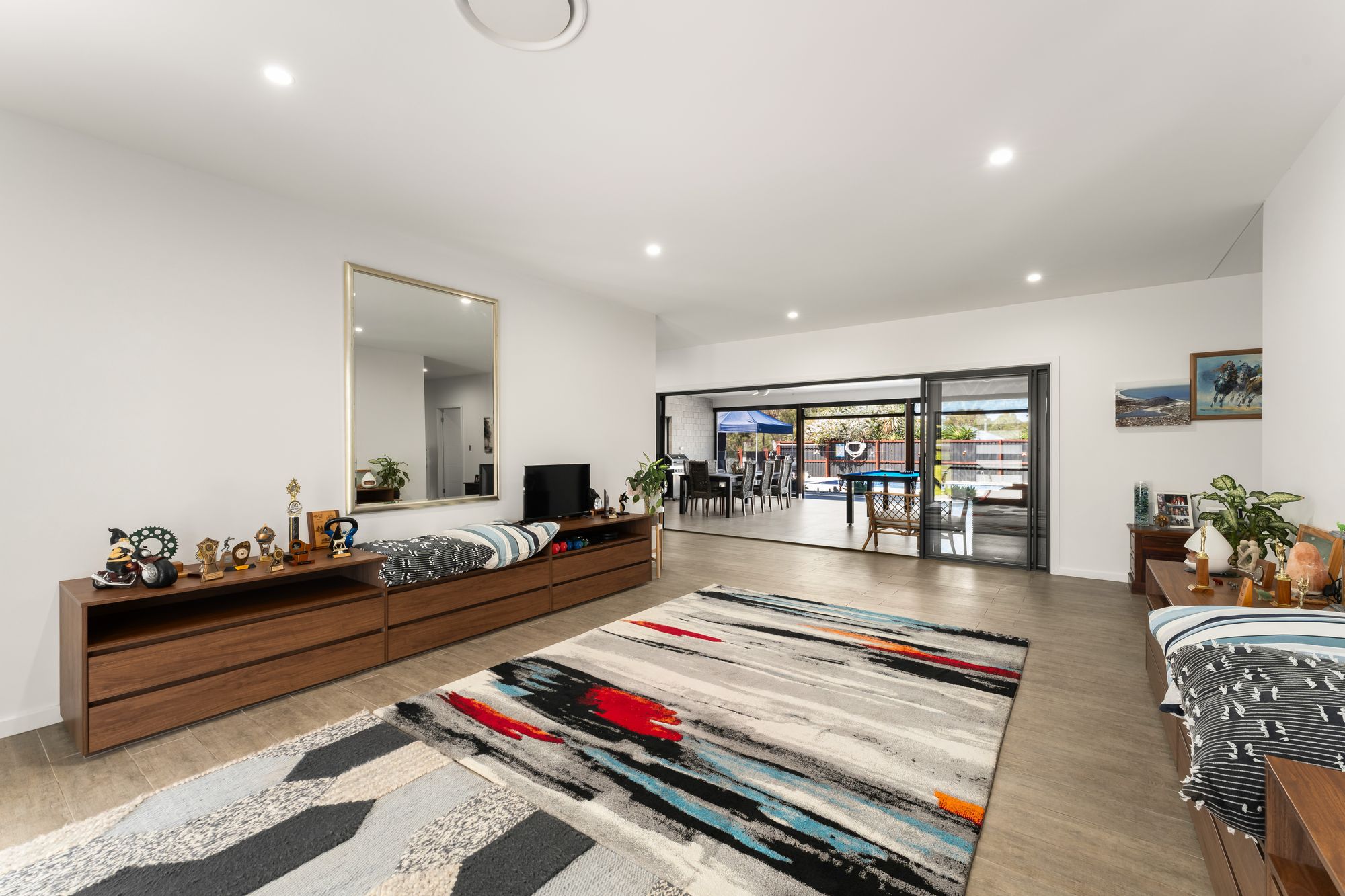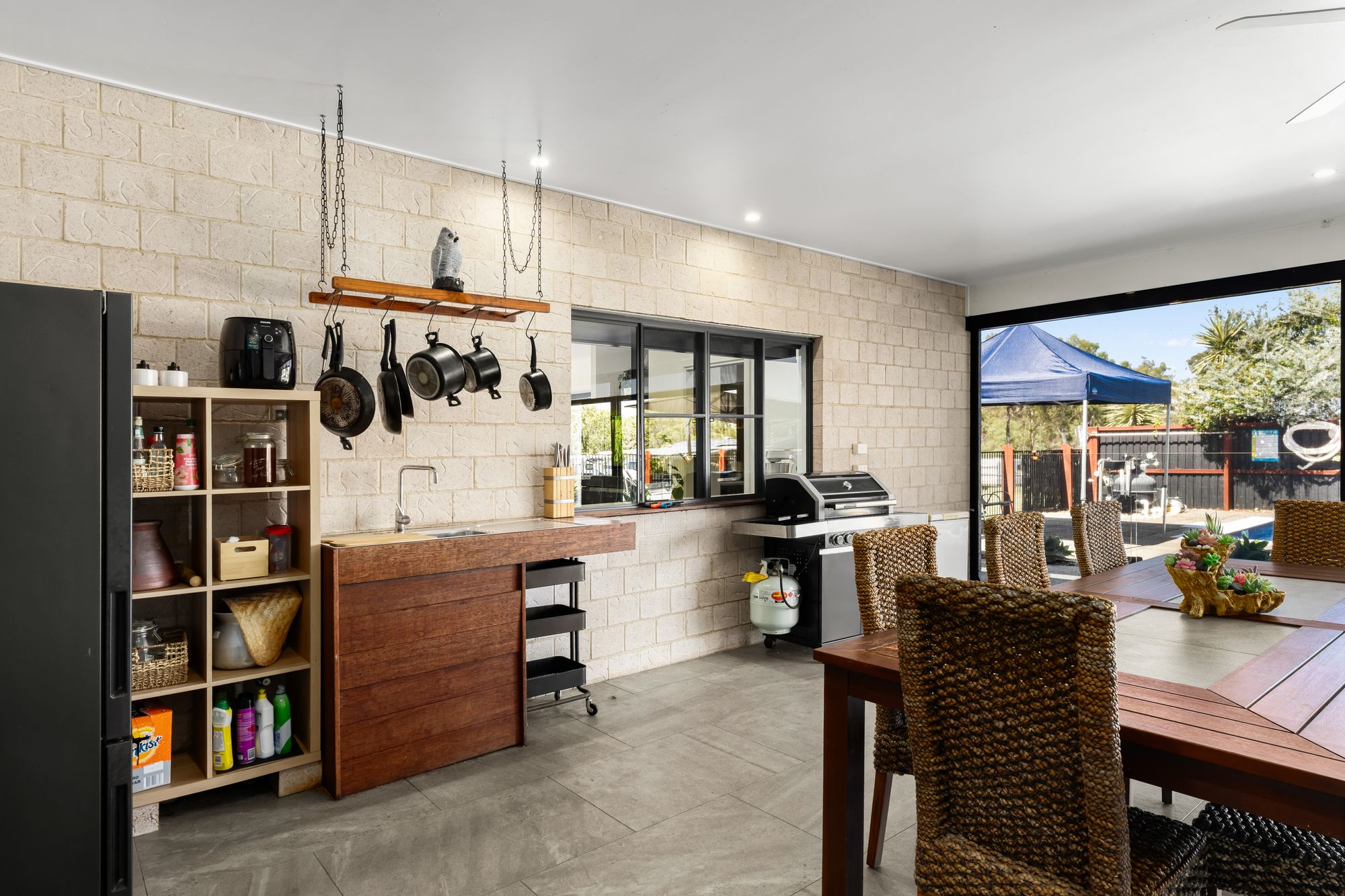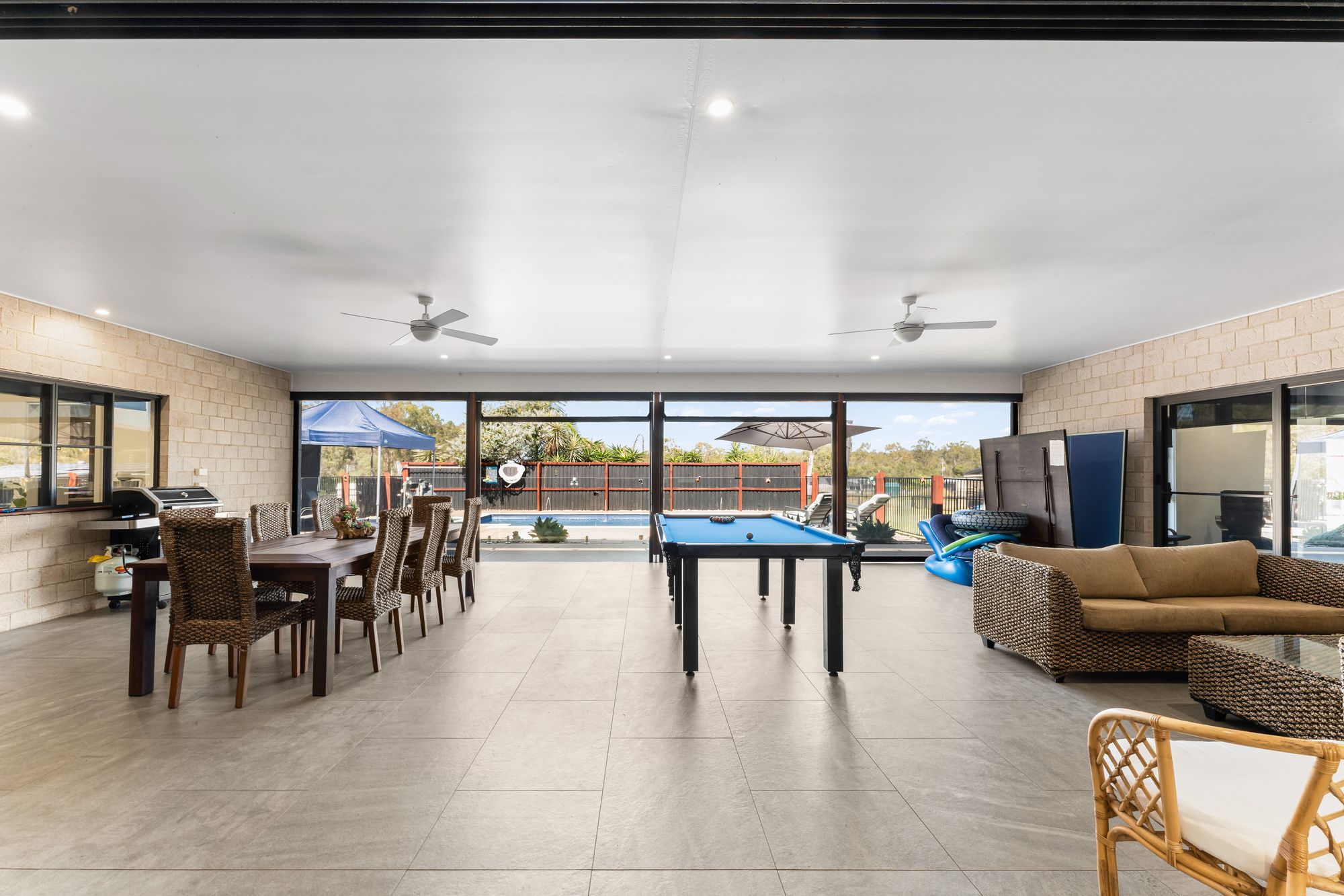 • Large covered alfresco with roller blinds, ceiling fans, LED lighting and power points