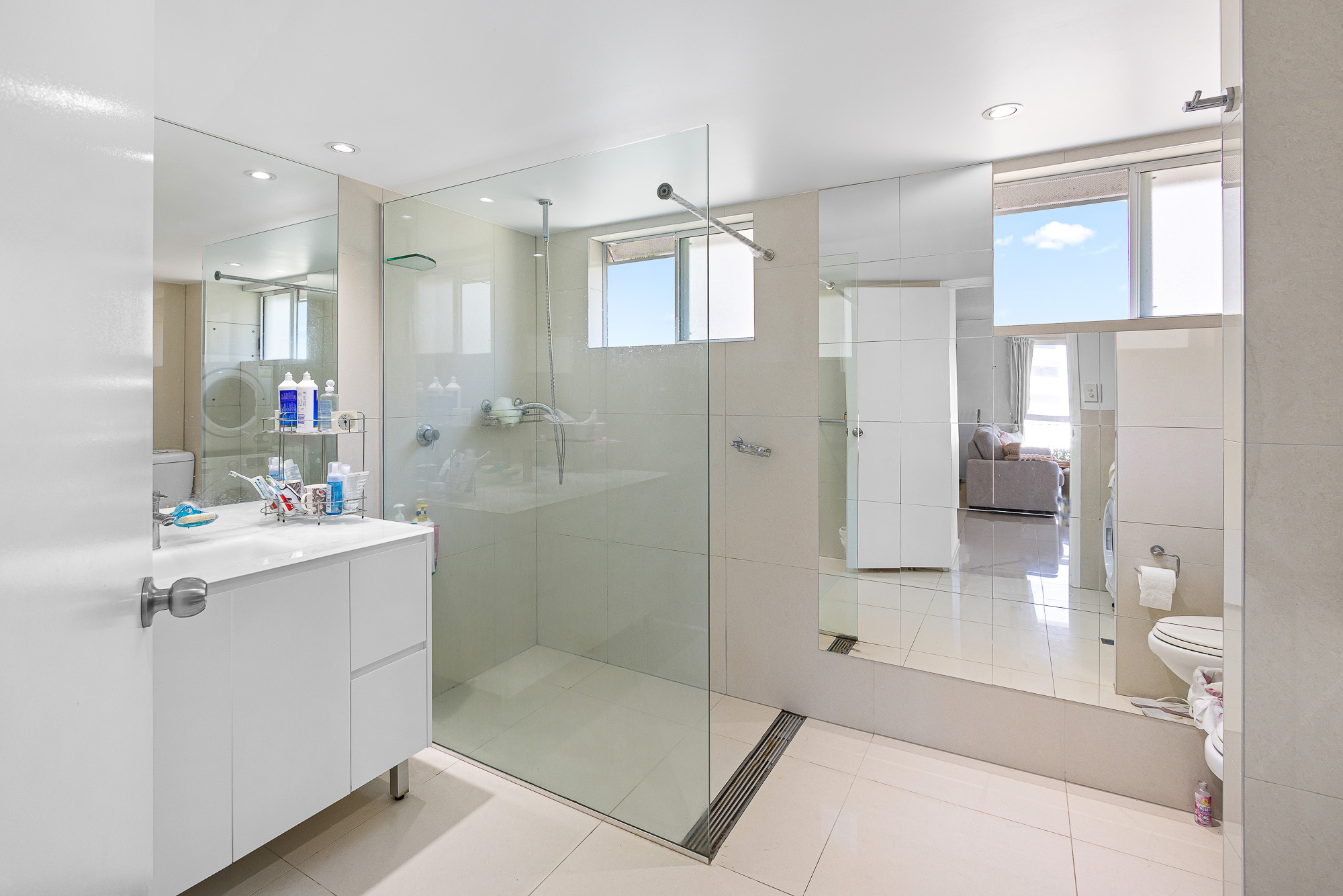 – A beautiful modern bathroom with floor to ceiling tiles and a huge shower