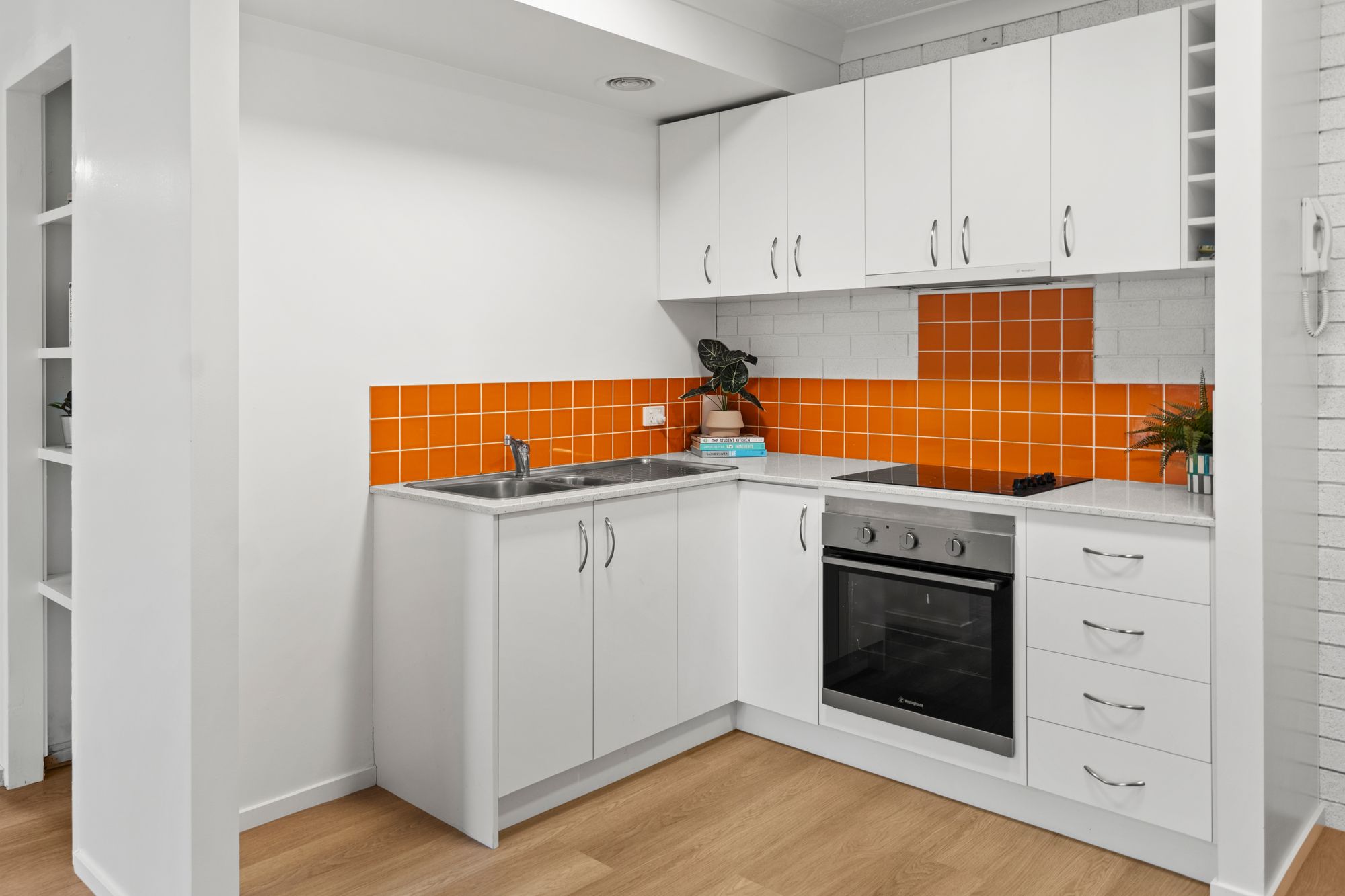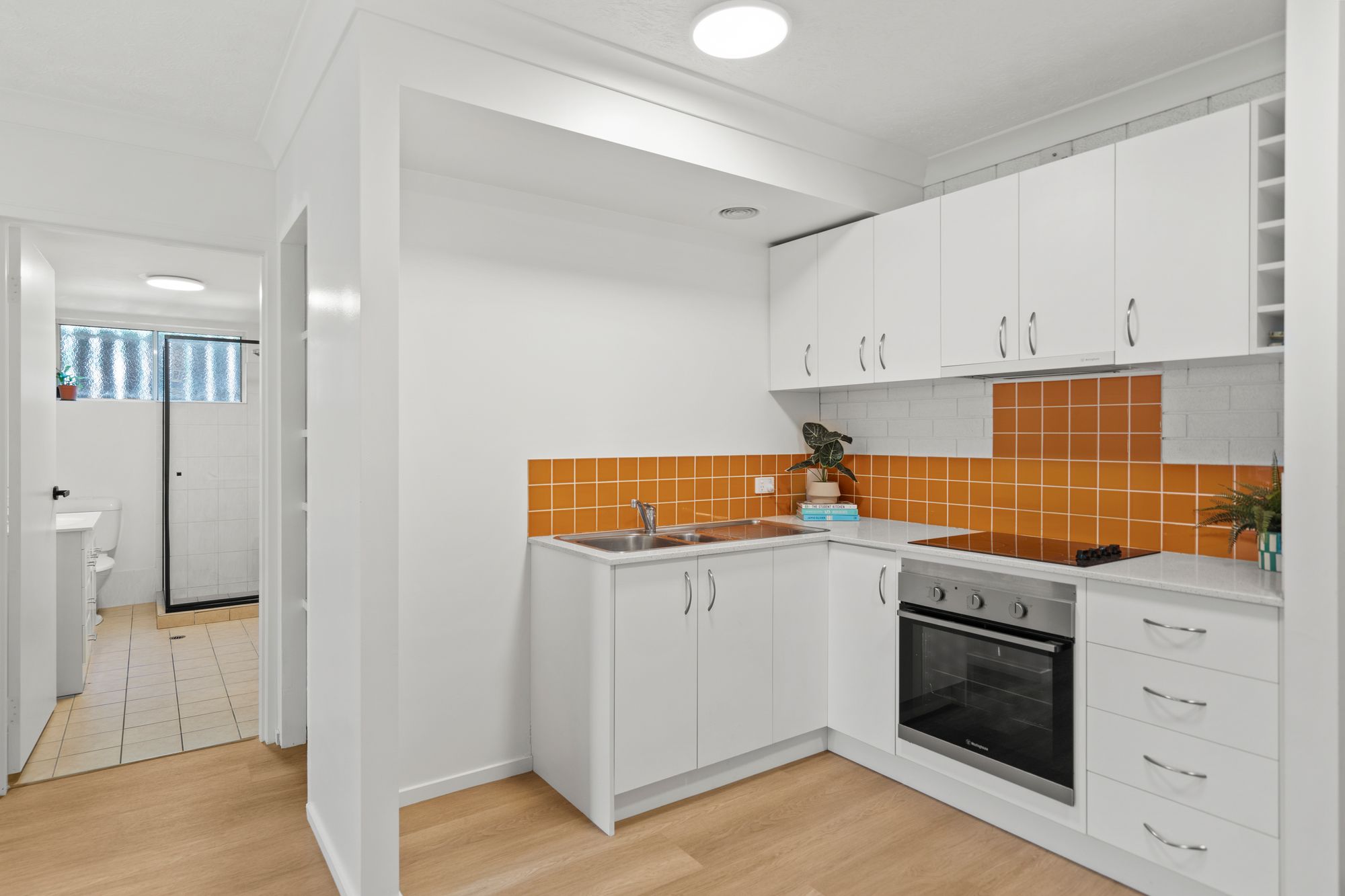 • The kitchen has an electric cooktop, oven and ample storage