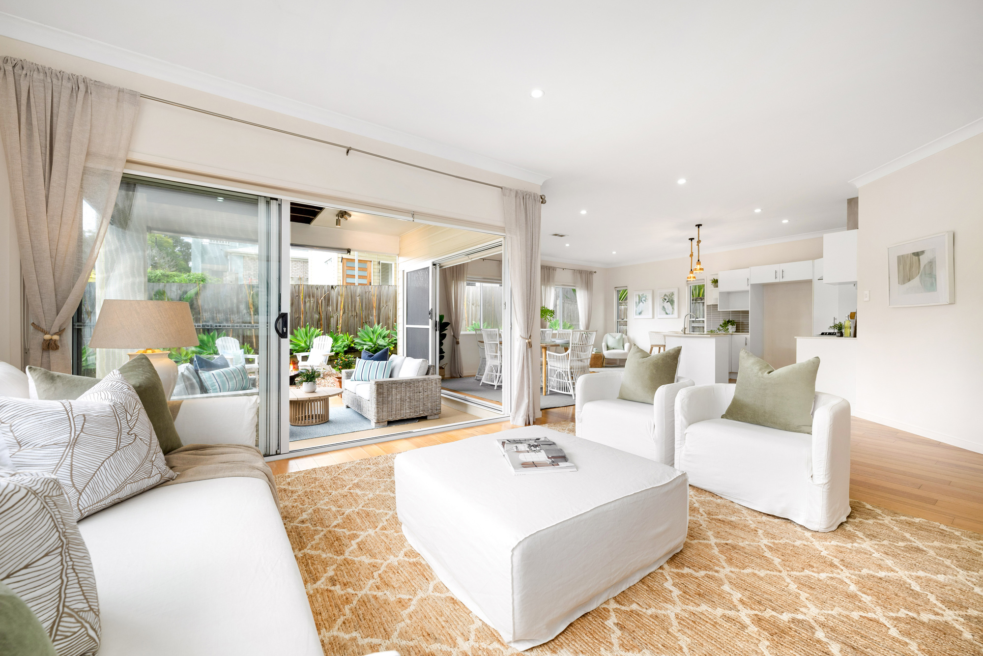 The home opens to a bright, light-filled living and dining area on the ground level, perfect for gathering with friends and loved ones
